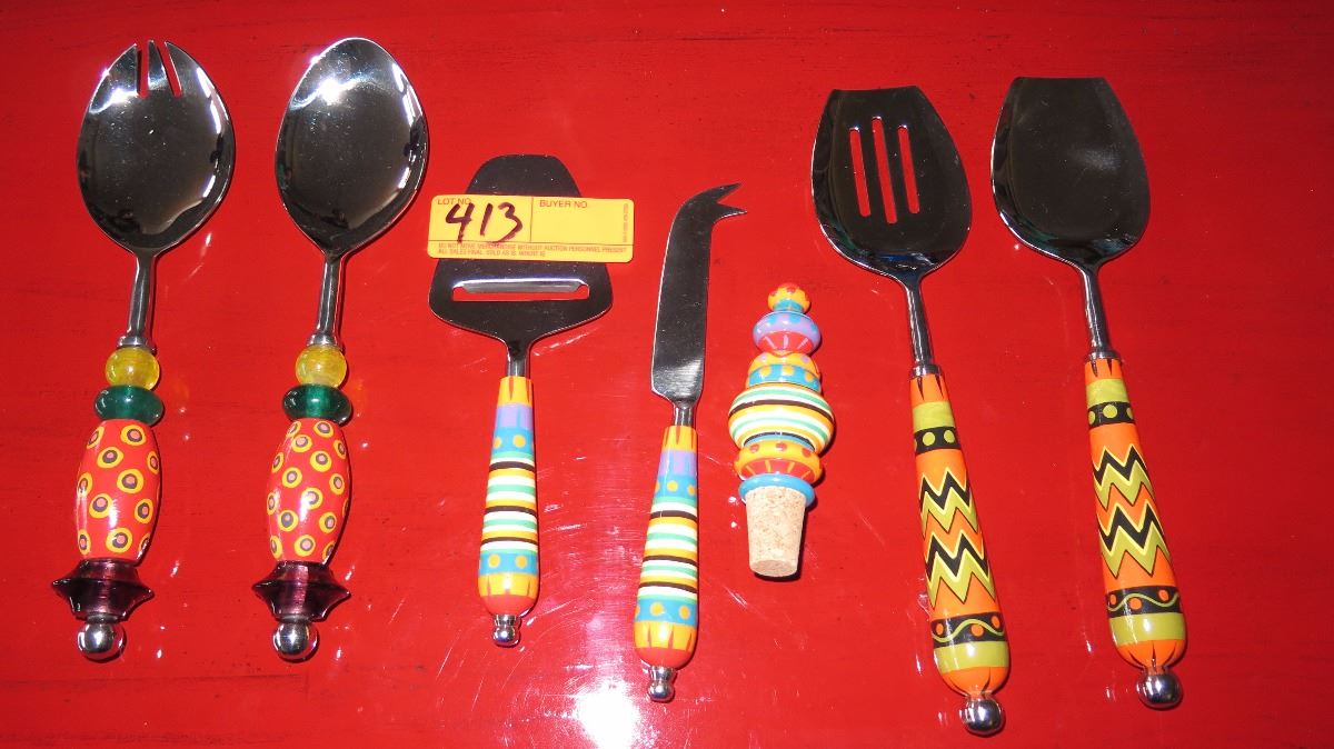 Whimsical Colorful 7-Pc Serving Set: Forks, Spoons, Cheese Shaver, Knife