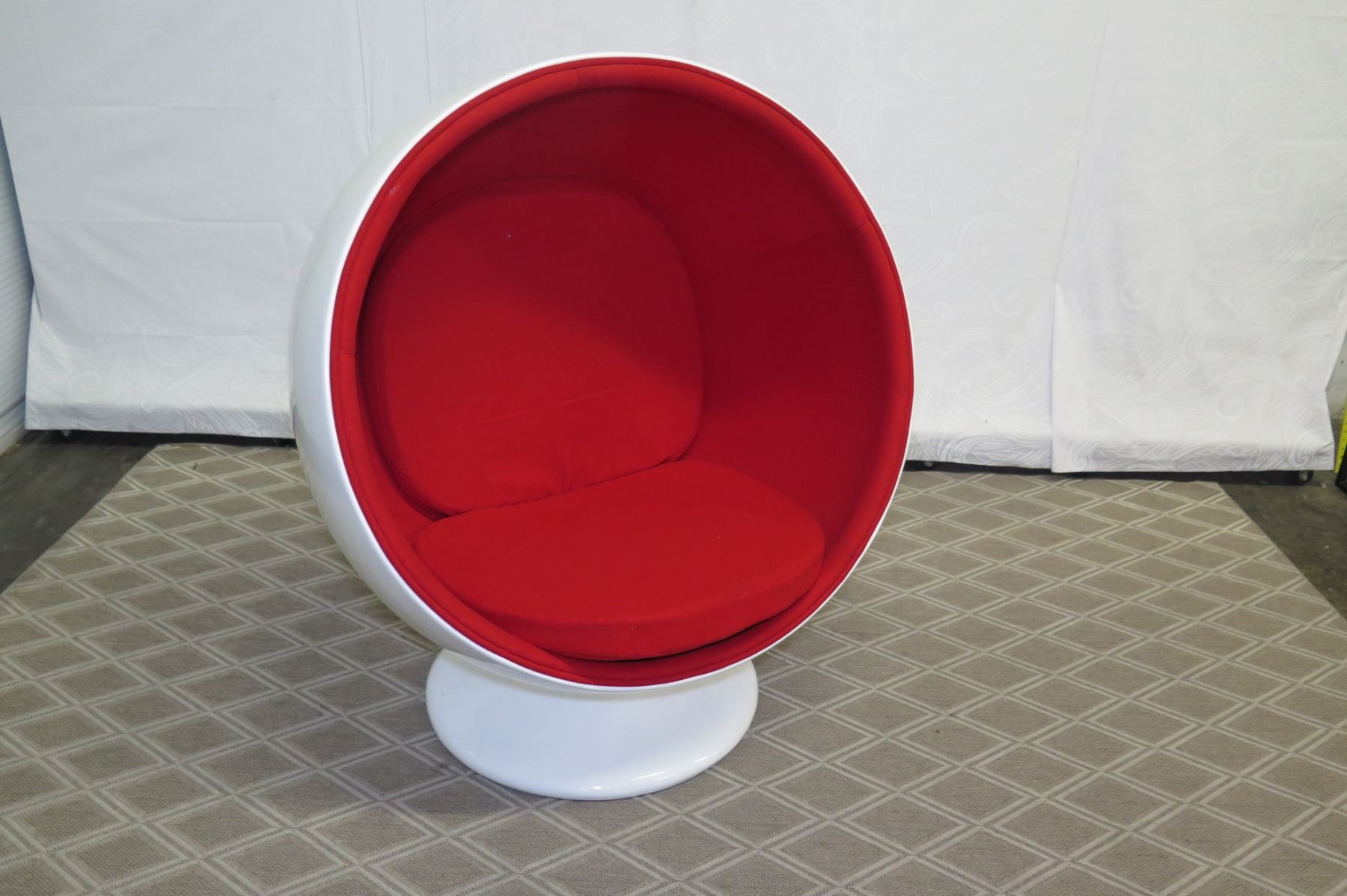 White Ball Pod Chair on Pedestal Base w/ Red Upholstery, Approx. 39" Dia, 51" High