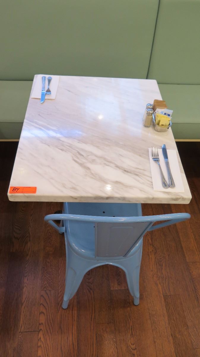 White Solid Marble Table w/Wrought Iron Base + 1 Blue Chair