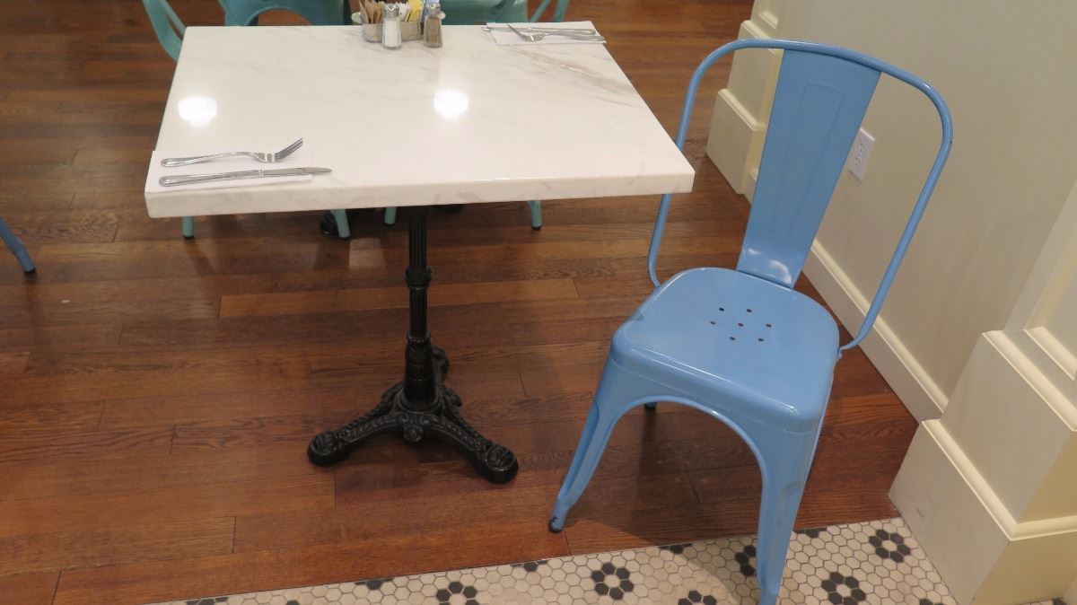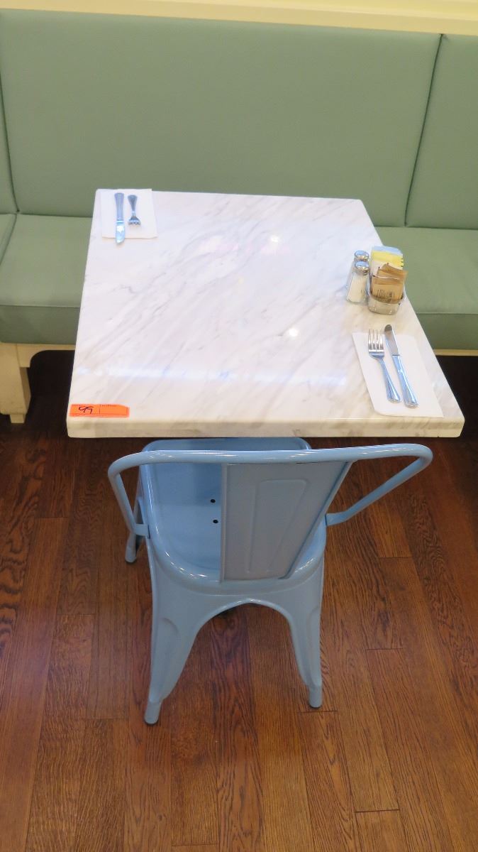 White Solid Marble Table w/Wrought Iron Base + 1 Blue Chair