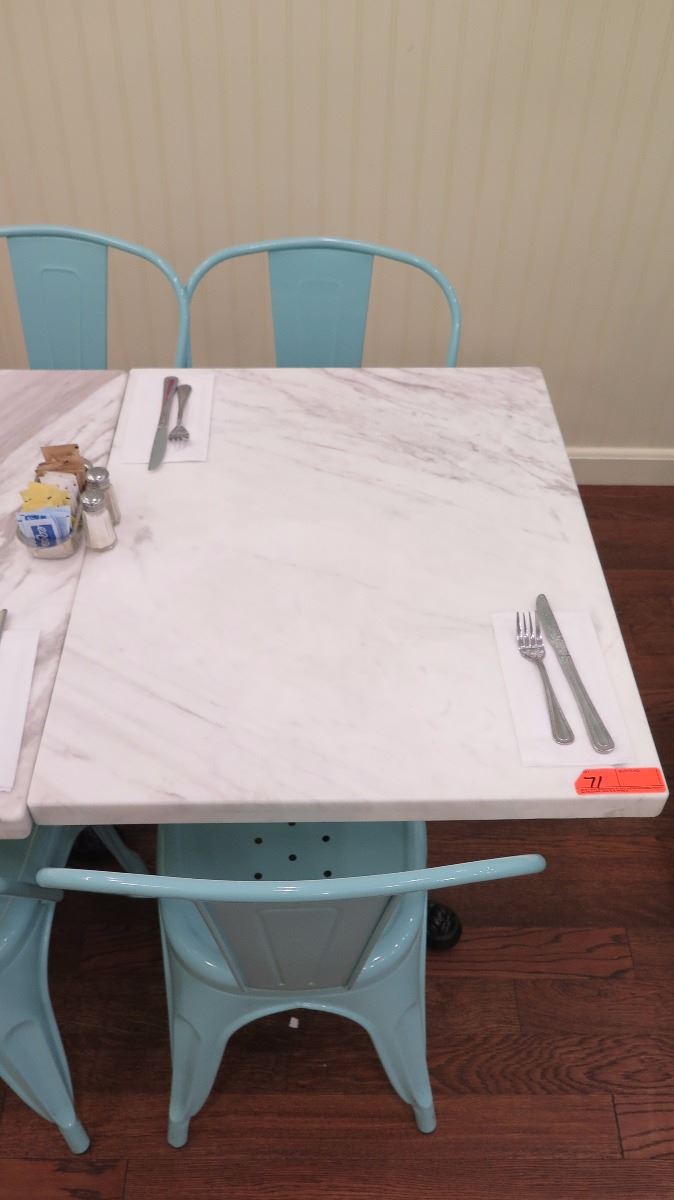 White Solid Marble Table w/Wrought Iron Base + 2 Aqua Chairs