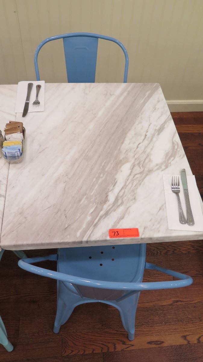 White Solid Marble Table w/Wrought Iron Base + 2 Blue Chairs