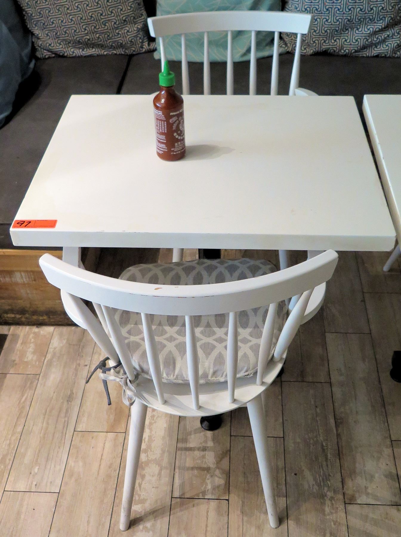 White Table w/ Metal Base (30x30) & 2 Wooden Chairs w/ Seat Cushions