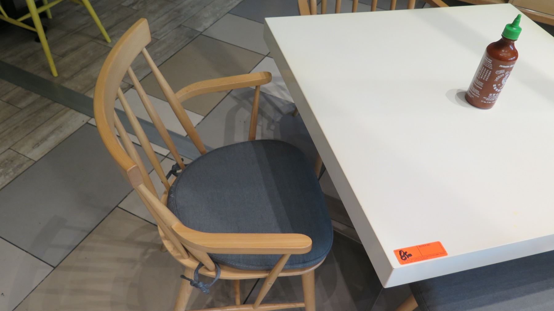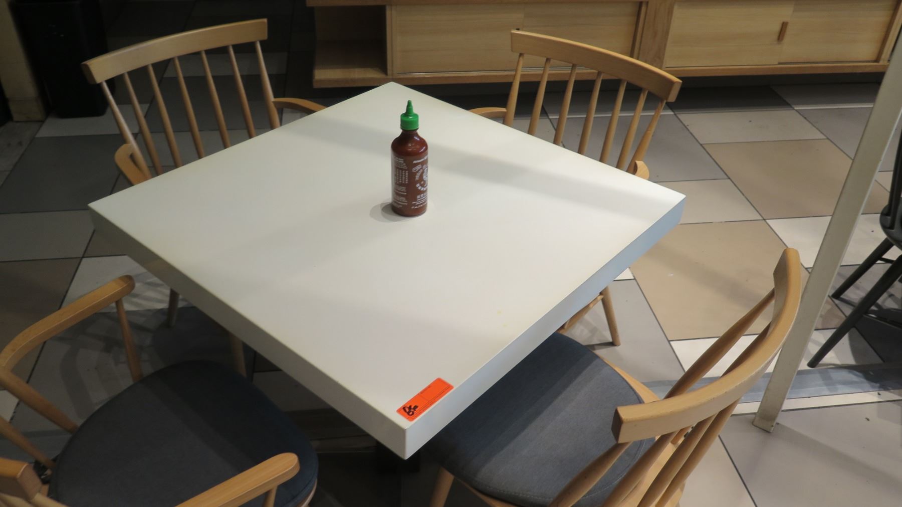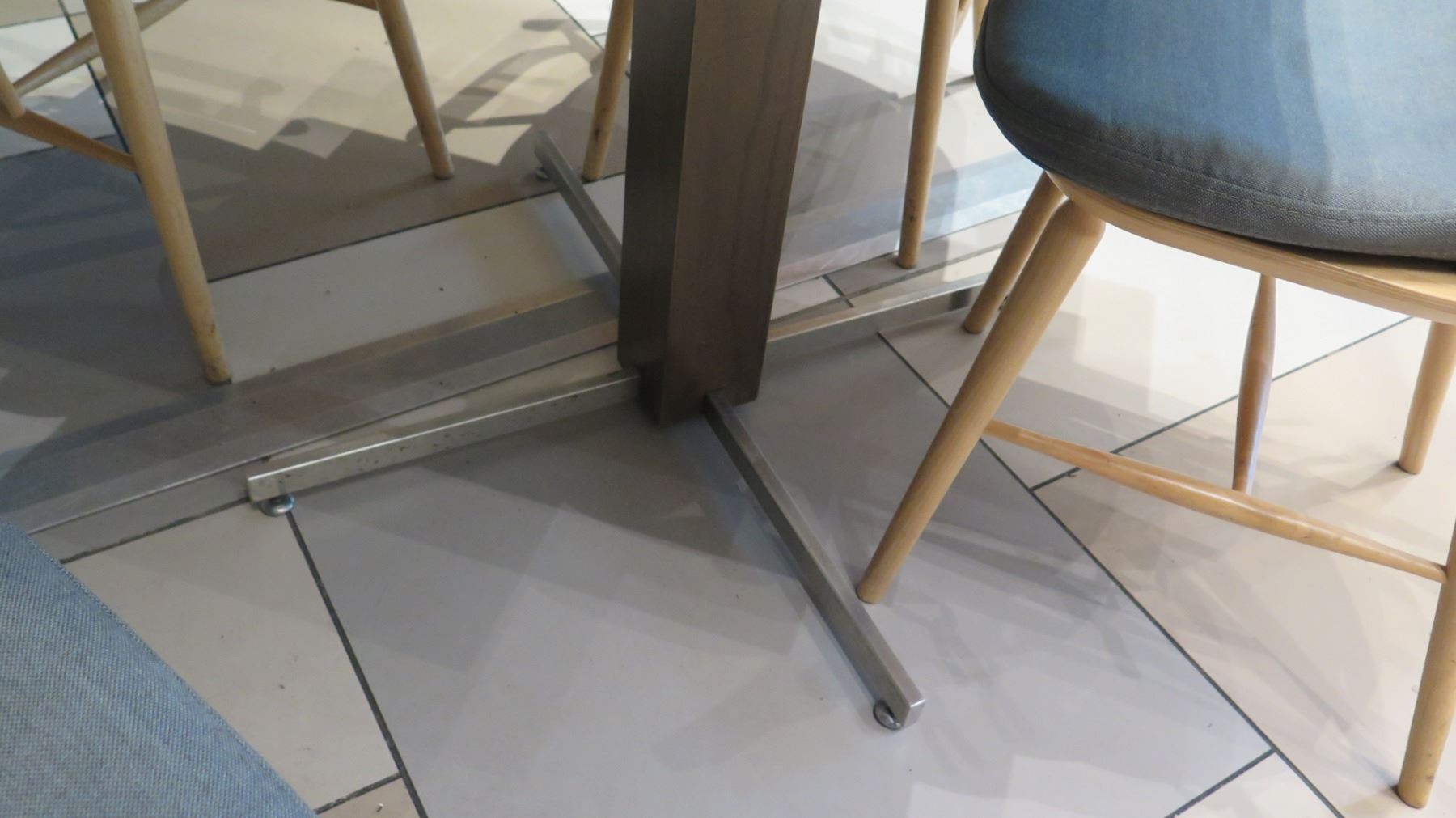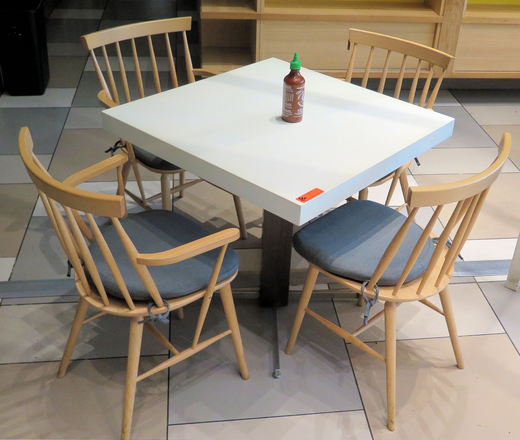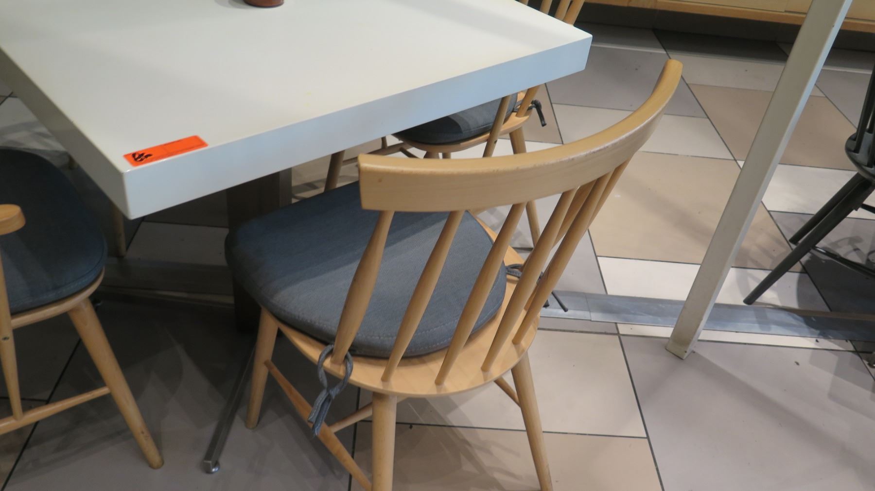White Table w/ Metal Base (31x31) & 4 Wooden Chairs w/ Seat Cushions