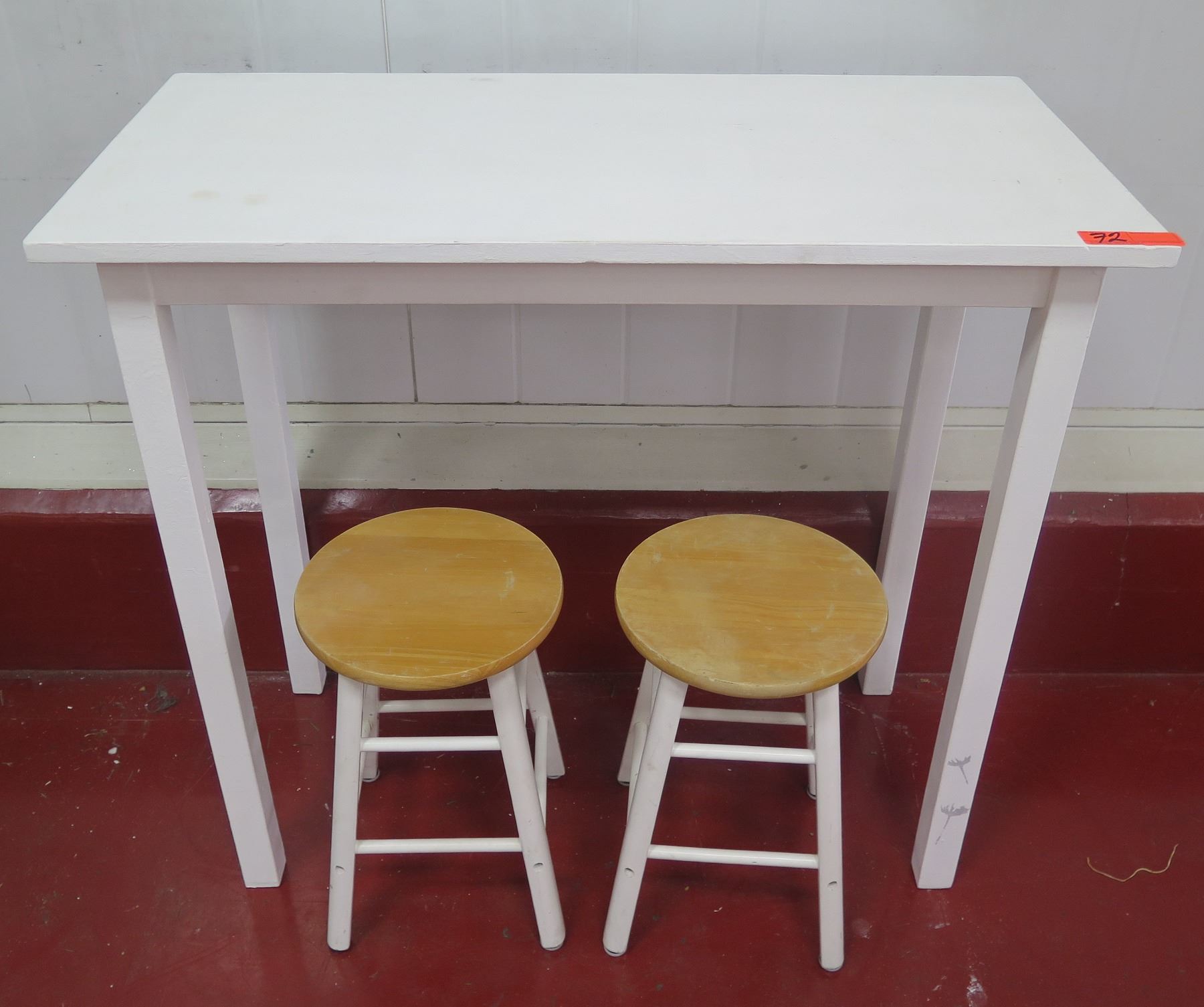 White Wooden Table 39"x19"x 36"H w/ 2 Round Stools 12" Diameter x 20"H