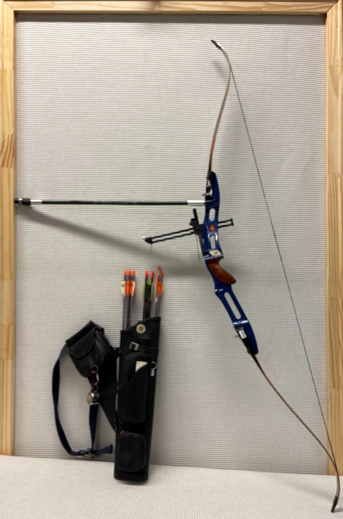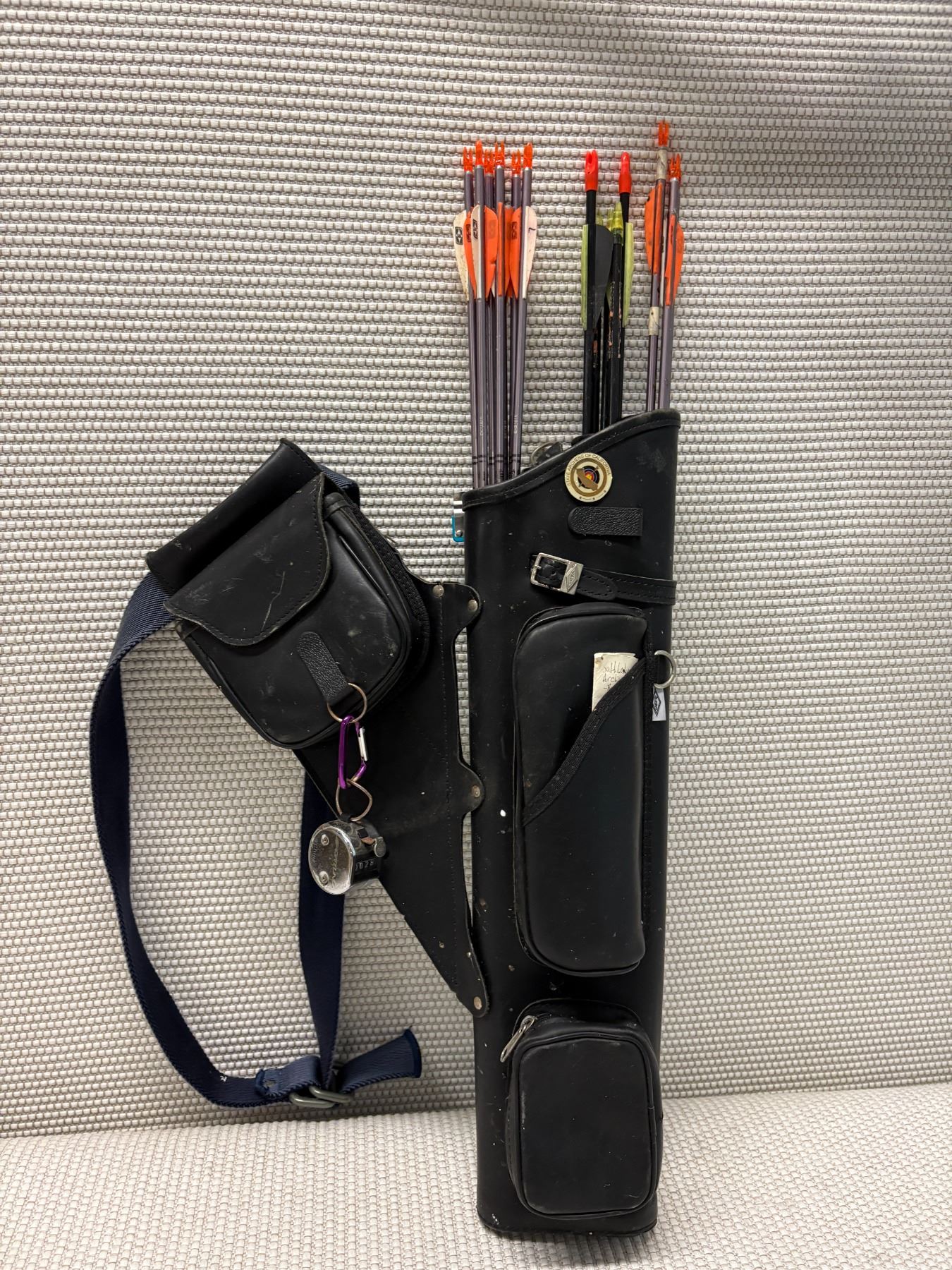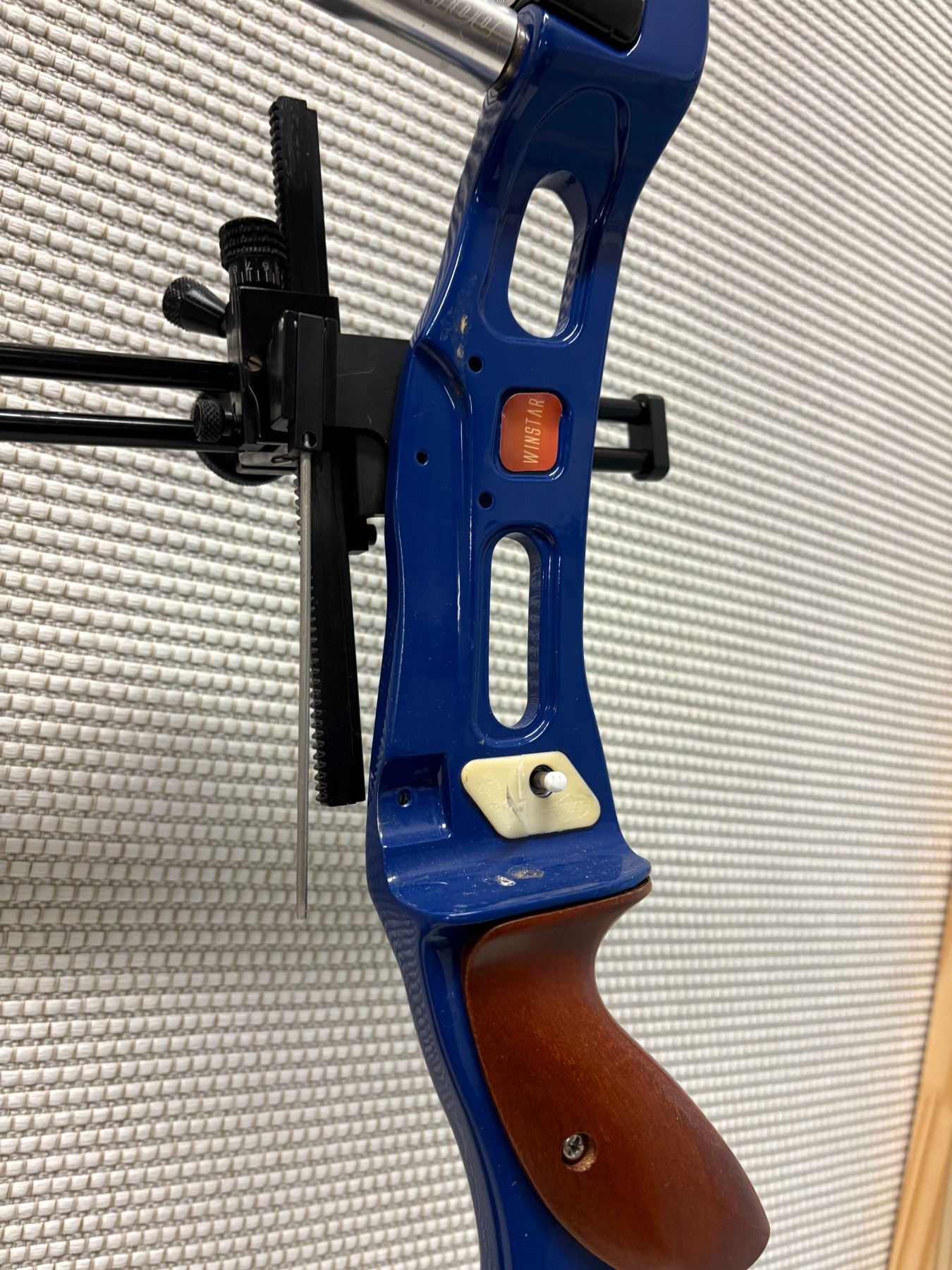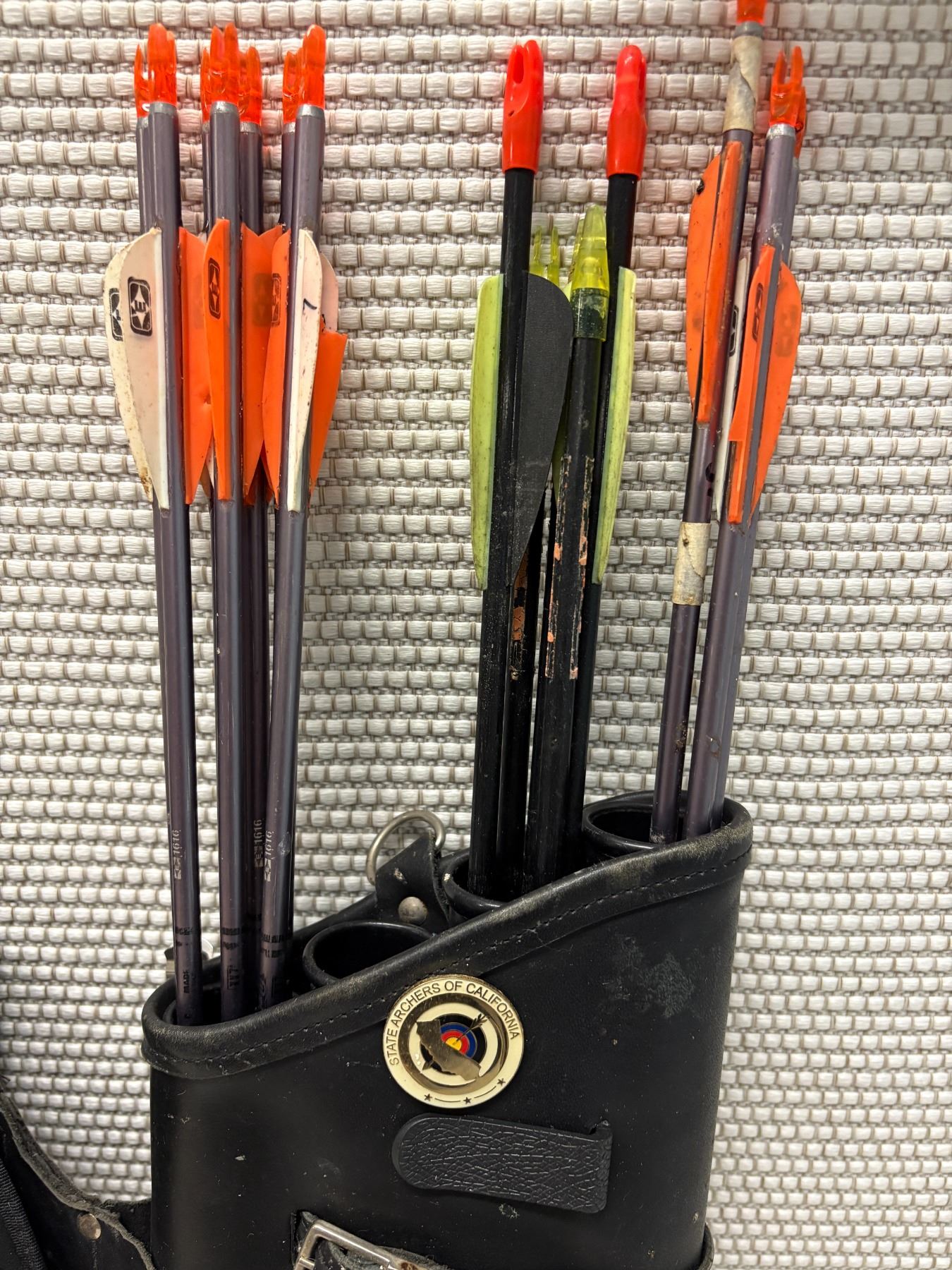 Seller reports the riser is a Winstar 25" right hand with KAP limbs. It is equipped with a button, clicker, hand made Flemish twist string, stabilizer with doinker, and a rare Arten sight. This bow is smooth and ready to take to the range. A leather quiver and platinum Easton arrows complete the set with a right handed finger tab.