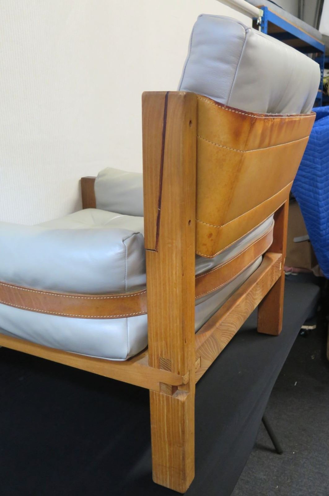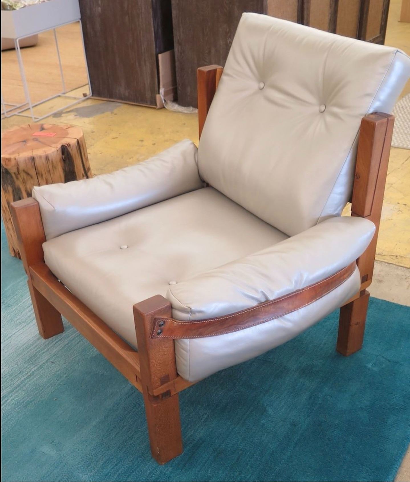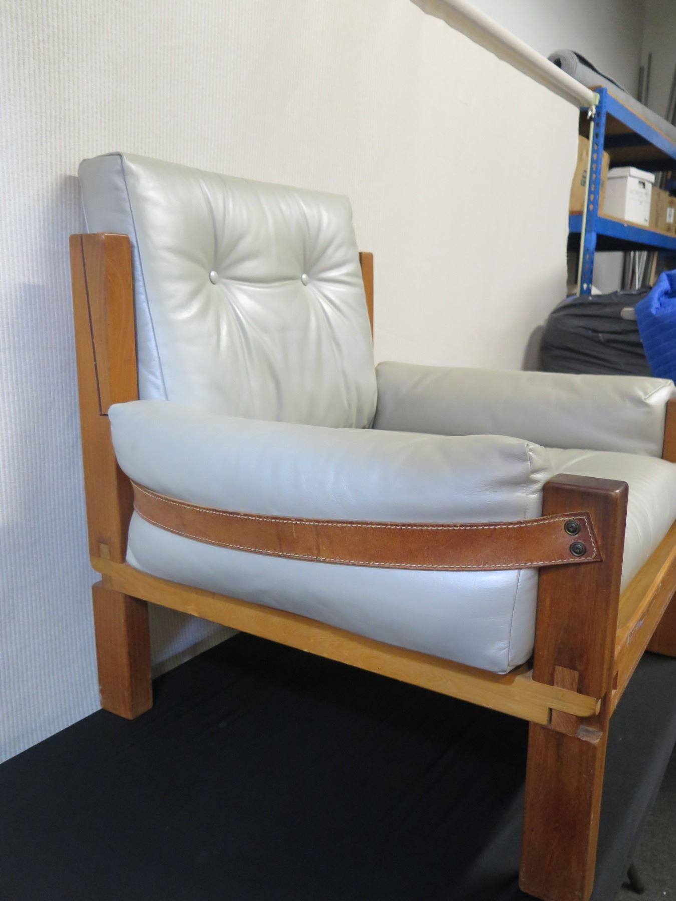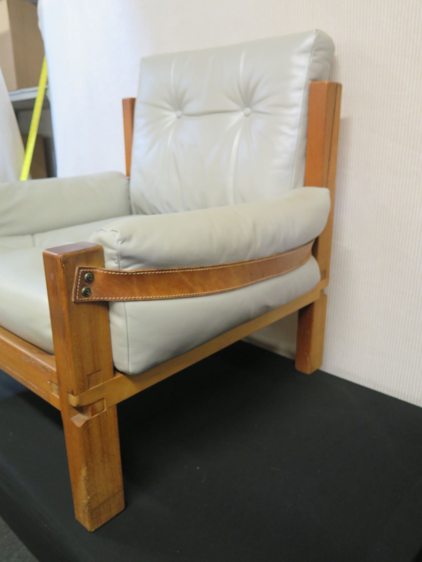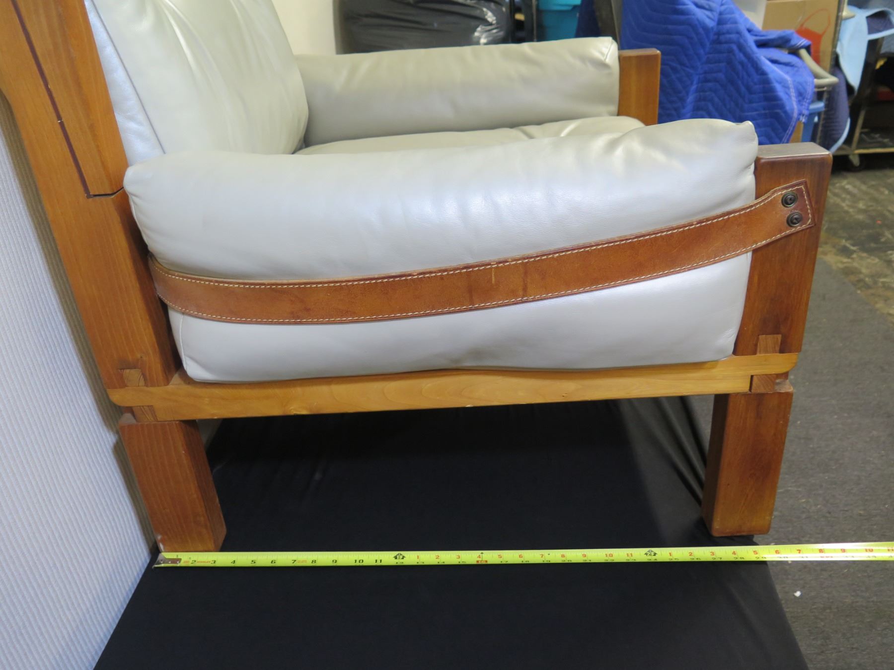 Wood-Framed Natural Leather Armchair, Pirelli Ltd. (Great Britain) 30" x 29" x 34"H. The last picture is of this same chair when it was at another location at a different time.