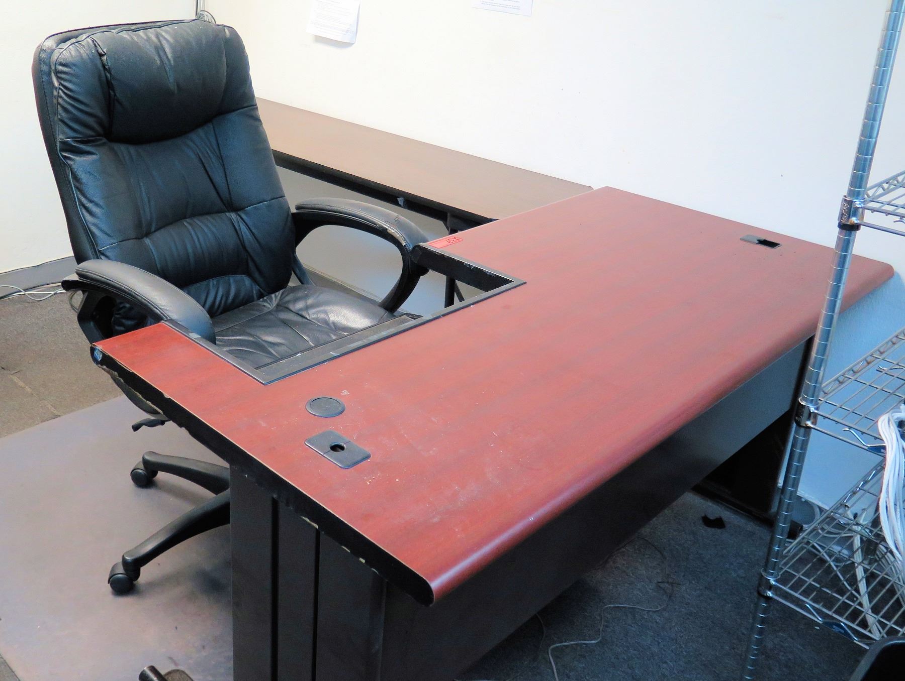 Wood "L" Shaped Desk w/ Keyboard Shelf & Executive Rolling Chair