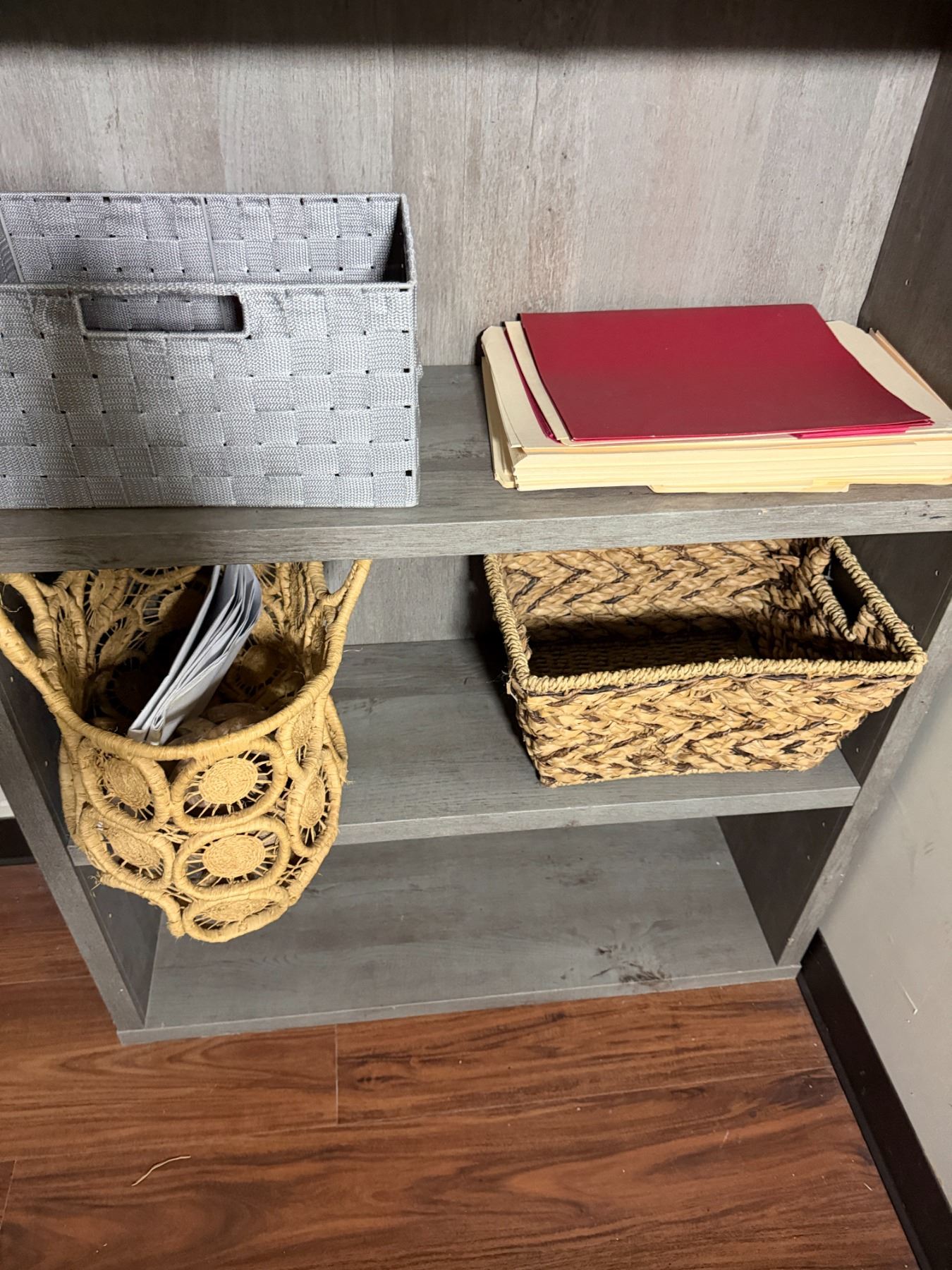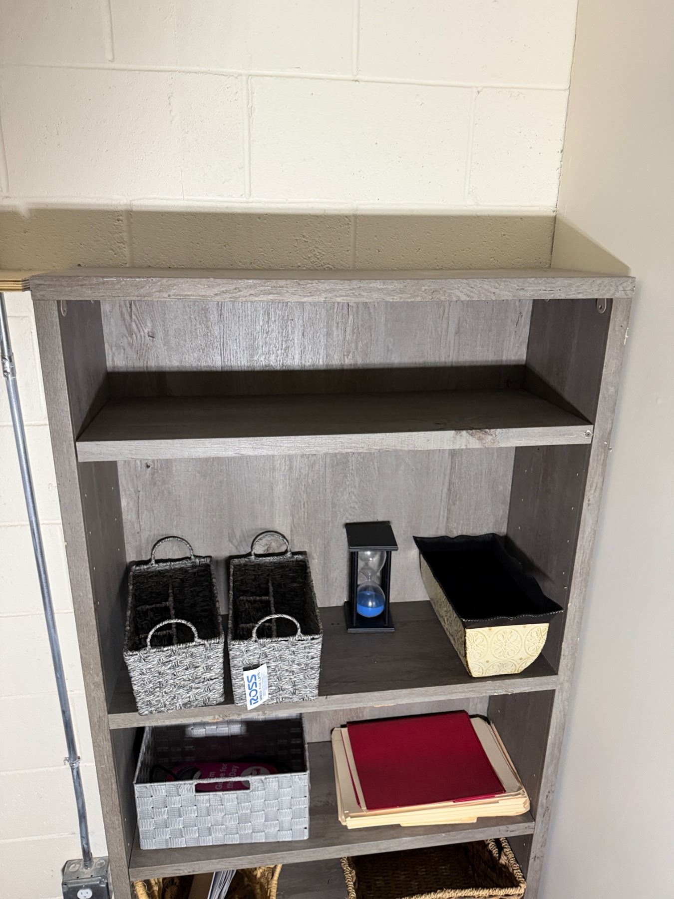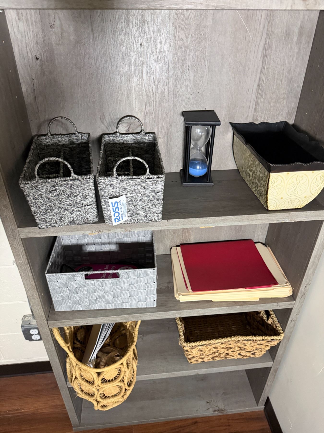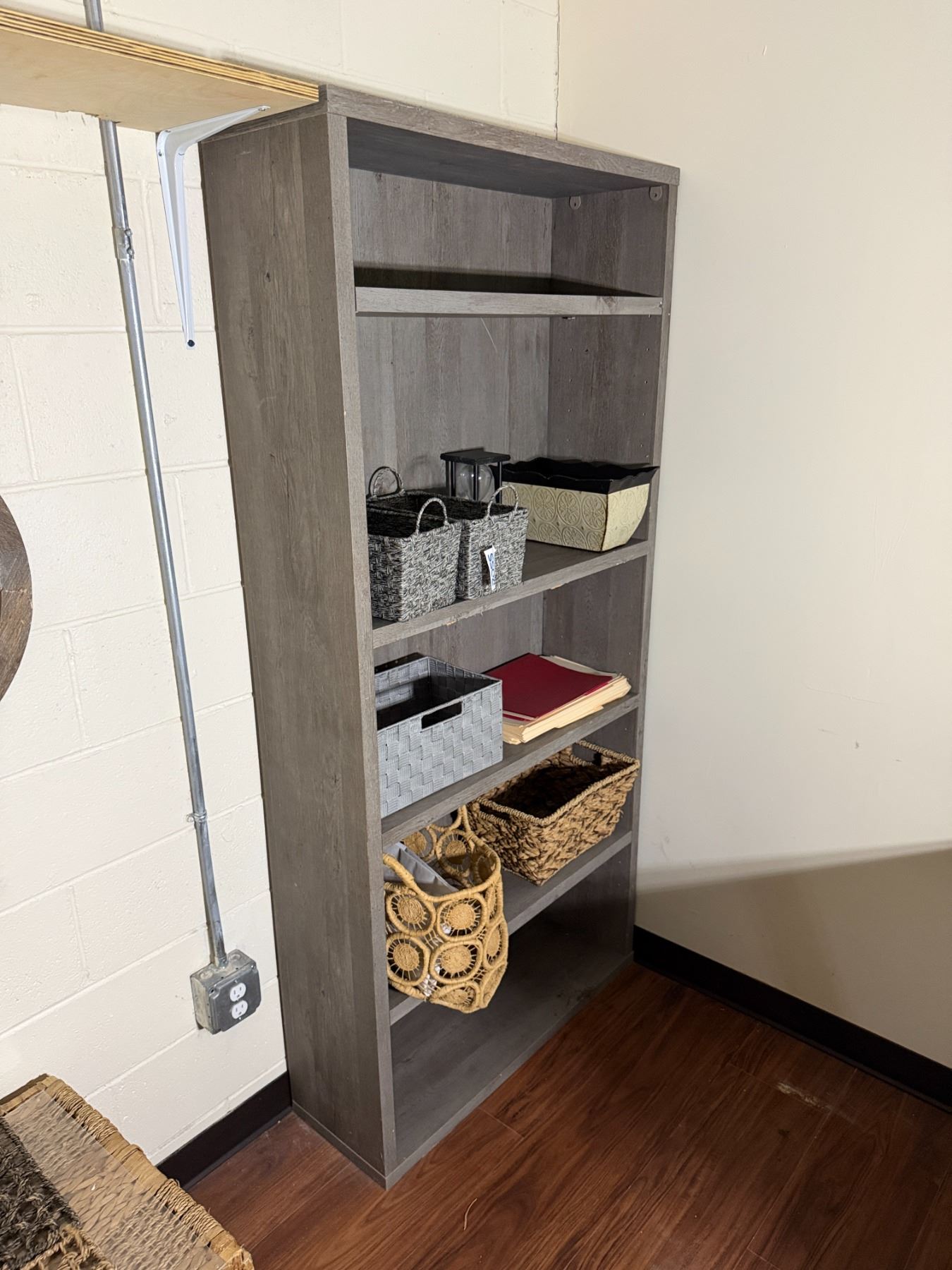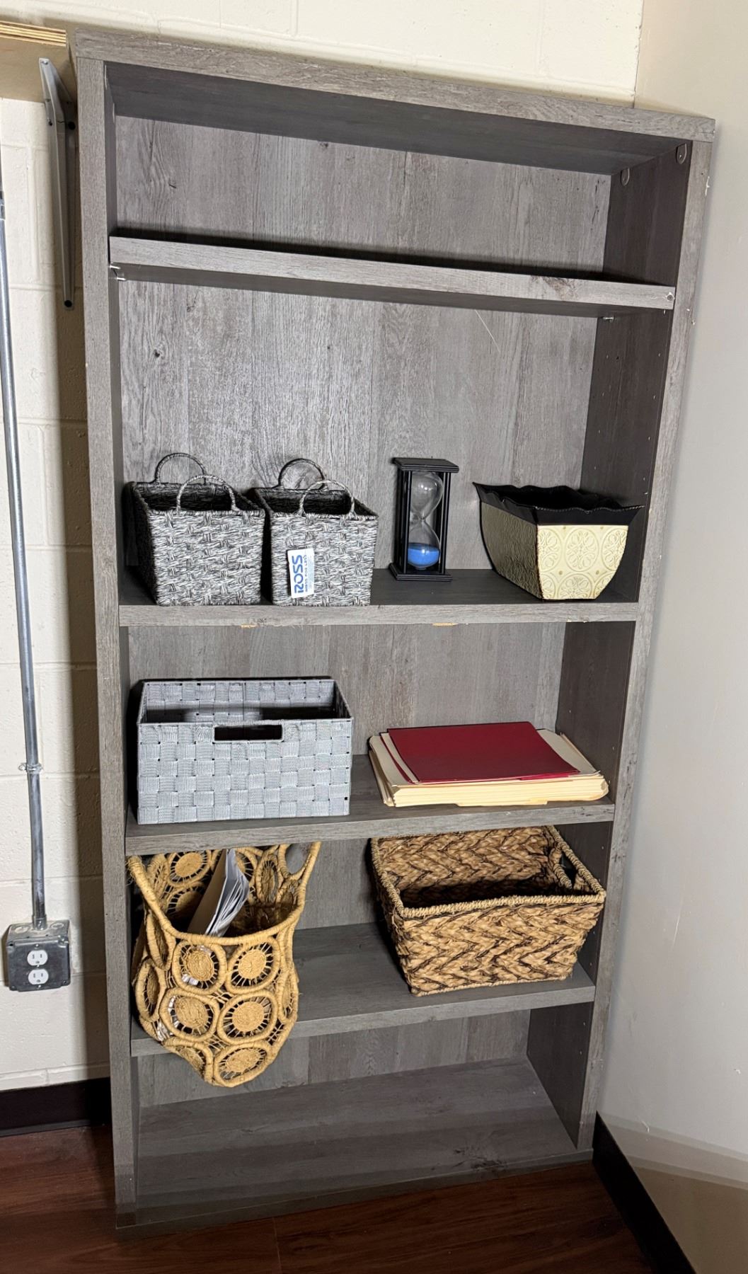 Wooden 5-Tier Shelving Unit & Contents: Baskets, Hourglass, etc 35" x 11" x 73"