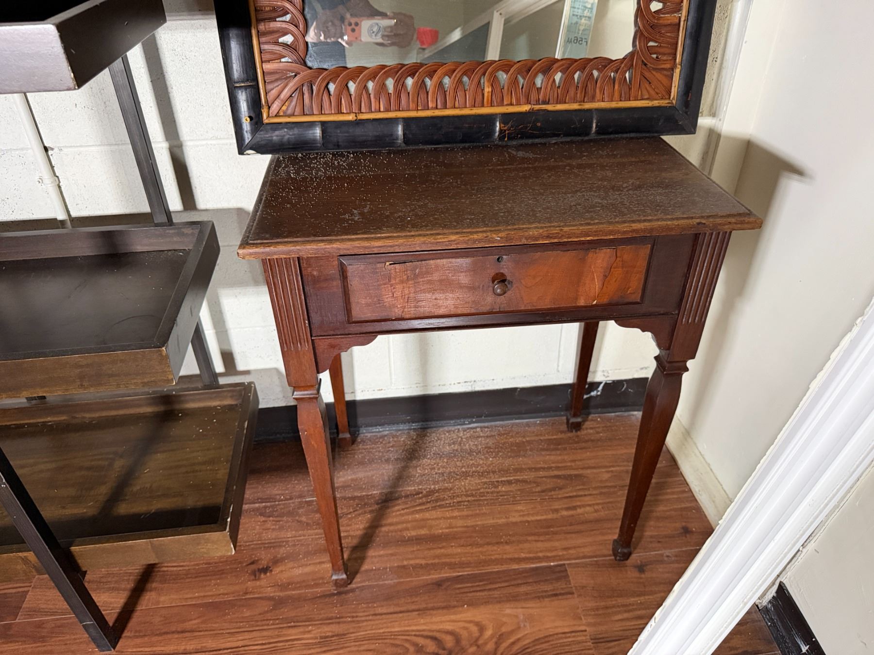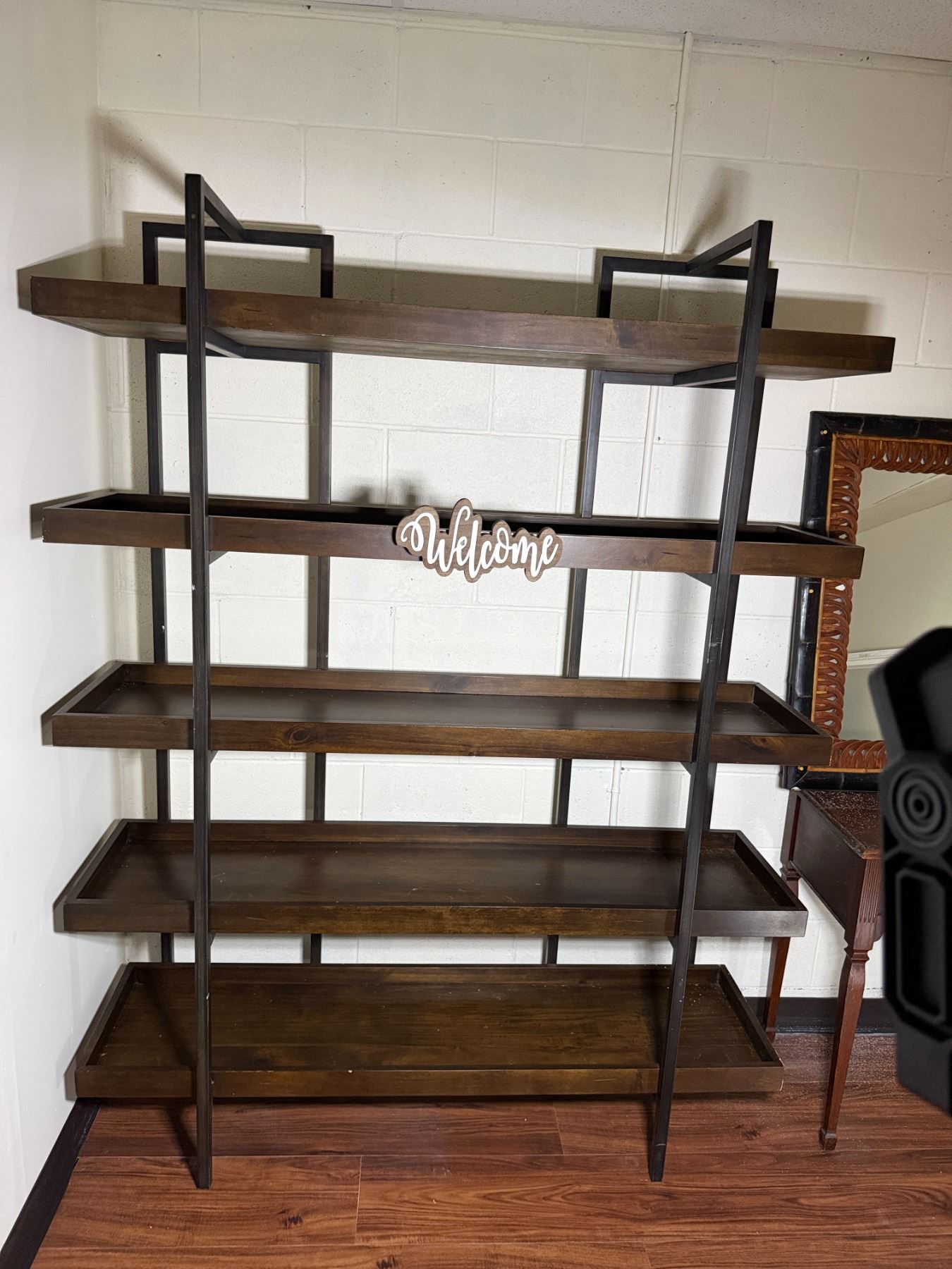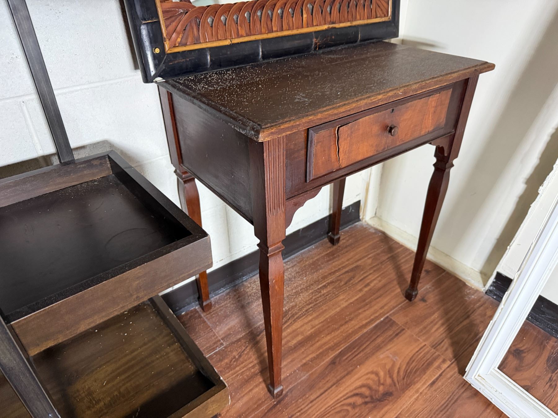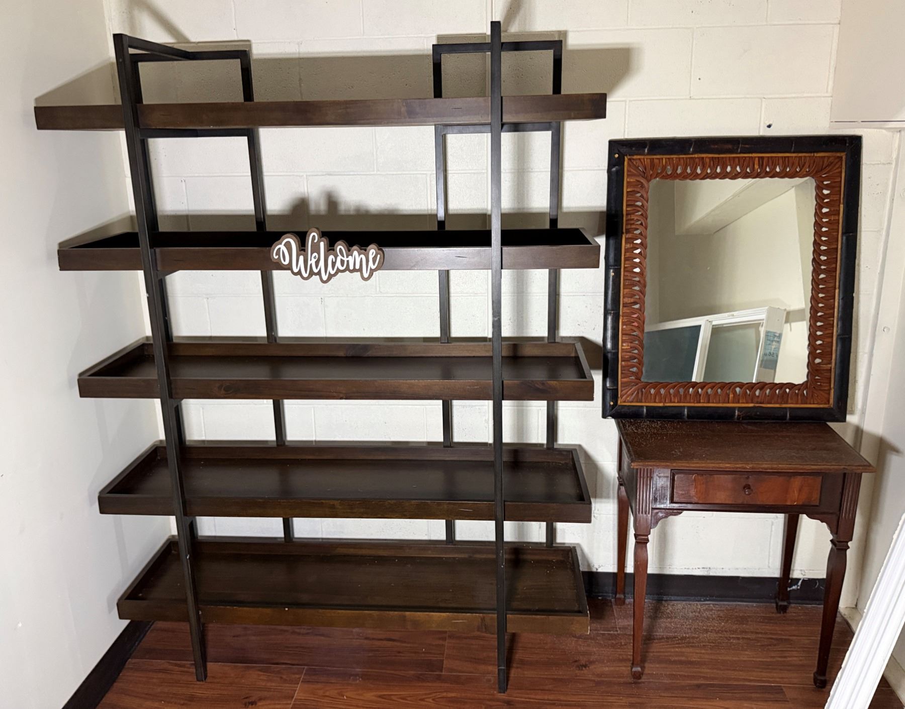 Wooden 5-Tier Shelving Unit, Table w/ Drawer (cracked) & Framed Wall Mirror, Misc Sizes