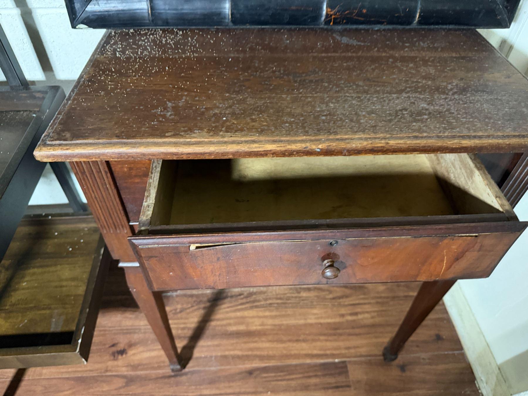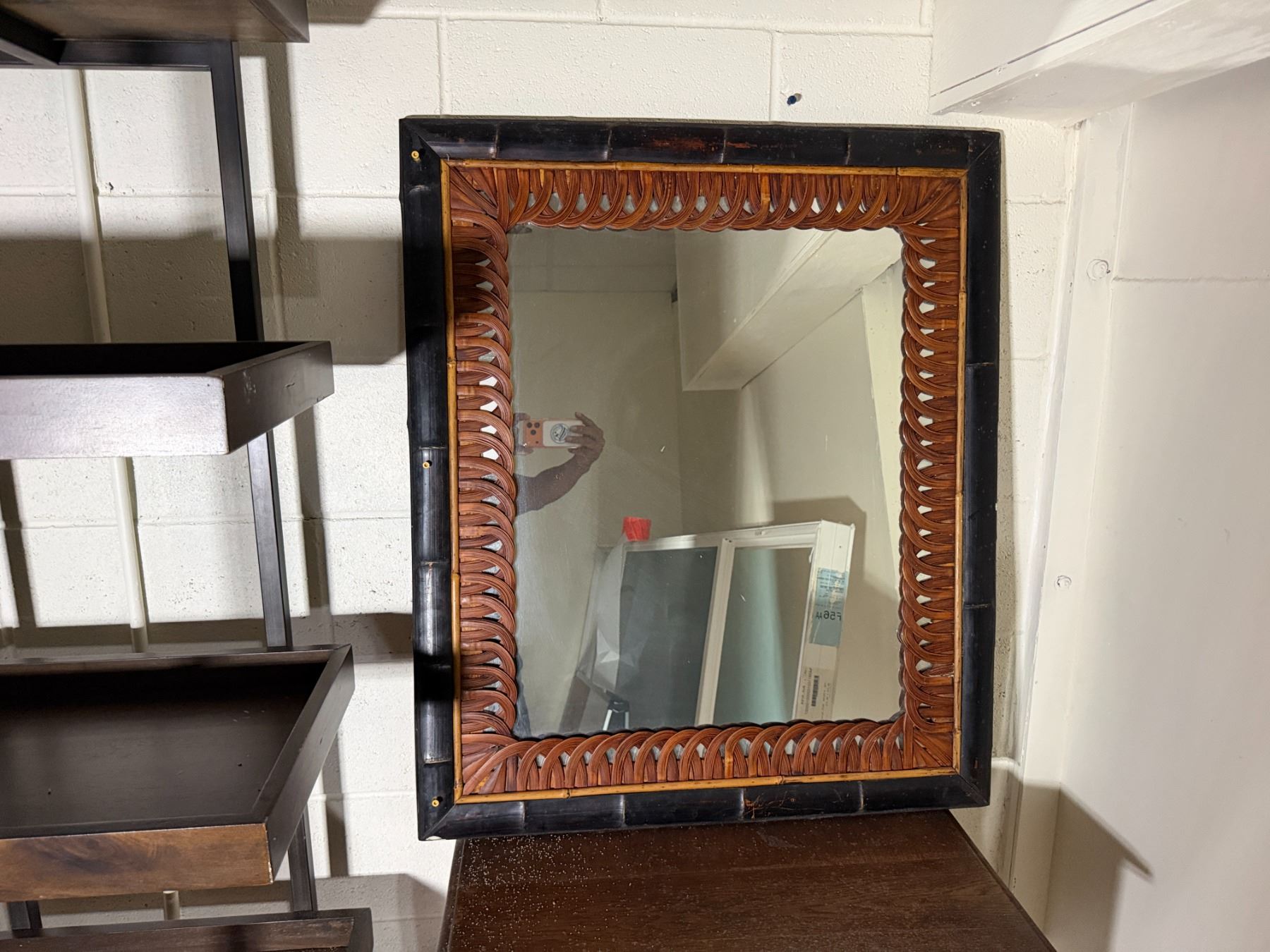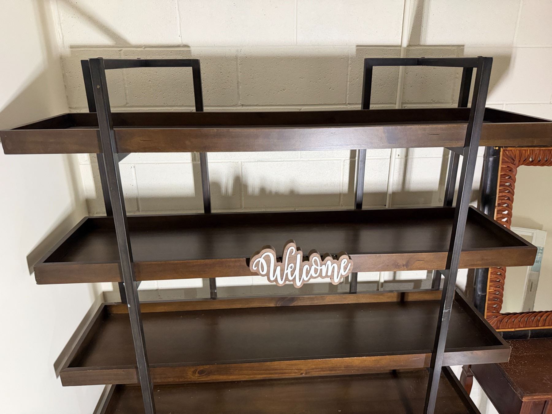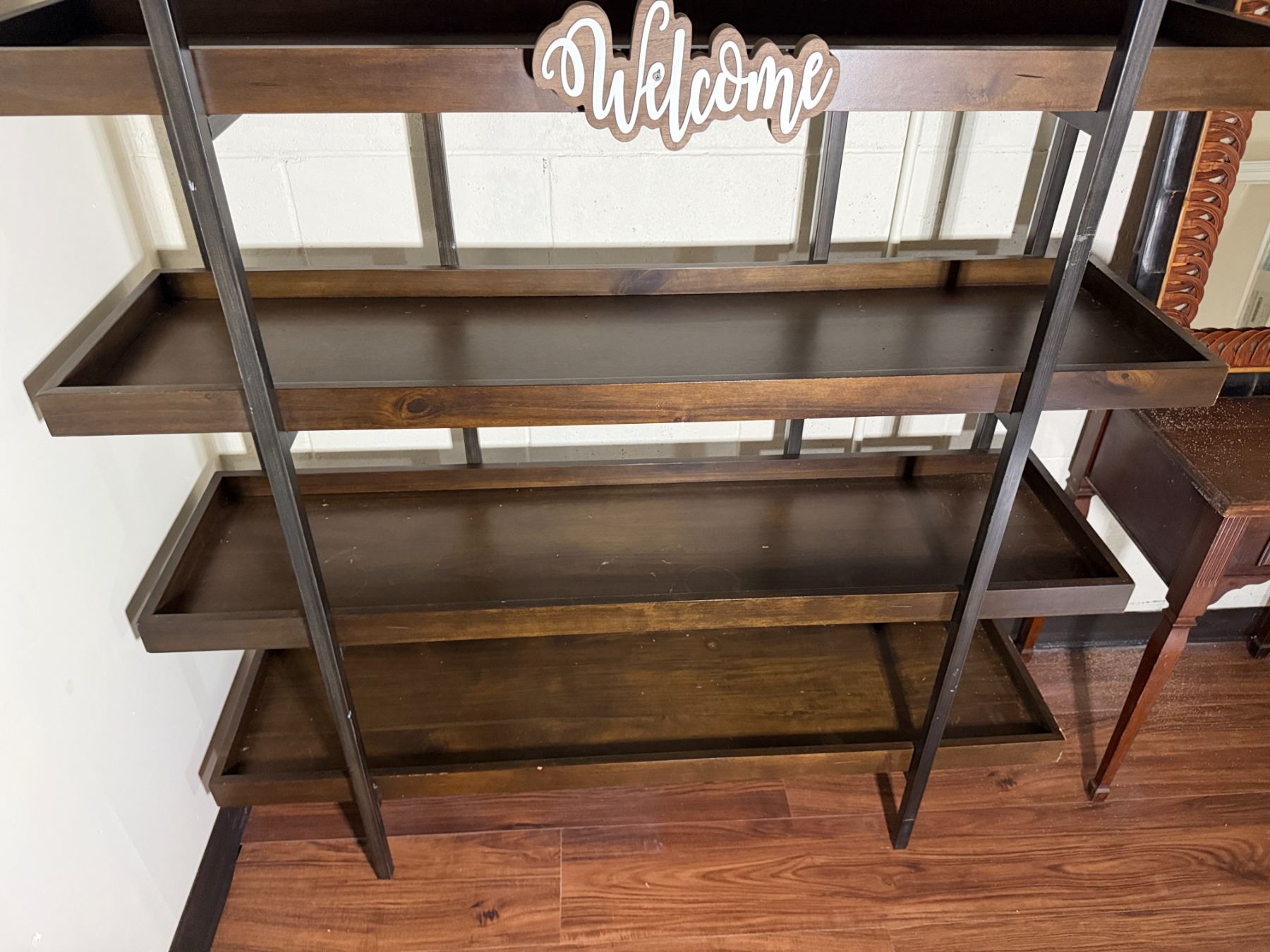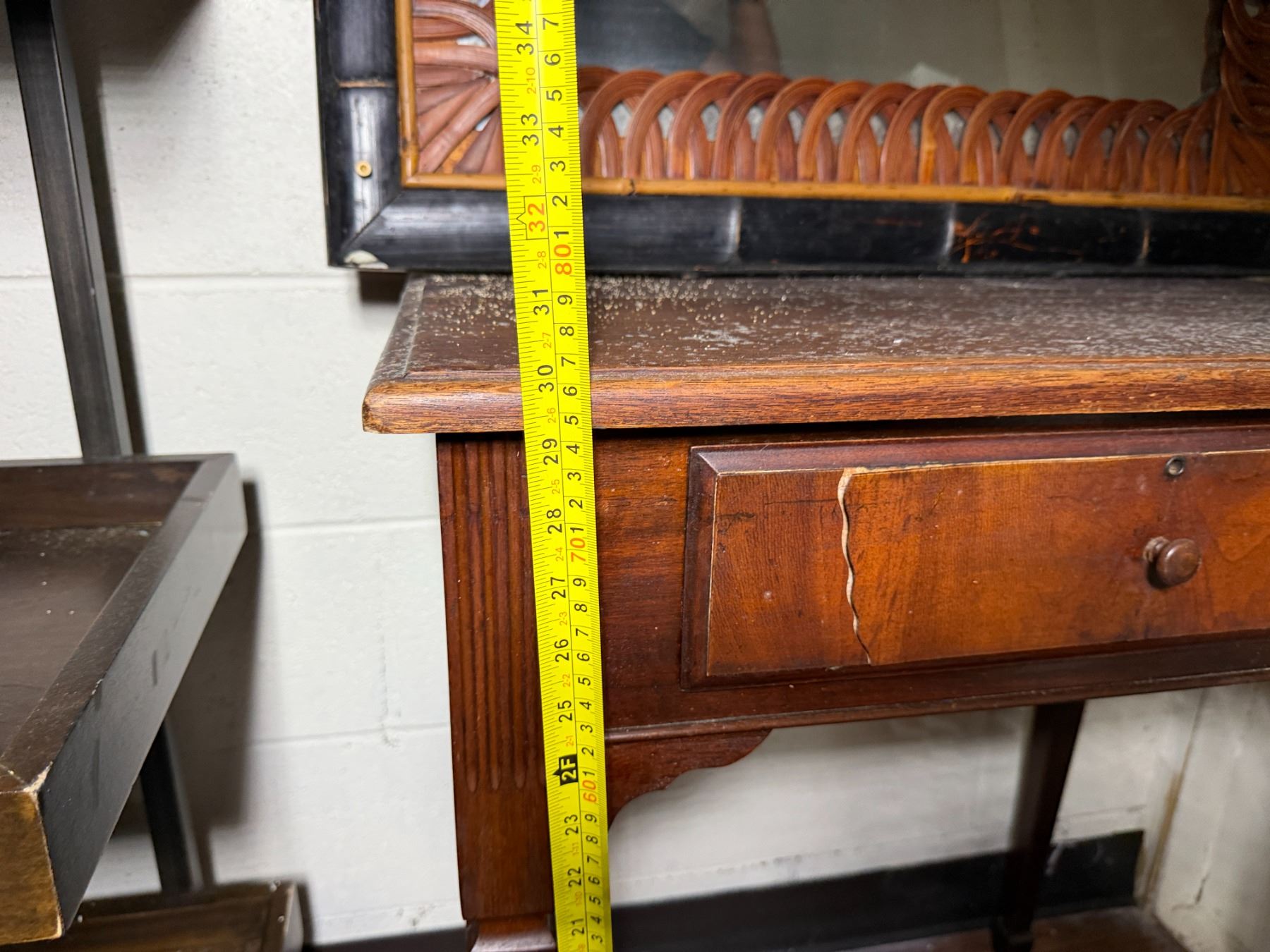 Wooden 5-Tier Shelving Unit, Table w/ Drawer (cracked) & Framed Wall Mirror, Misc Sizes
