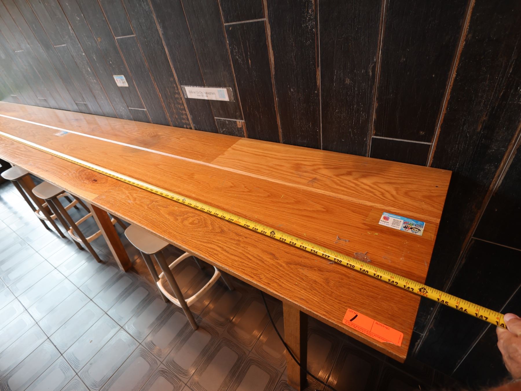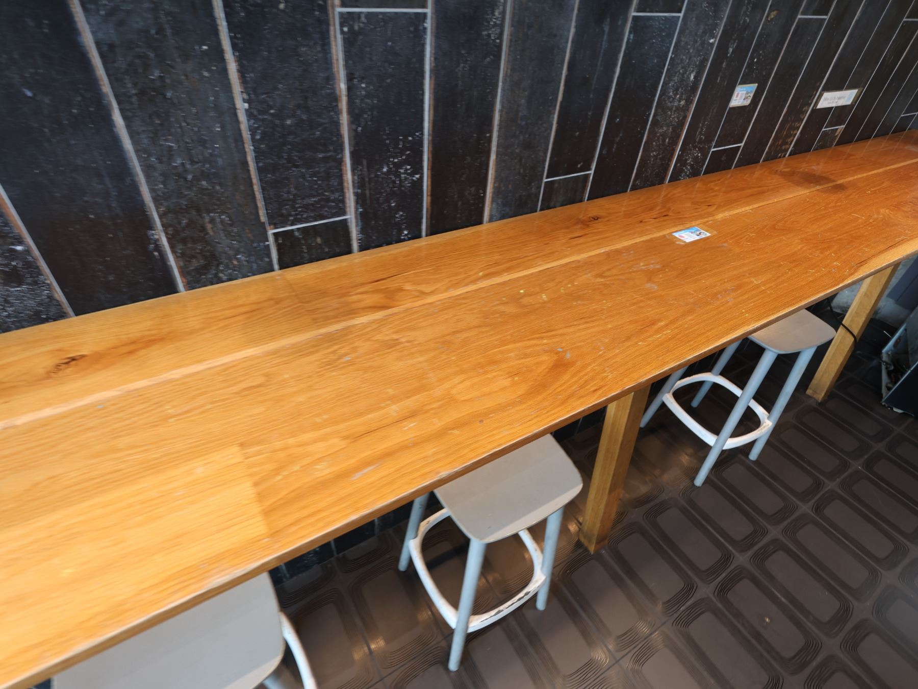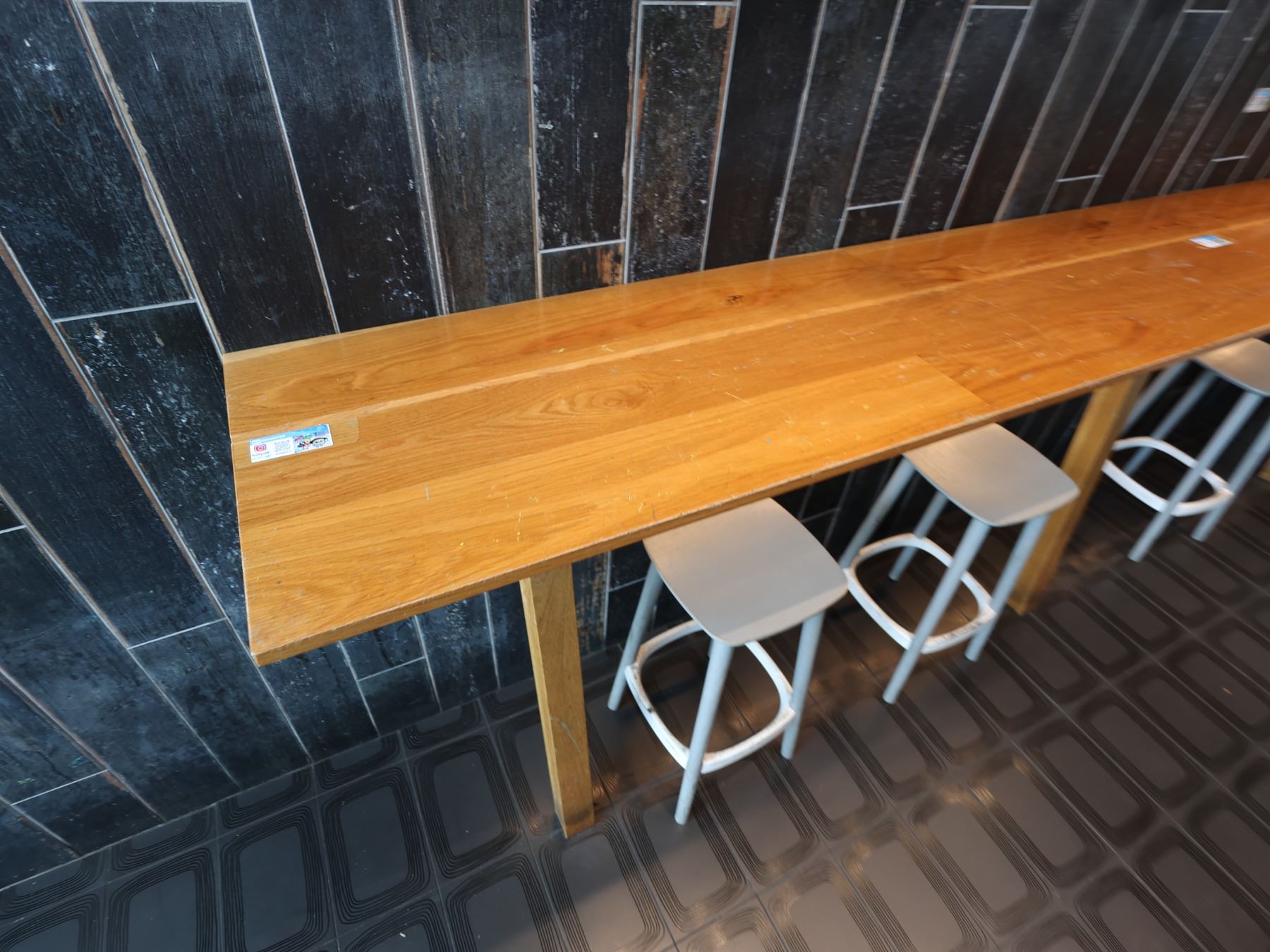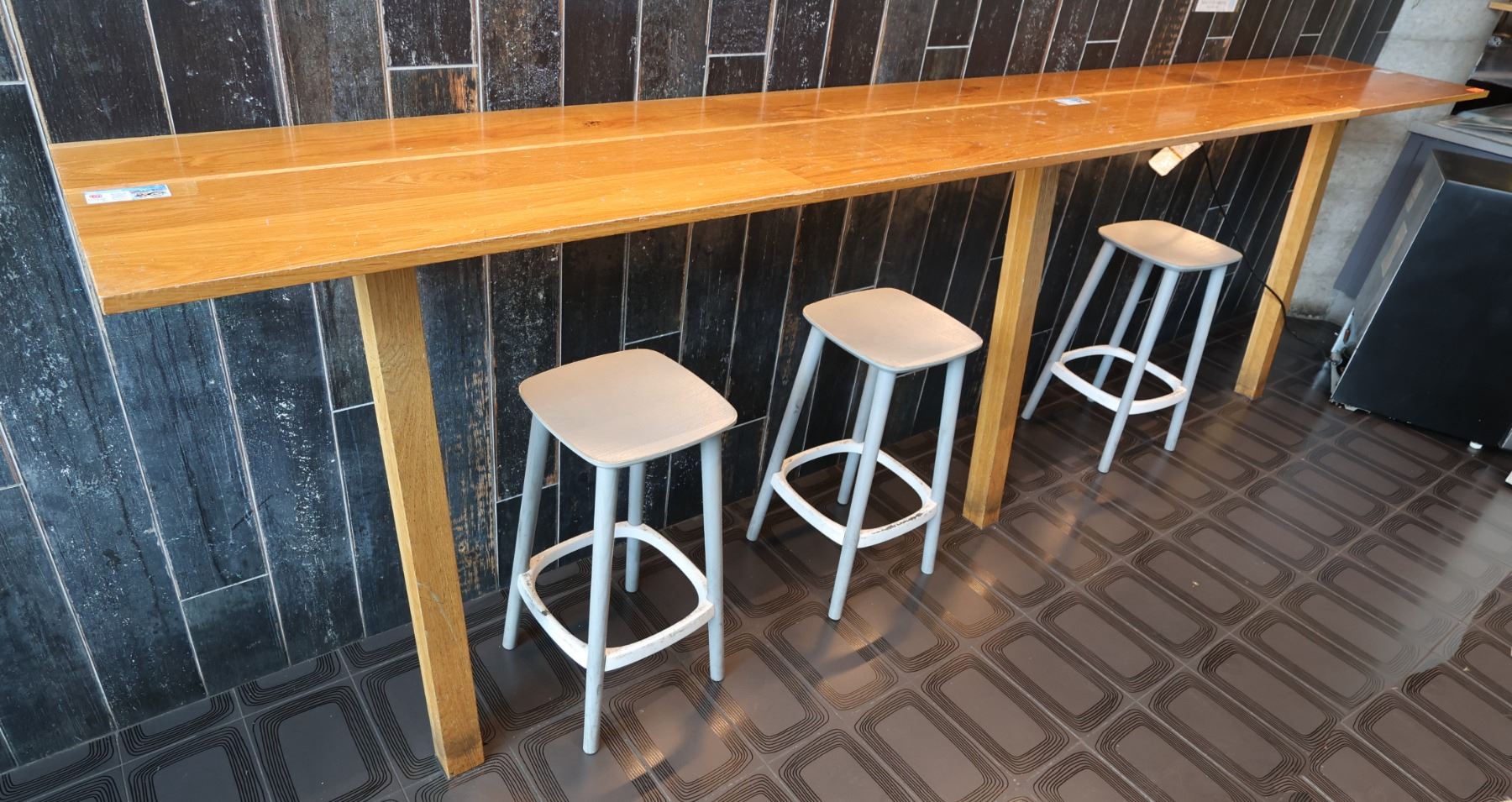 Wooden Bar-Height Counter 144" x 20" x 42"H & 3 Pedrali Stools Made in Italy 12.5" x 12.5" x 25.5"H