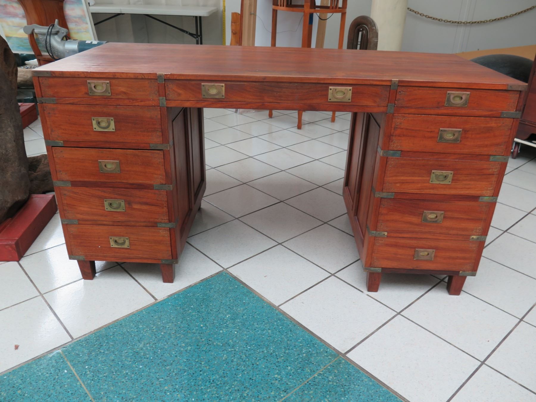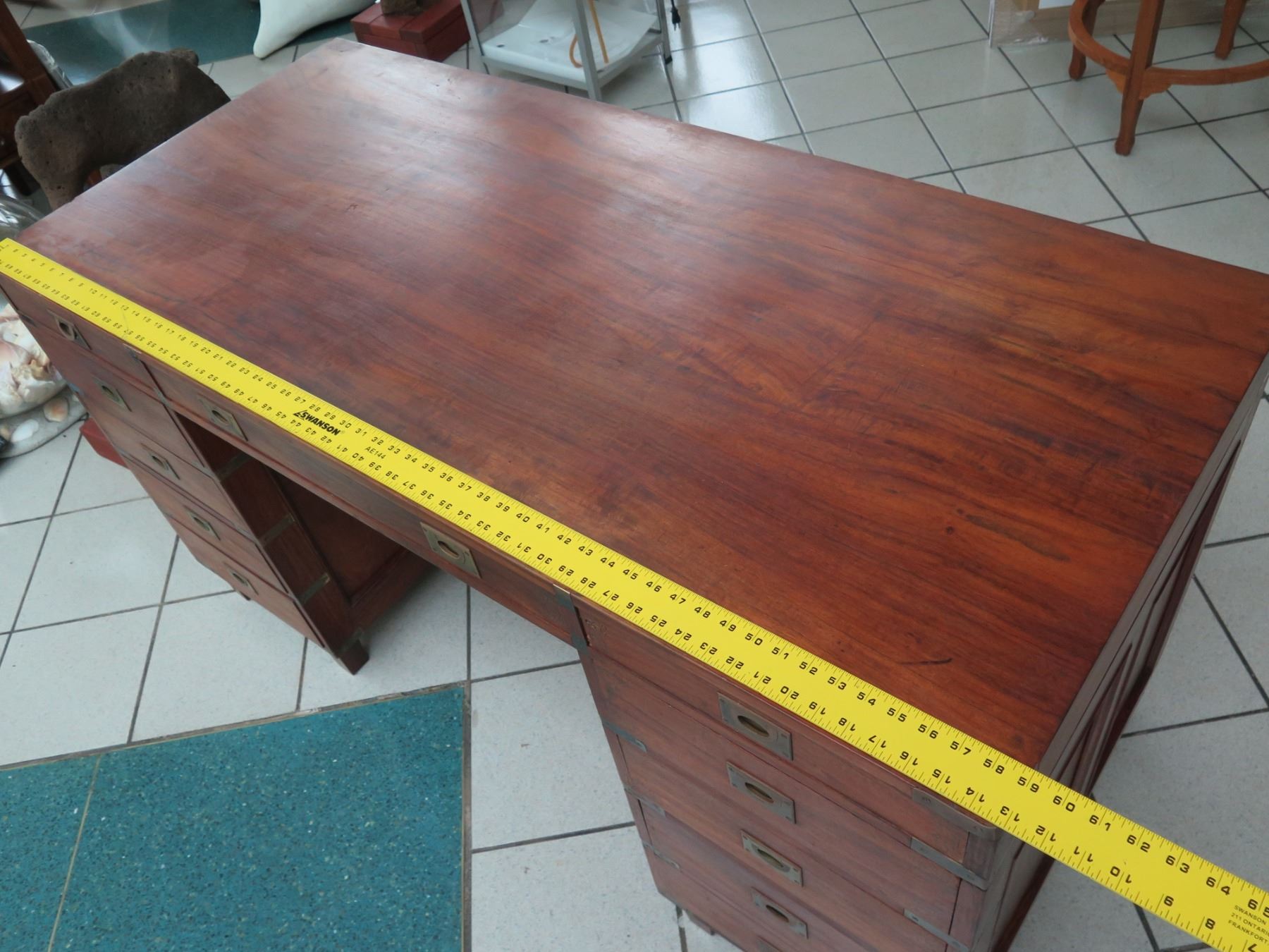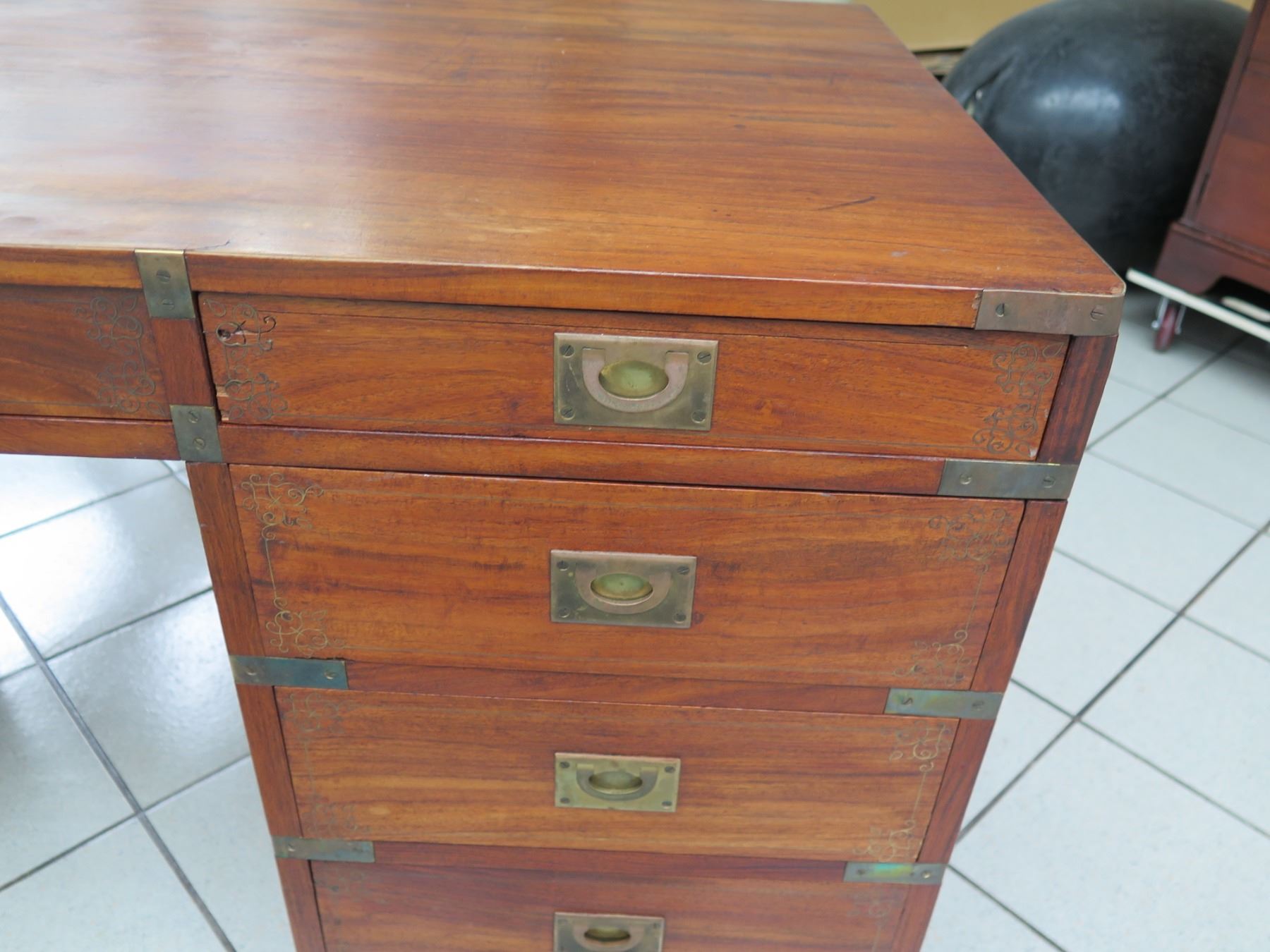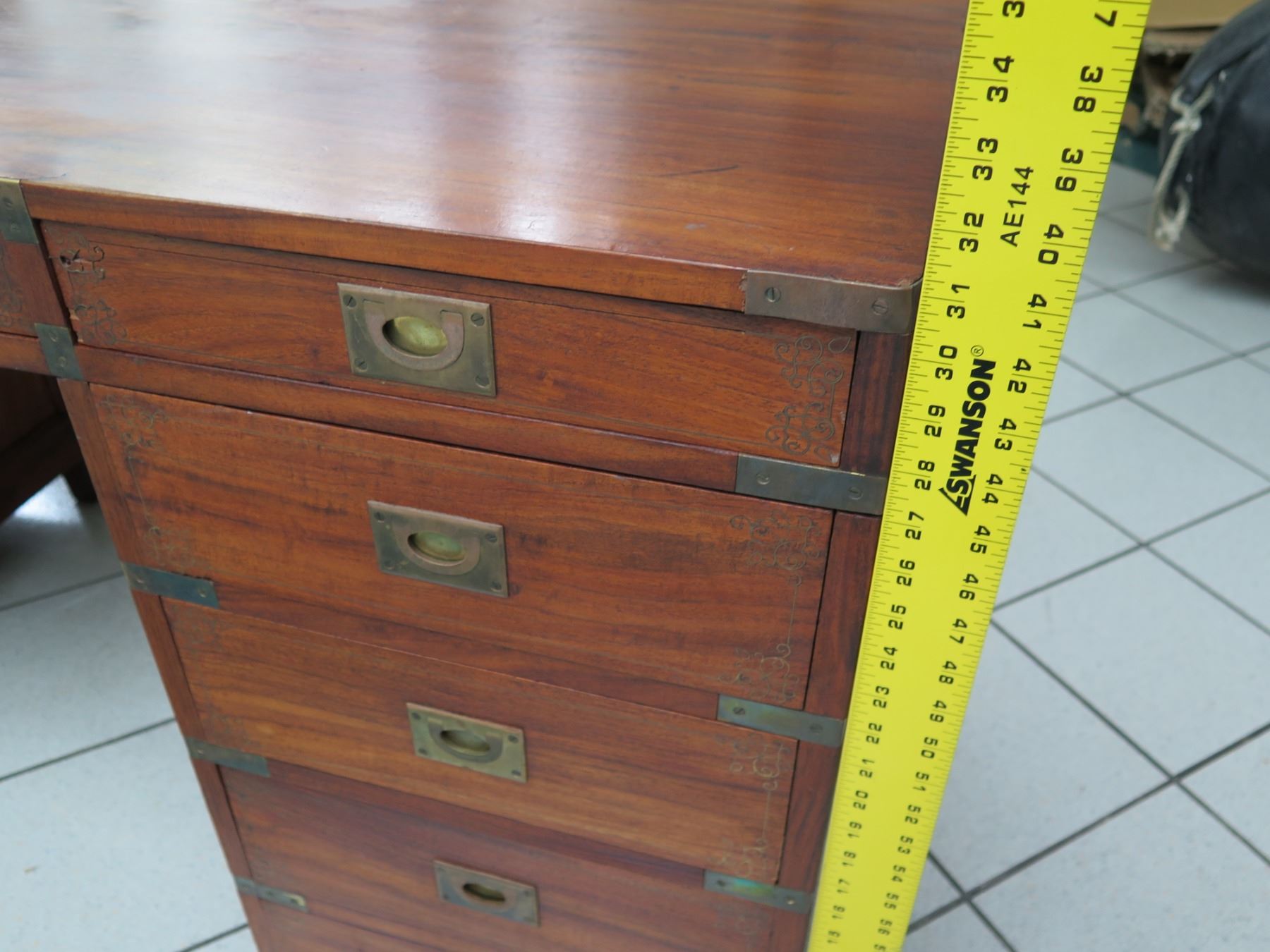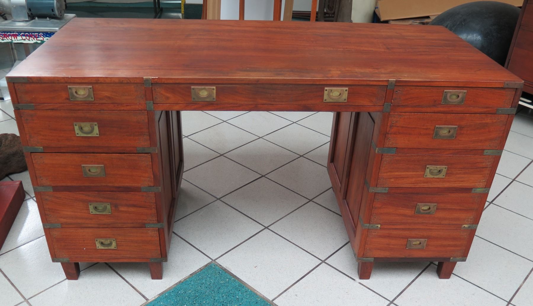 Wooden Desk with Inlaid Brass Filigree & Hardware, 59" x 29" x 31" H, Has Cosmetic Blemishes From Age (as shown in the pictures)
