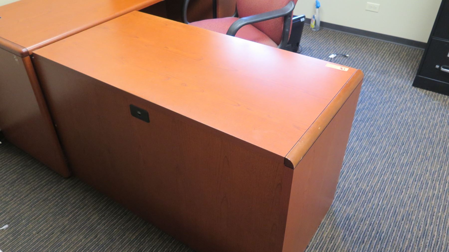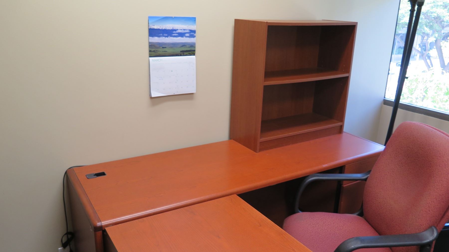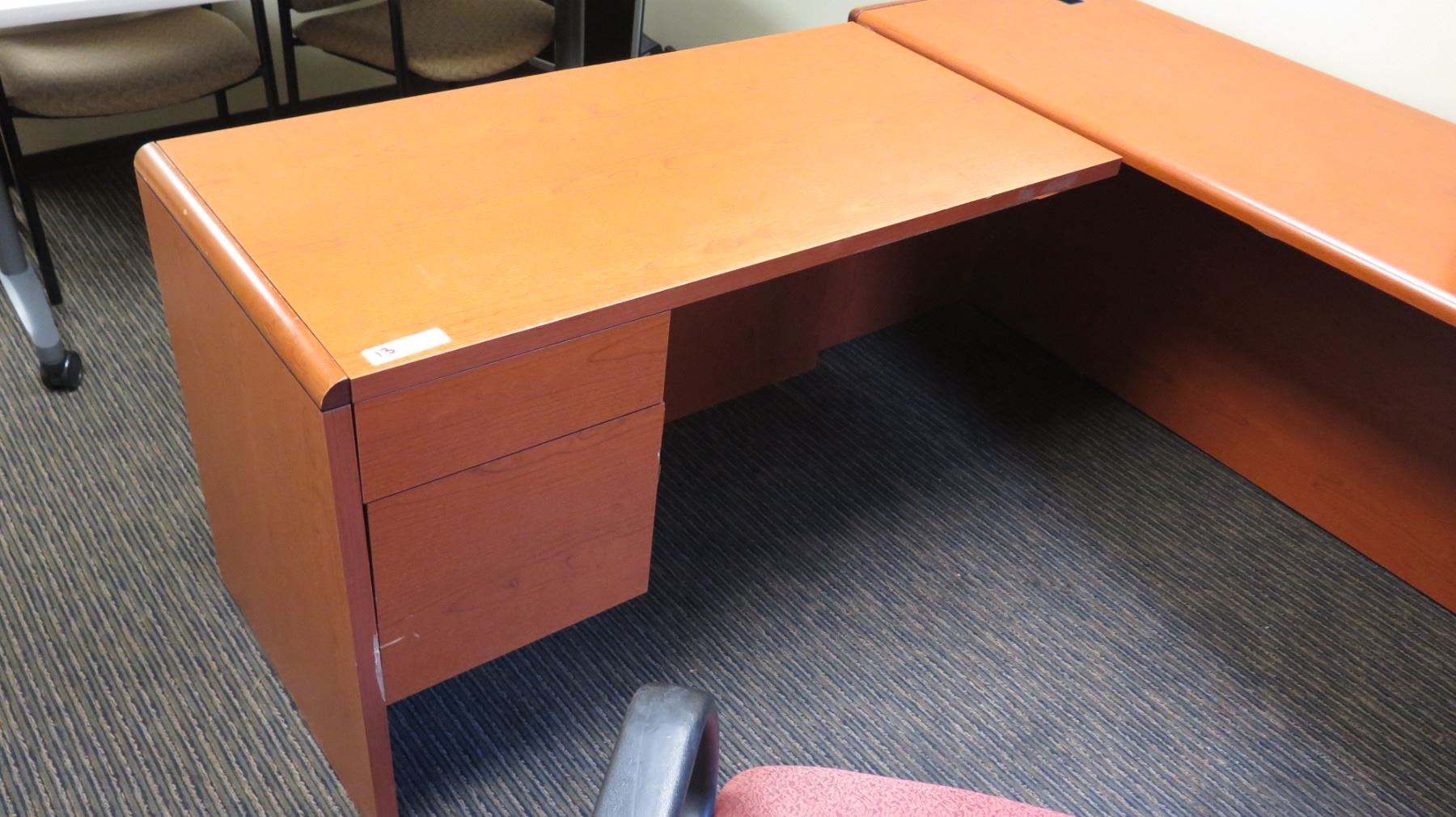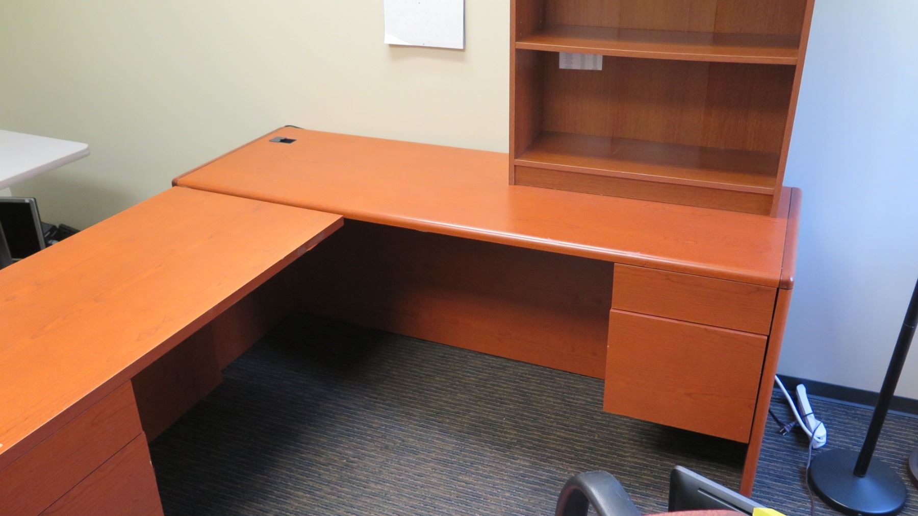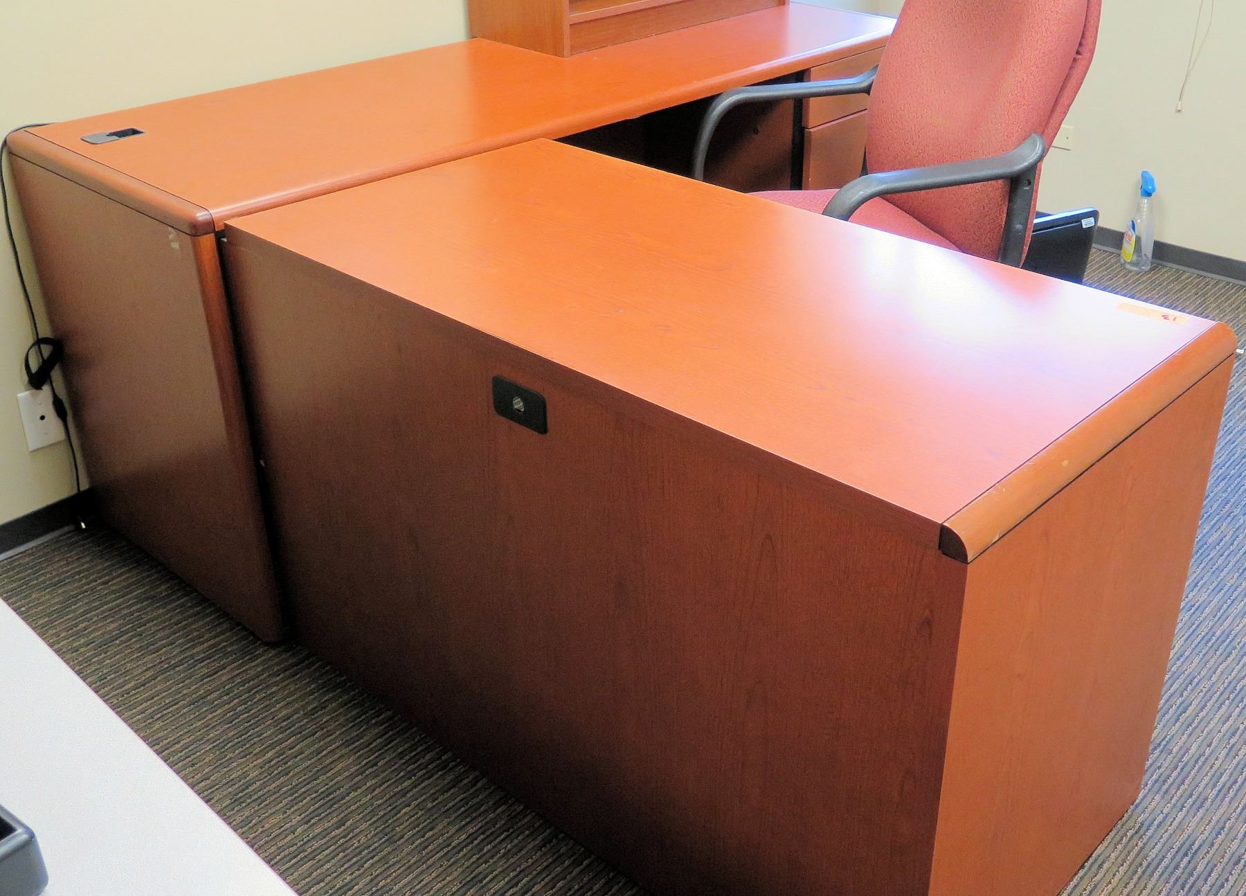 Wooden L-Shaped Desk Ensemble w/ Office Chair, Small Bookcase 72"x24"30"H & 48"x24"29"H. Buyer will be responsible for disassembling and removing all purchased items in this auction. Buyer must bring own tools, carts, etc. Loadout Thursday, May 9 to Saturday May 11. Detailed directions to building’s loading zone and designated load-out areas will be provided.