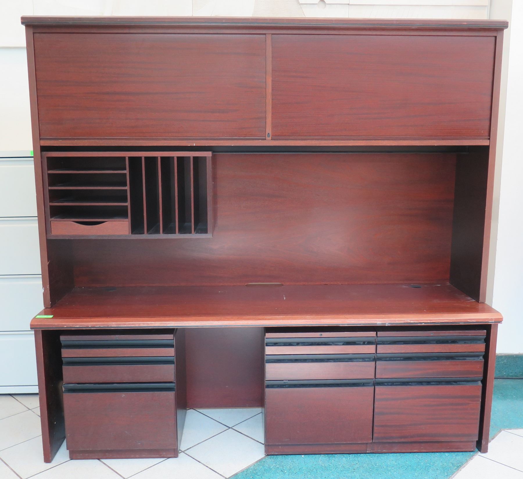 Wooden Multi-Section Desk w/ Hutch, 2 Top Cabinets & 3 File Cabinets 79"x22"x75"