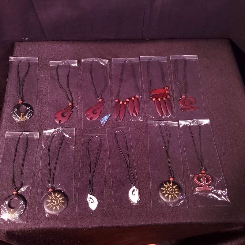 Nine Hope and Life Wooden Necklaces, Nine Wooden Hawaiian Petroglyph Necklaces, Nine Om Circle Wooden Necklaces, Nine Surfboard Wooden Necklaces, Nine Hawaiian Makau Fish Hook Necklaces, Nine 3" Wooden Hei-Matau Necklaces, Nine 2.5" Wooden Hei-Matau Necklaces