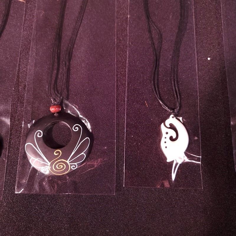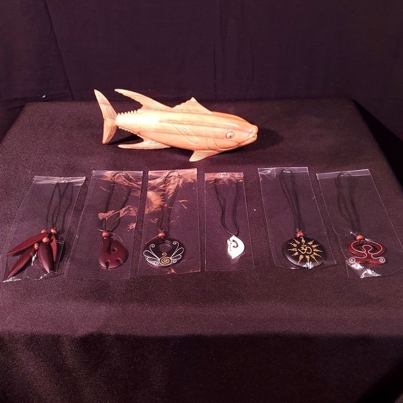 One Hope and Life Wooden Necklace, One Wooden Hawaiian Petroglyph Necklace, One Om Circle Wooden Necklace, One Surfboard Wooden Necklace, One Hawaiian Makau Fish Hook Necklace, One 3" Wooden Hei-Matau Necklace, One 2.5" Wooden Hei-Matau Necklace