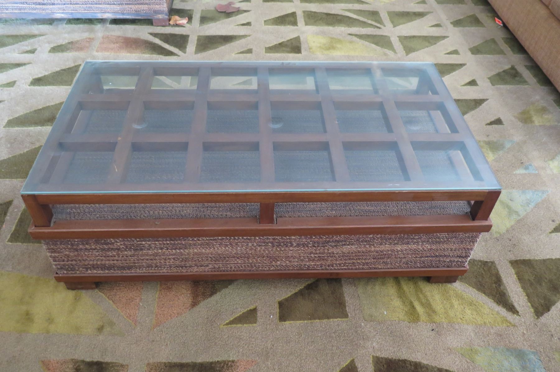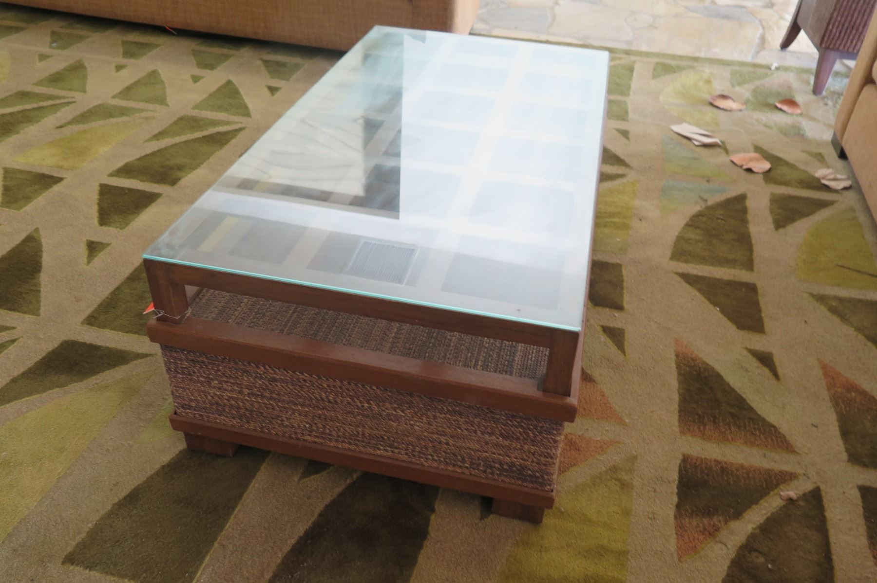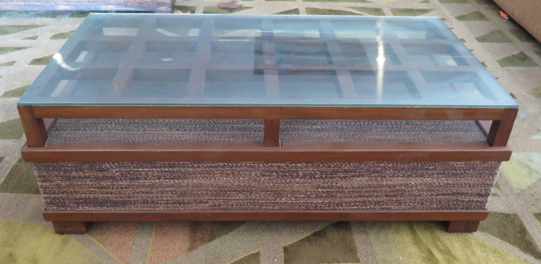 Wooden Rectangular Coffee Table w/ Glass Top & Woven Base 50" x 27"D x 17"H