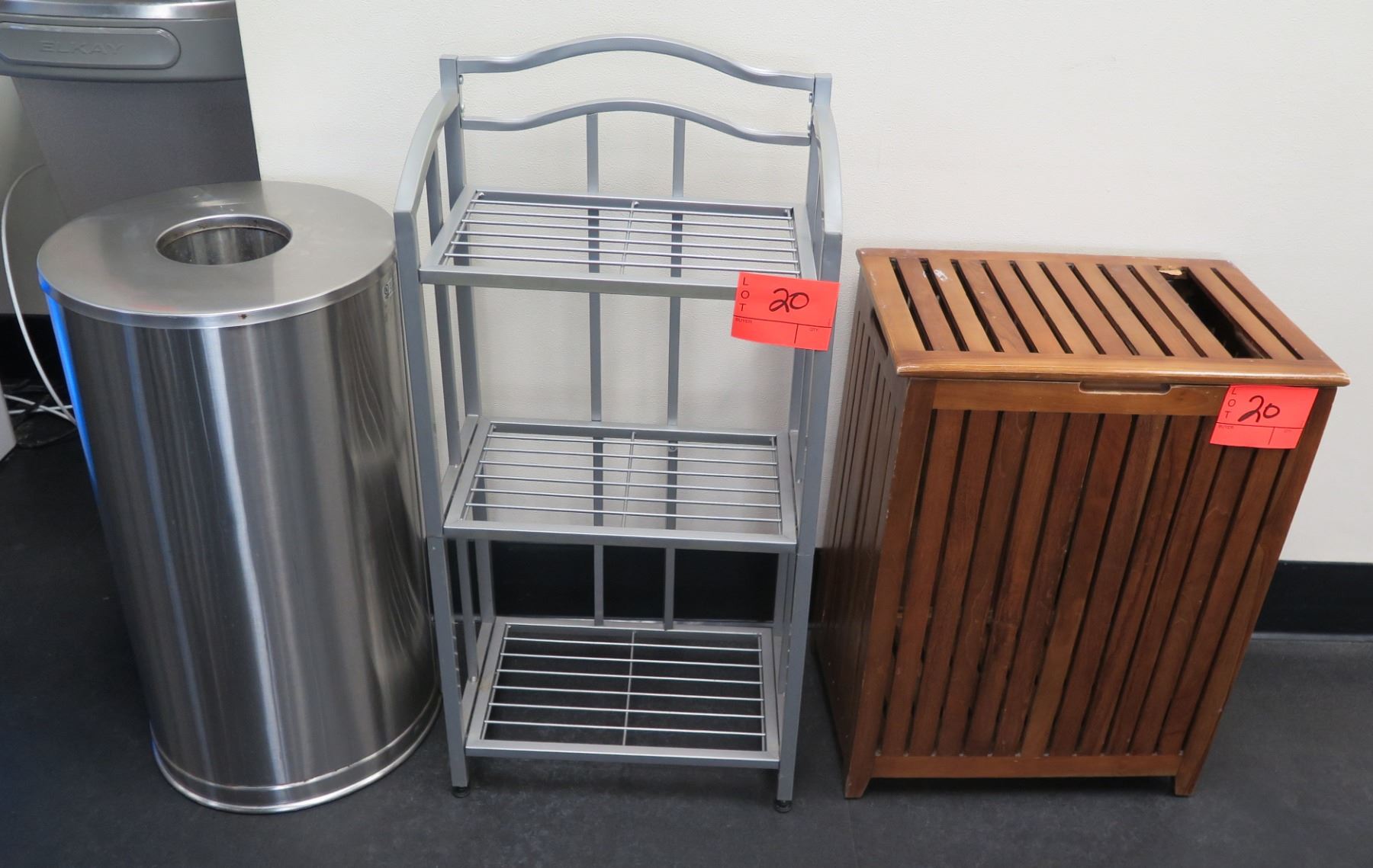 Wooden Slatted Towel Bin (missing 1 slat), Waster Receptable & Metal Rack