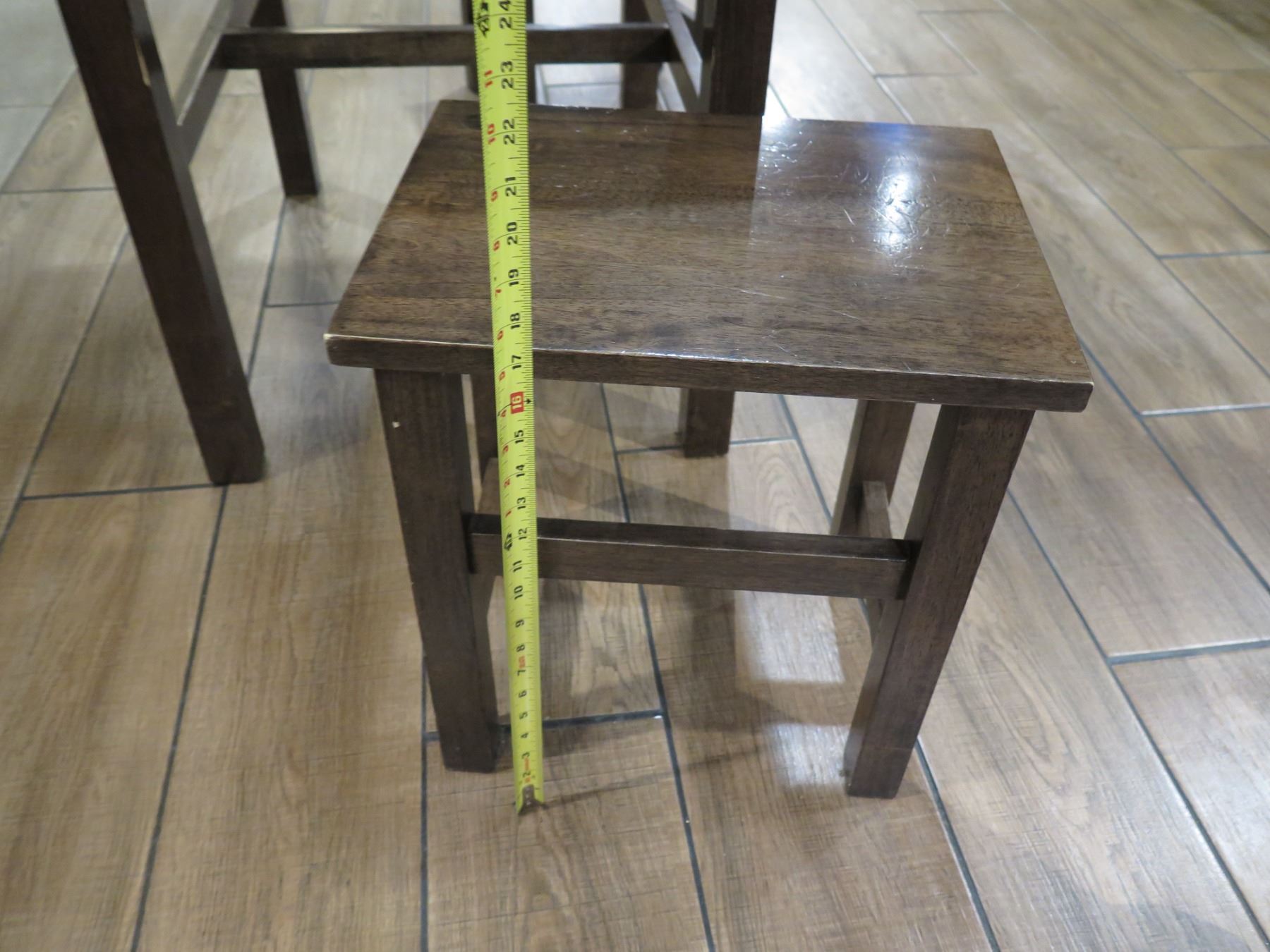 Wooden Table 30"x25"x30"H w/ 2 Matching Stools 16"x12"x17"H. This is a stock photo that is generally representative of the item(s) in this auction lot.  Conditions may vary.