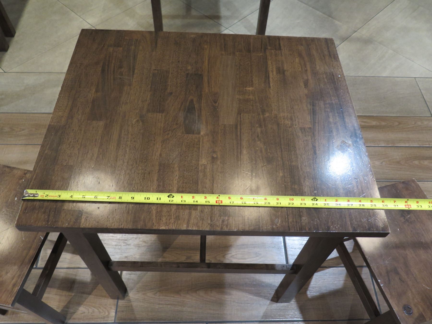 Wooden Table 30"x25"x30"H w/ 2 Matching Stools 16"x12"x17"H. This is a stock photo that is generally representative of the item(s) in this auction lot.  Conditions may vary.