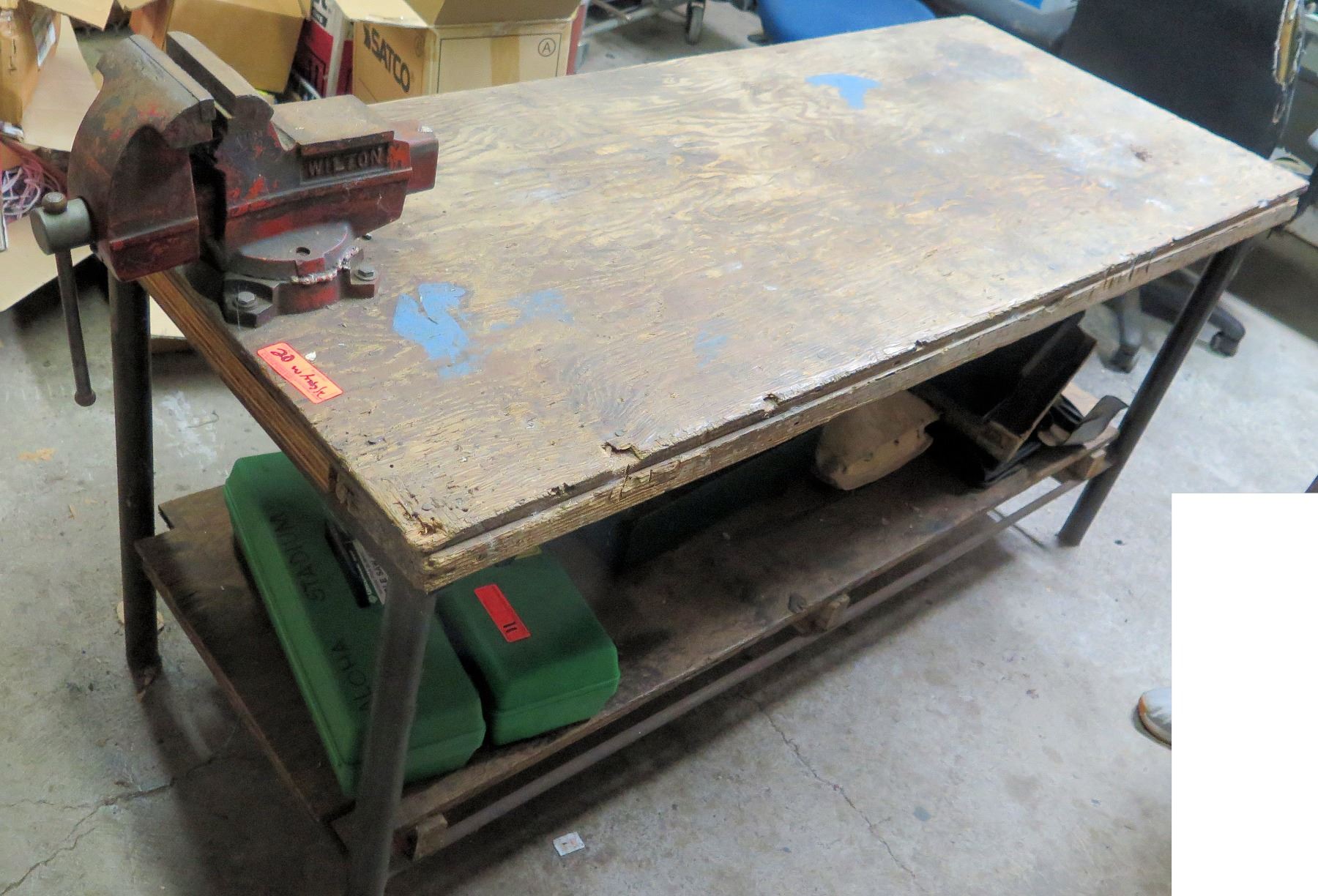 Wooden Table w/ Metal Legs 63" x 26" x 30"H w/ Wilton Vise Clamp