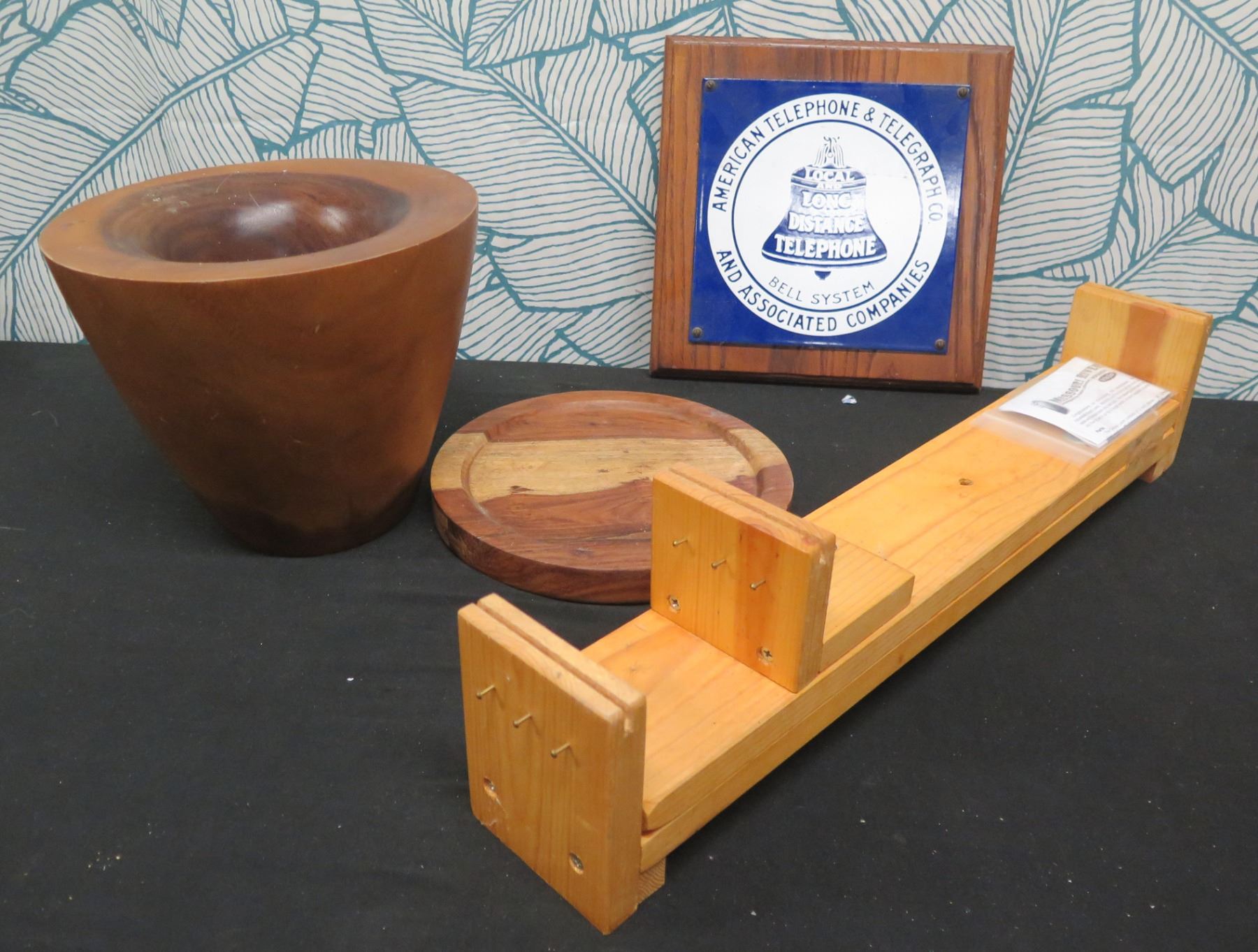 Wooden Tray Marked Chefs, Bowl, Missouri River Bead Loom & American Telephone Plaque