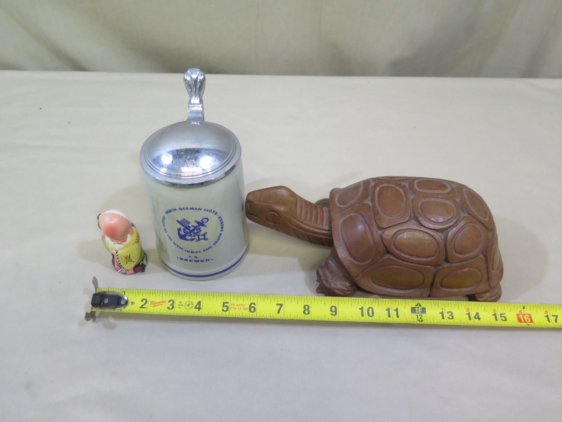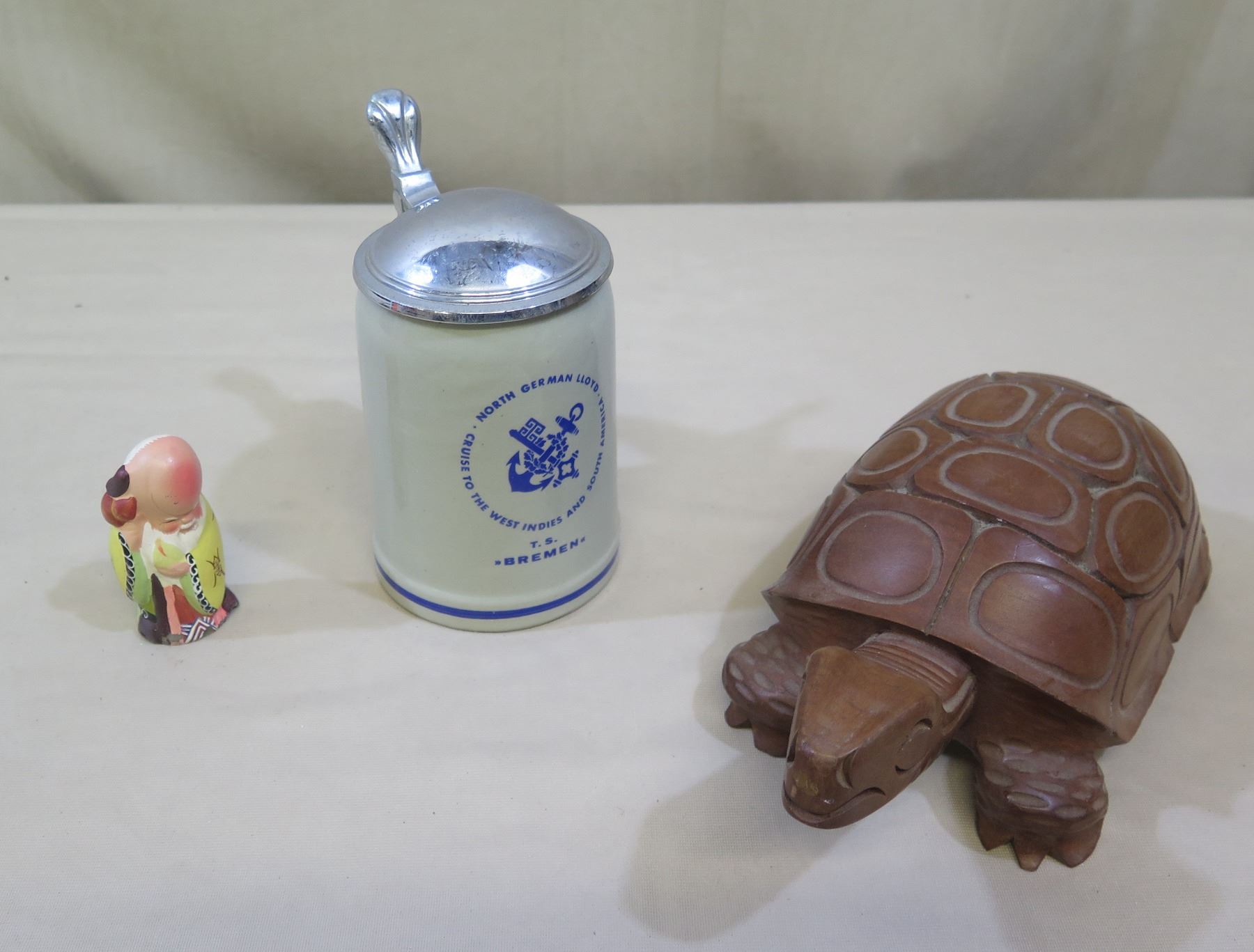 Wooden Turtle & Chinese God Figurine, T.S. Brement German Beer Stein w/ Lid