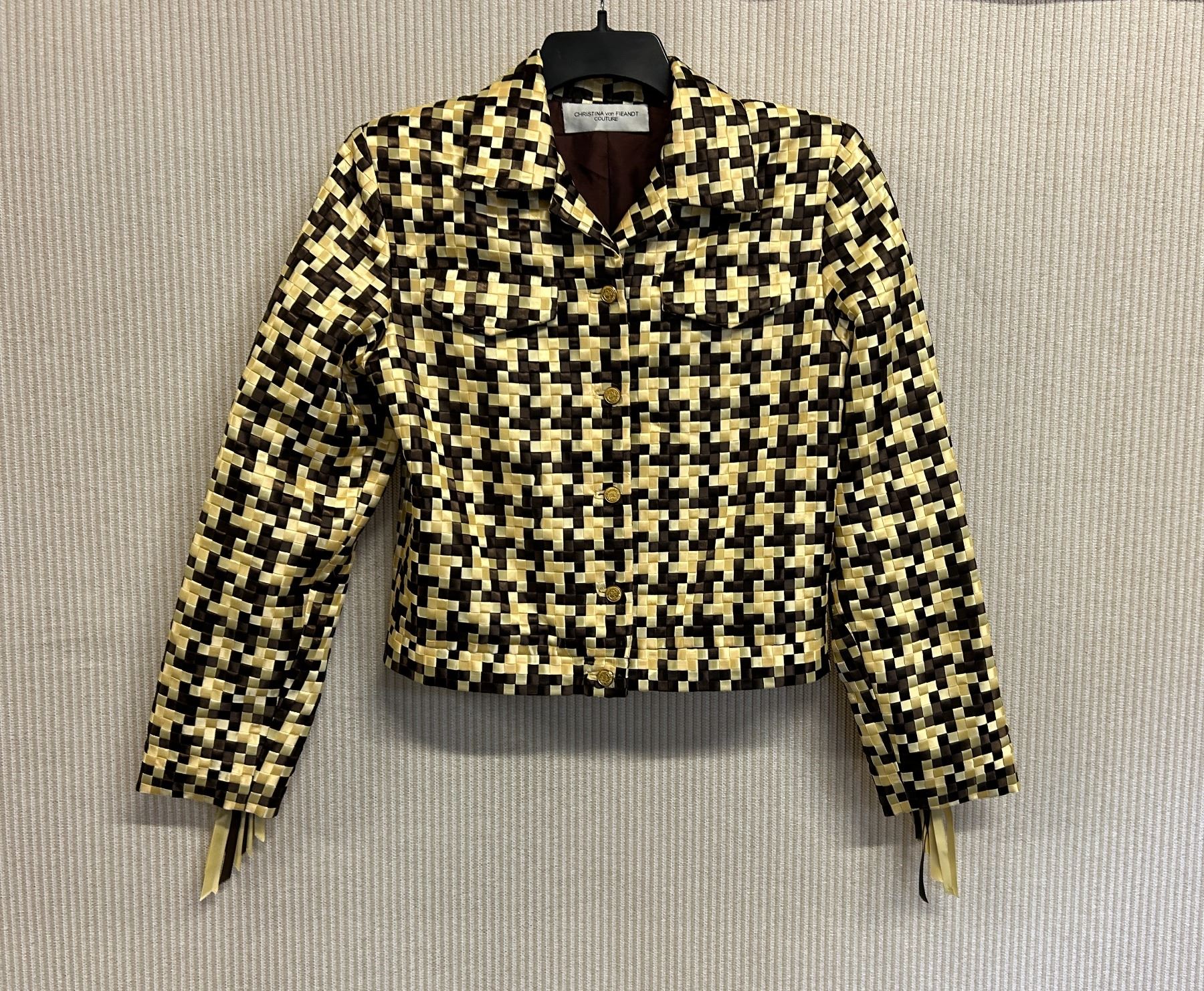Christina von Fieandt Woven Woven Black/Earth Jacket w/ State of Hawaii Buttons, Fringe, Size S, New - No Tag (Retail $1500). Fringed arms. Lined. Black and neutral tones.
