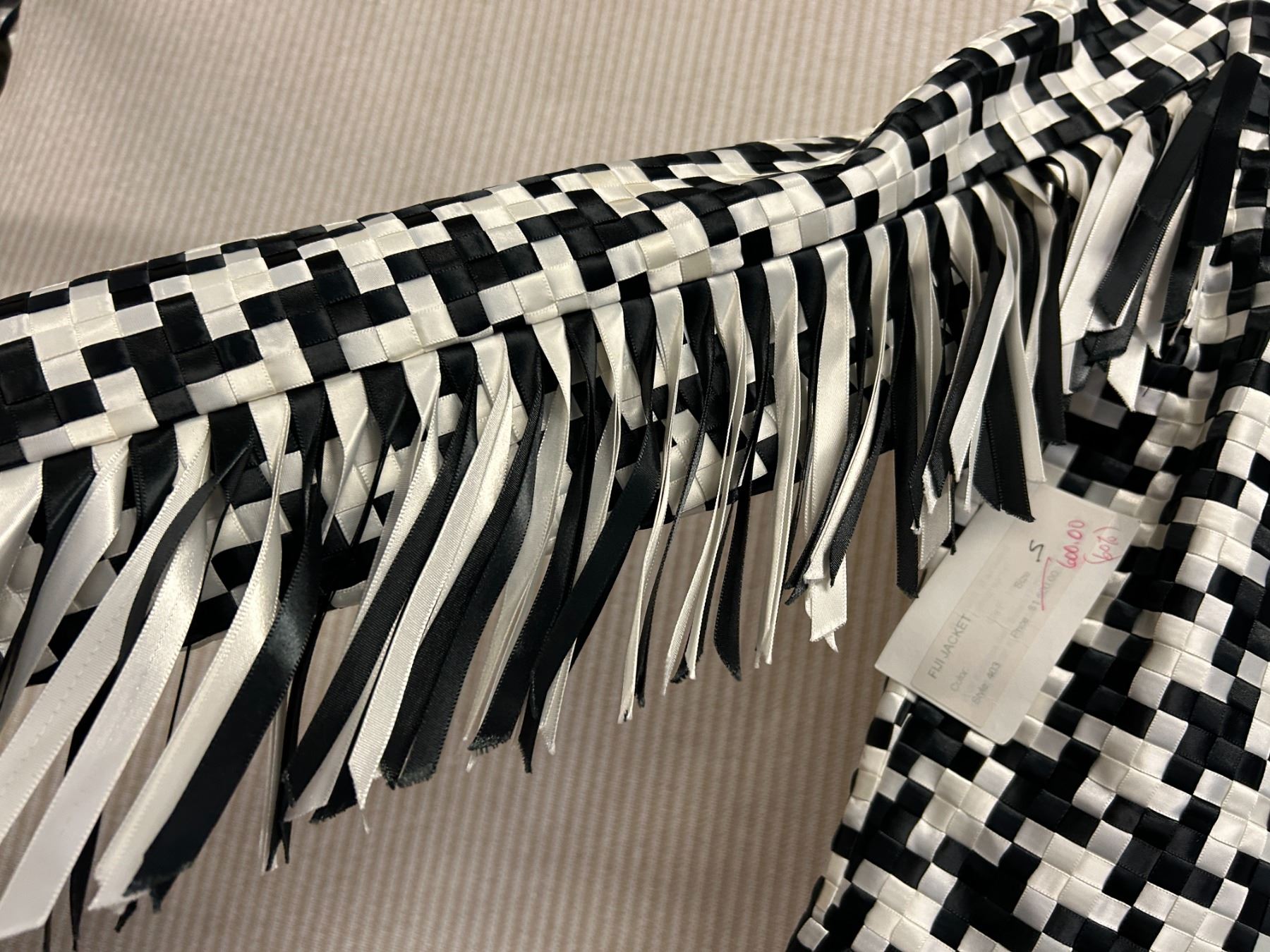 Christina von Fieandt Woven Black-White Fiji Jacket w/ Fringe, Size S, New with Tag (retail $1500). Fringed arms. Lined. Has faint stains as shown in the pictures.