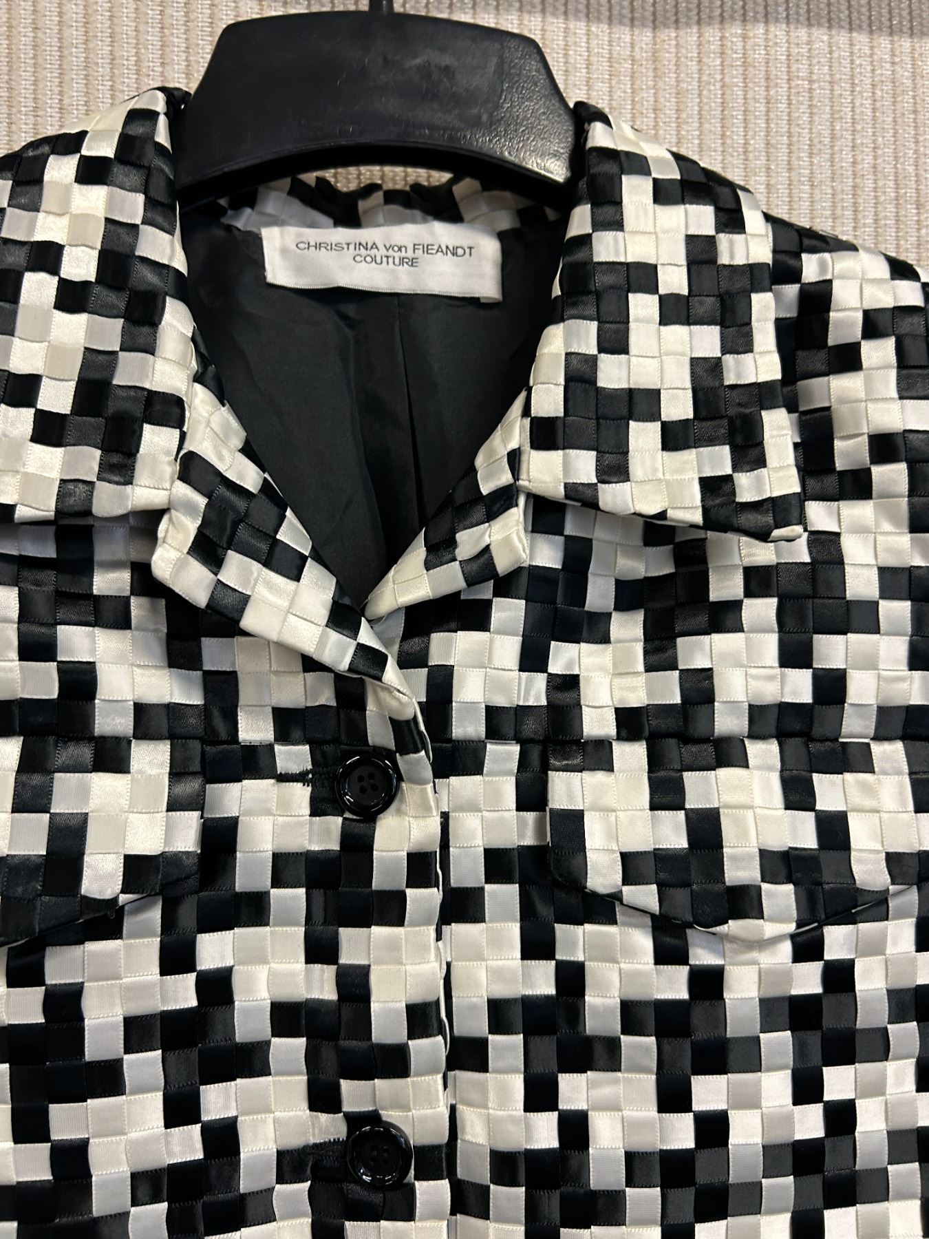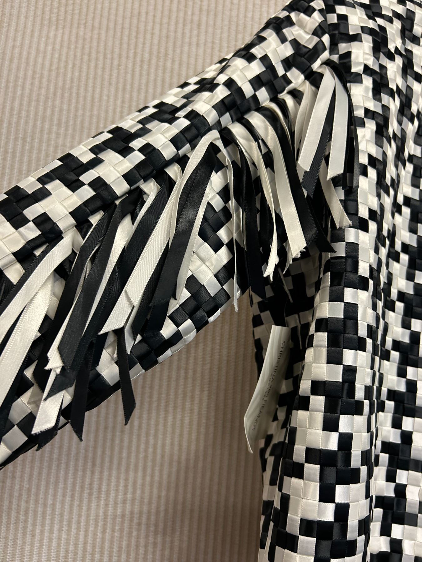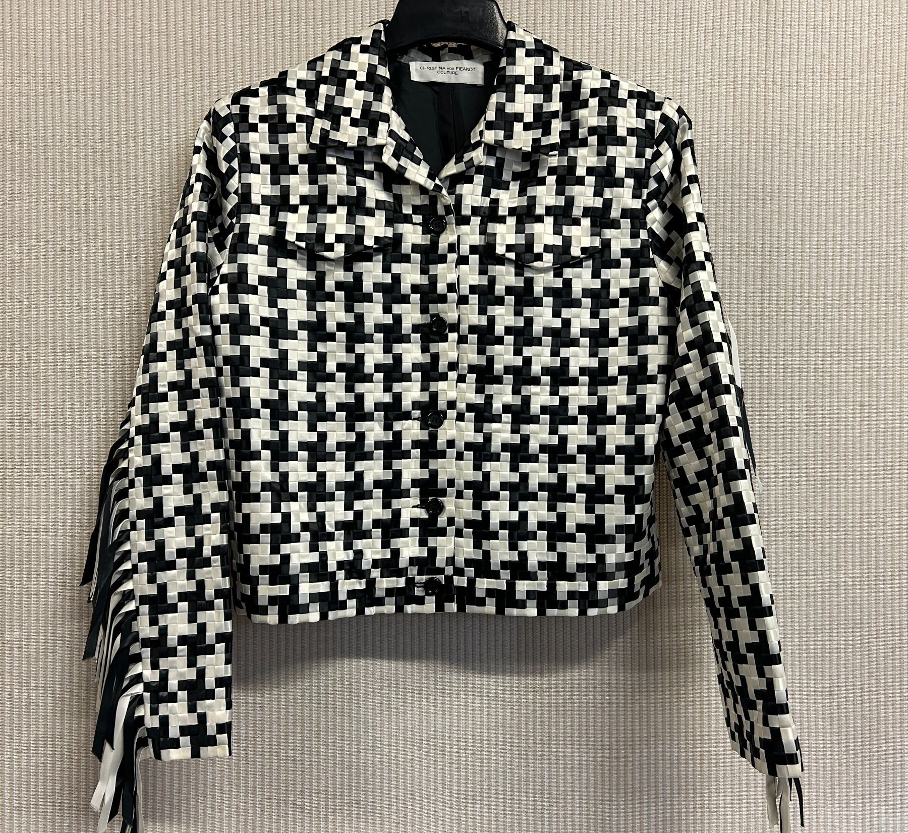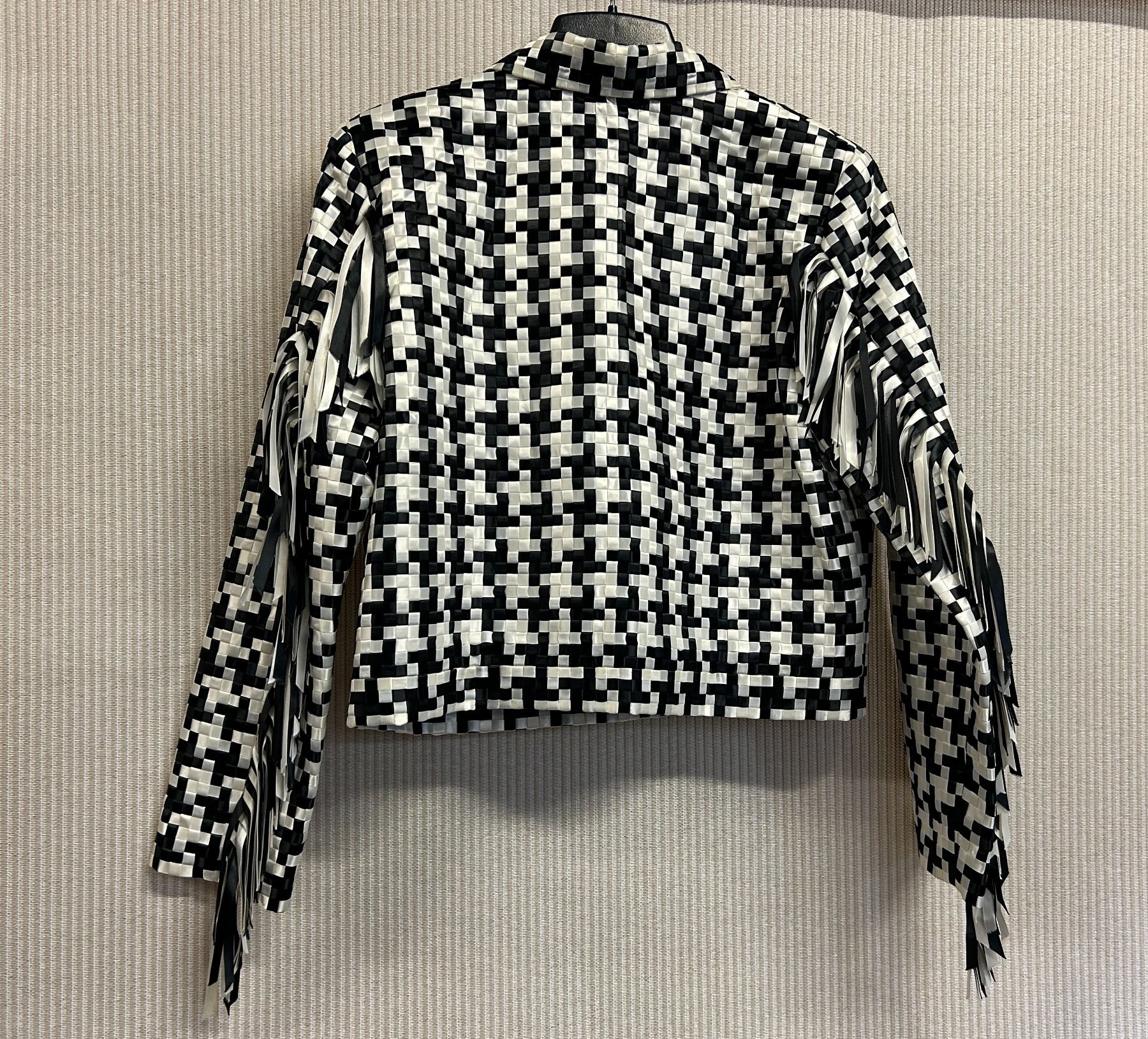 Christina von Fieandt Woven Black-White Fiji Jacket w/ Fringe, Size XL, Has Tag (Retail $1500). Fringed arms. Lined. Has faint stains as shown in the pictures.