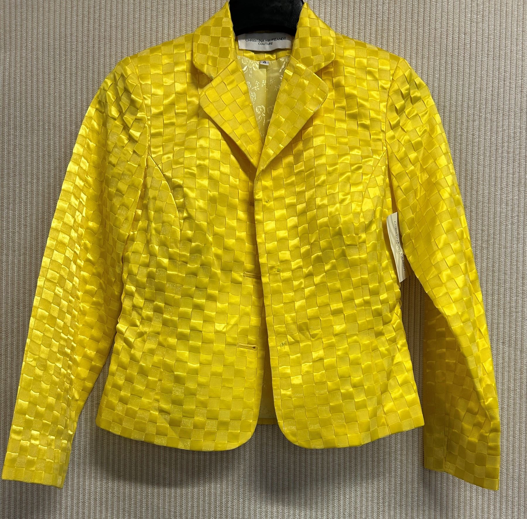 Christina von Fieandt Woven Canary Satin and Chiffon Jacket, Size 4, Has Tag, Missing Buttons (Retail $1250).