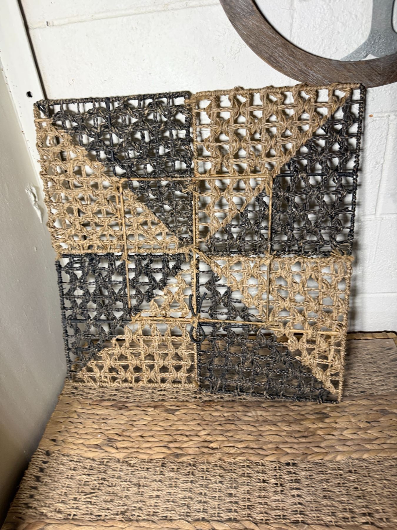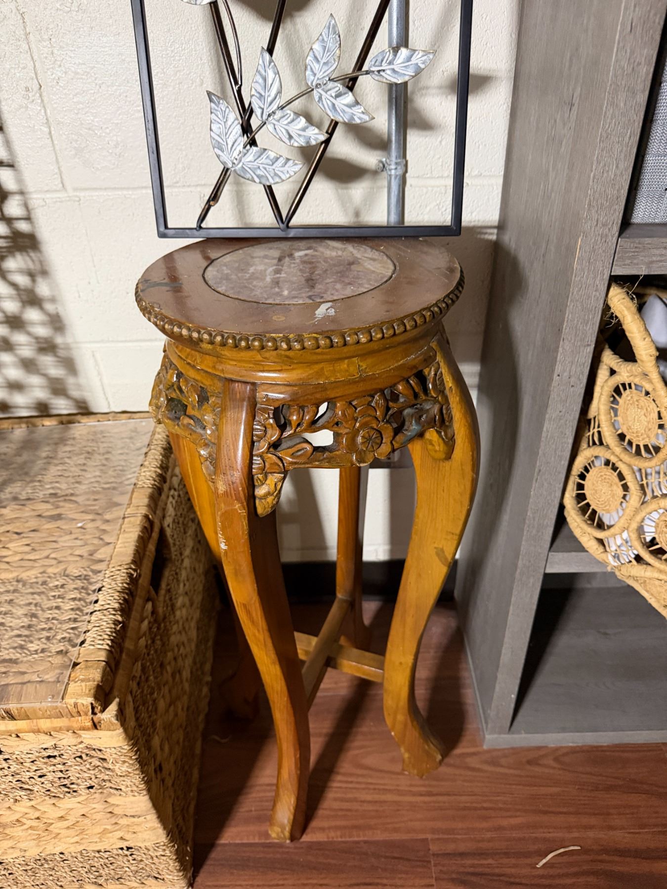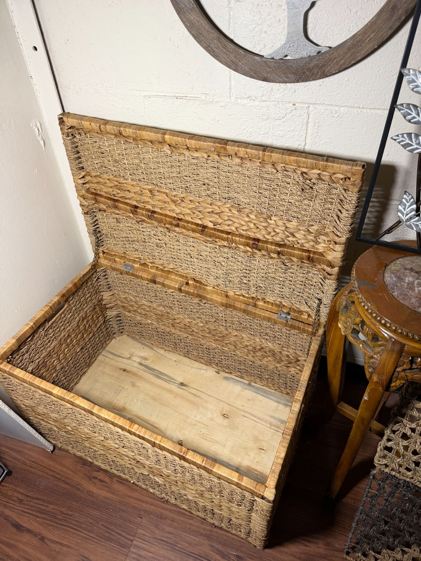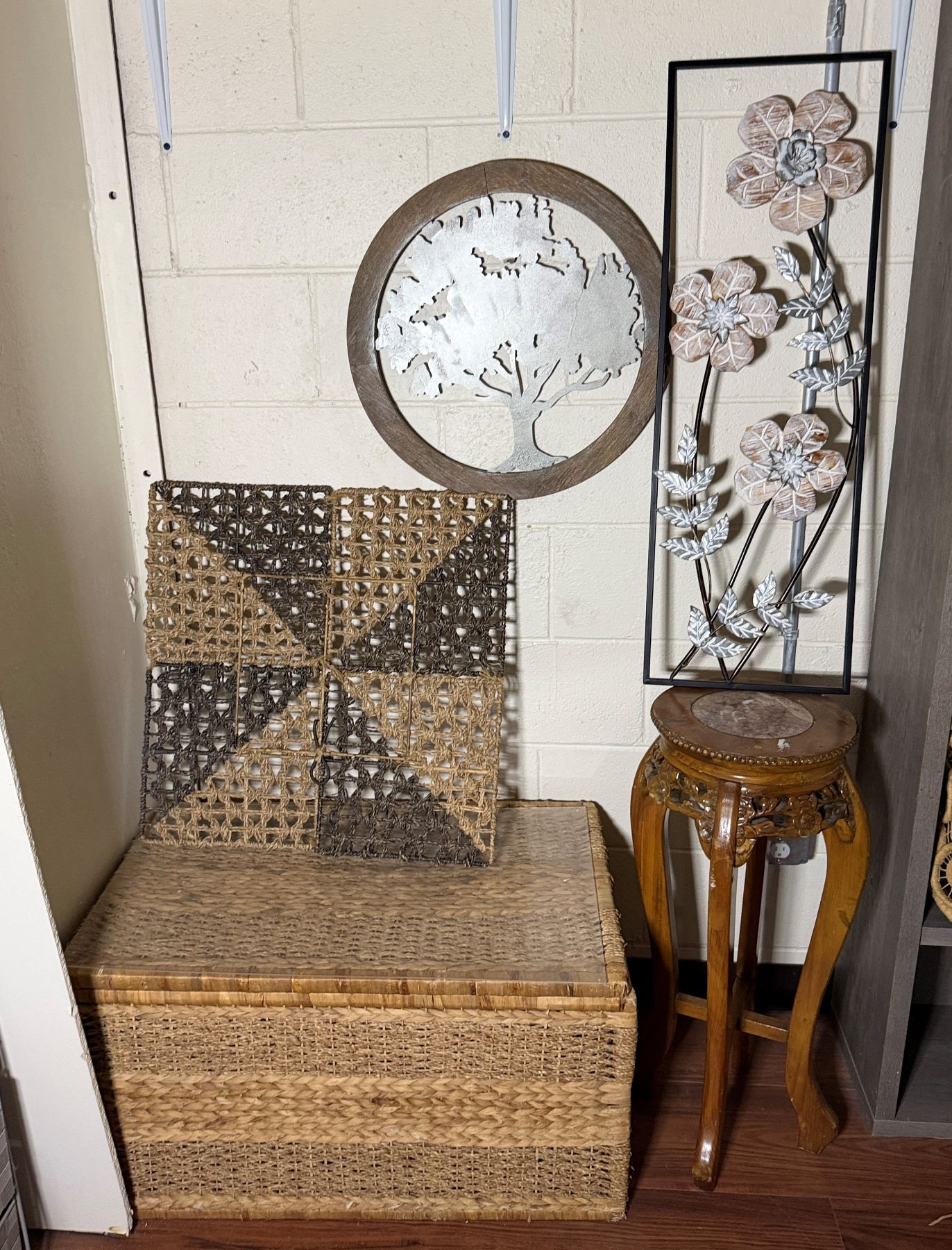 Woven Chest, 3 Misc Wall Hangings & Round Table w/ Cabriole Legs, Misc Sizes
