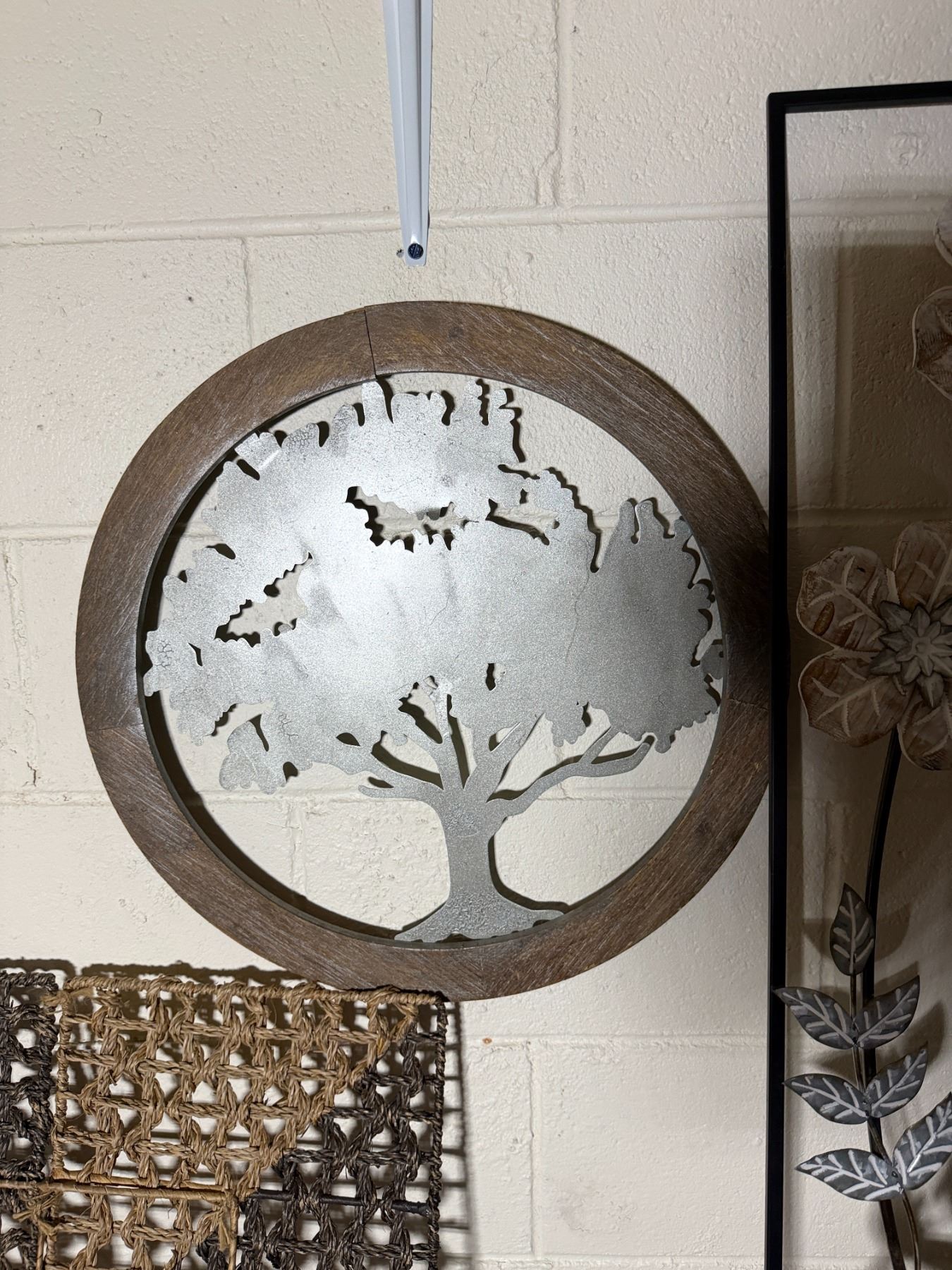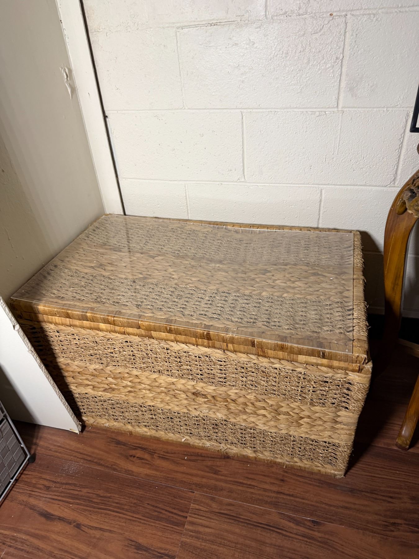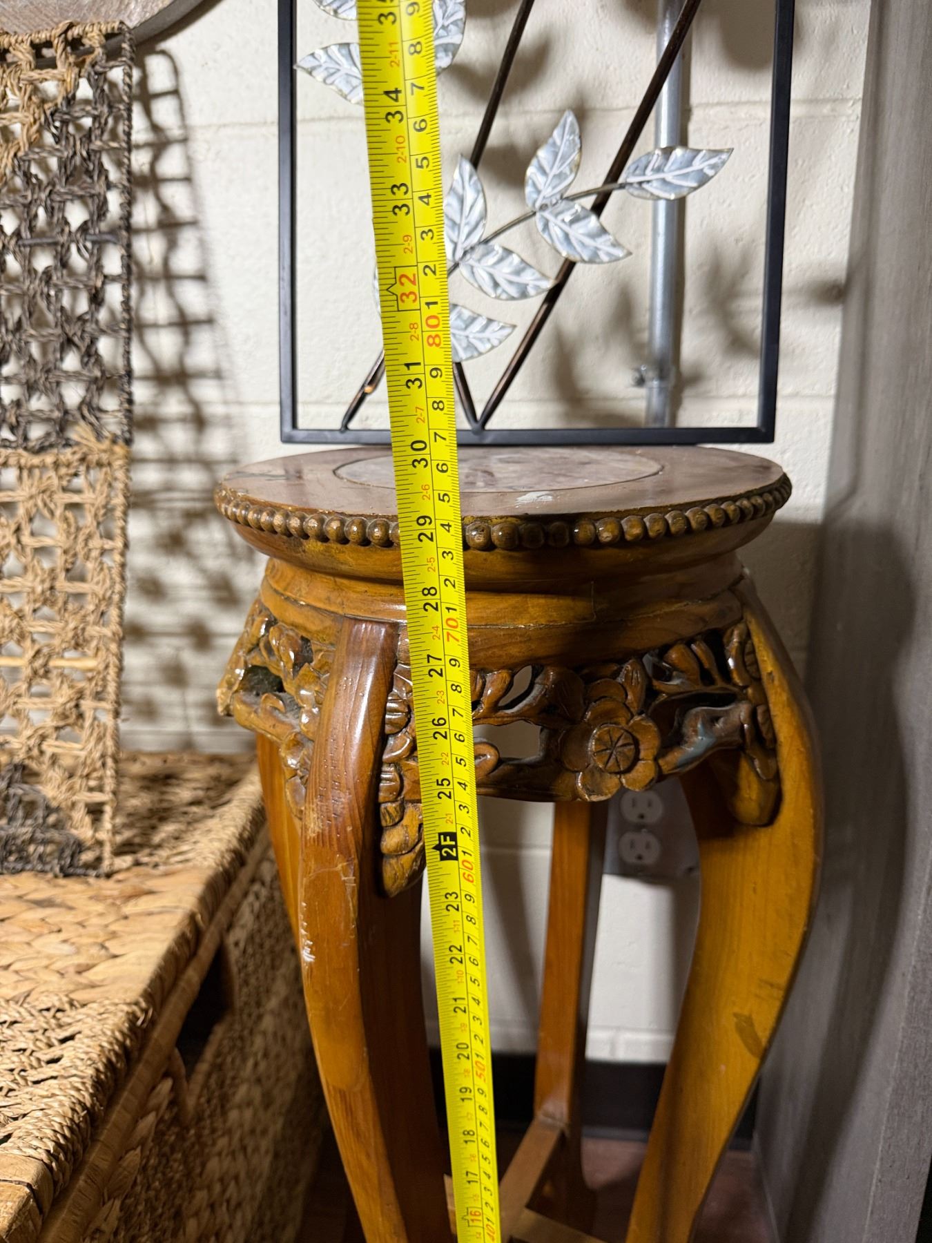 Woven Chest, 3 Misc Wall Hangings & Round Table w/ Cabriole Legs, Misc Sizes