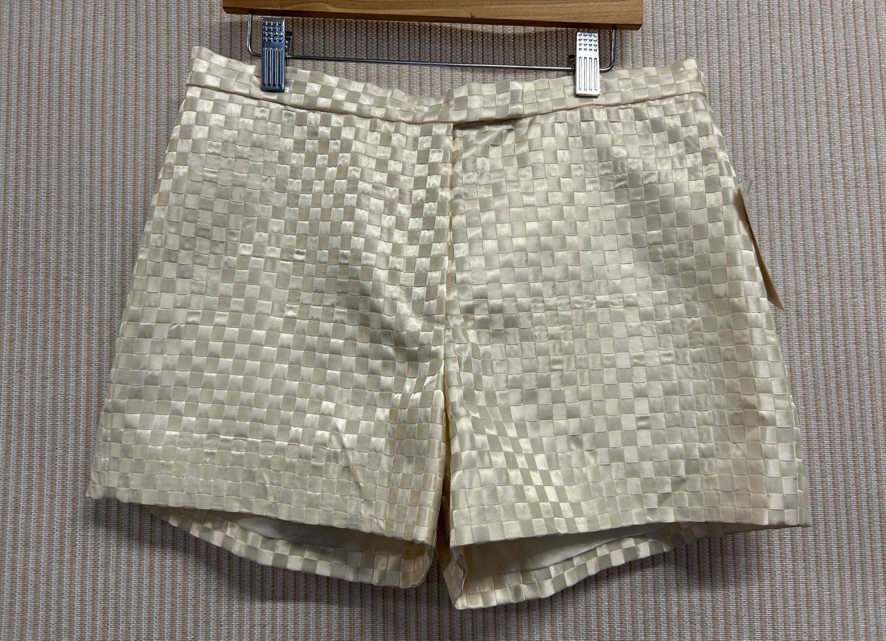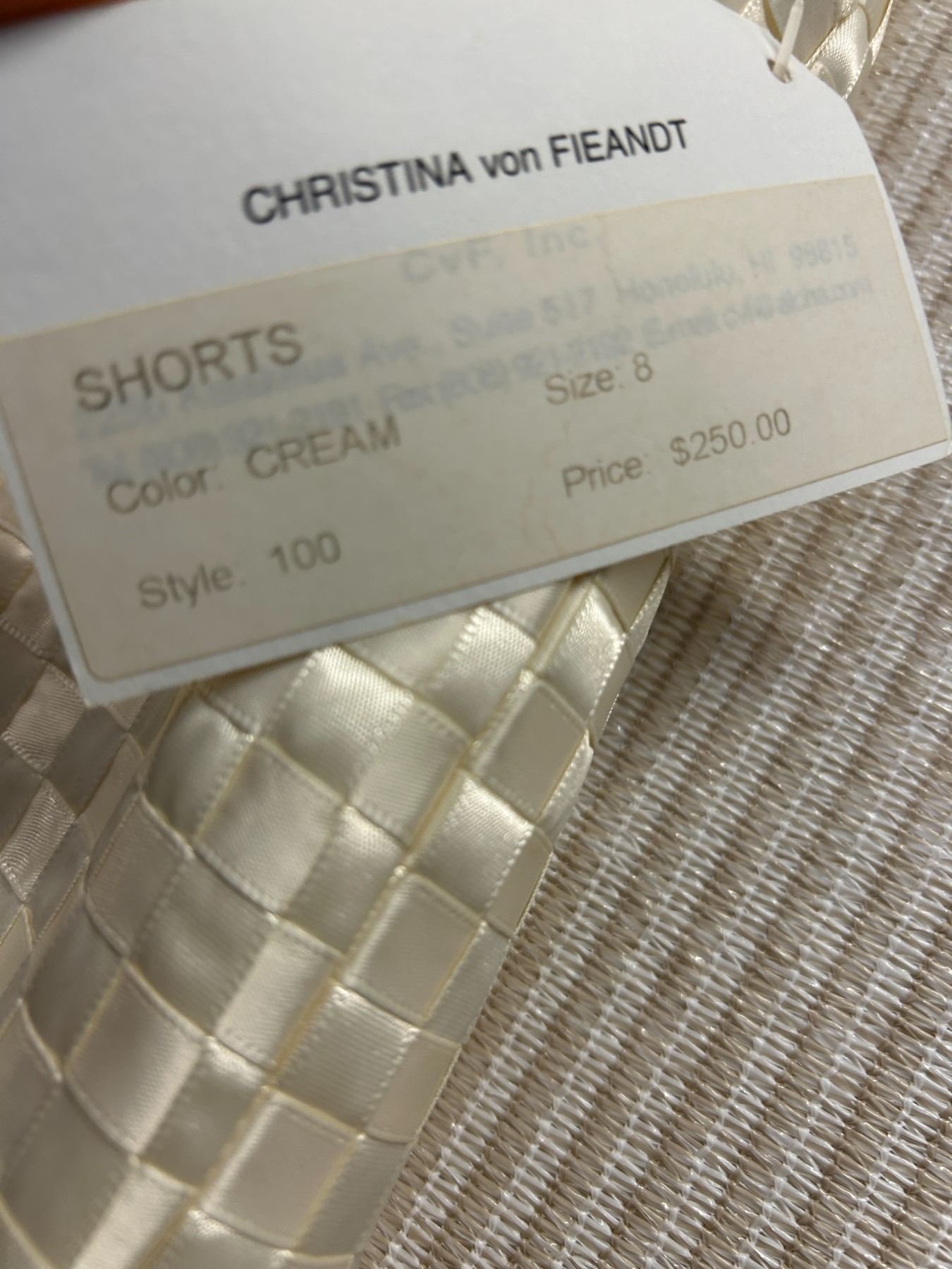 Christina von Fieandt Woven Cream Satin Zippered Shorts, Lined, Size 8, New w/Tag (Retail $250).