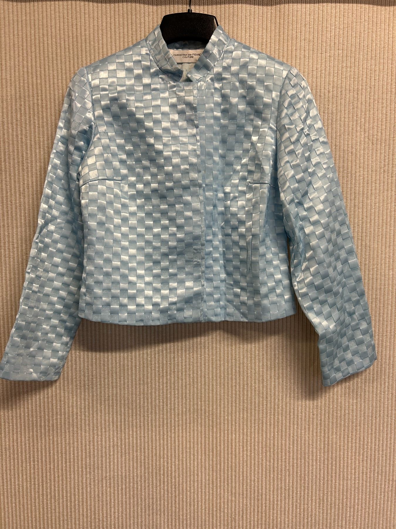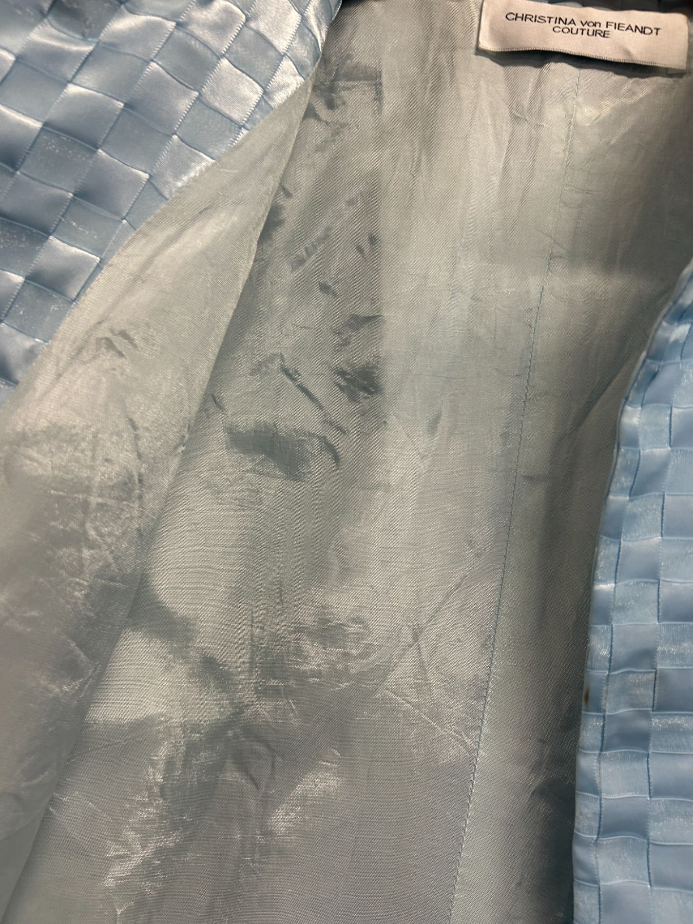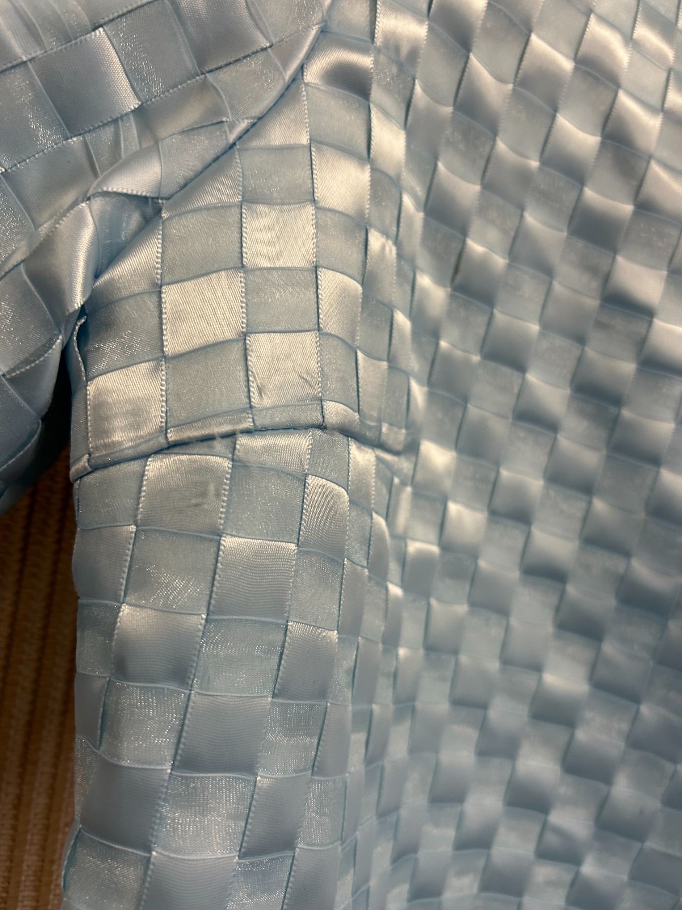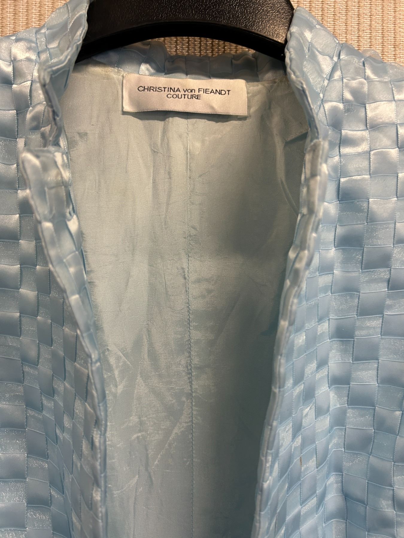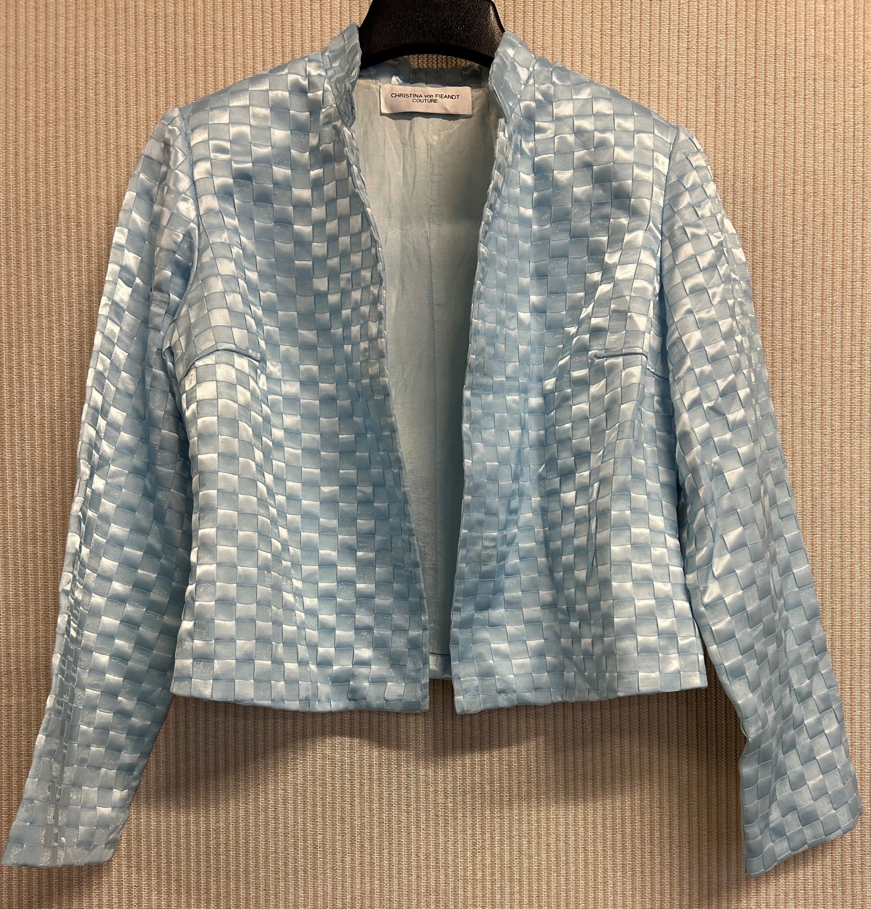 Christina von Fieandt Woven Lt. Gray Satin and Chiffon Jacket, Hidden Magnetic Buttons, No Tag. Has faint stains as shown in the pictures.