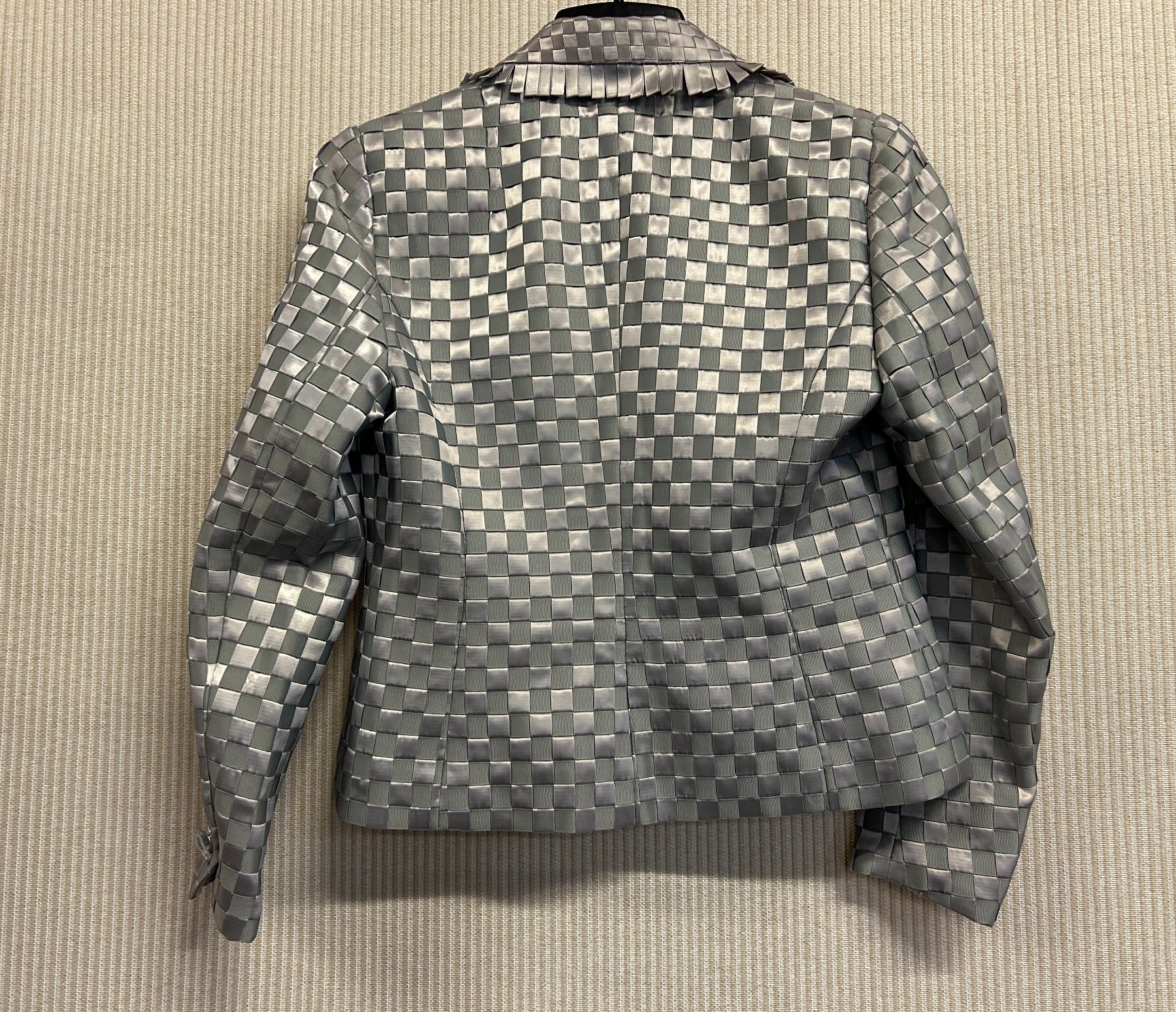 Woven Lt. Gray/Silver Button-Front Jacket, No Tag. Has Minor Surface Wear in various areas, as shown in the pictures. Woven Lt. Gray/Silver Button-Front Jacket, No Tag (Has Minor Surface Wear). Medium or Large