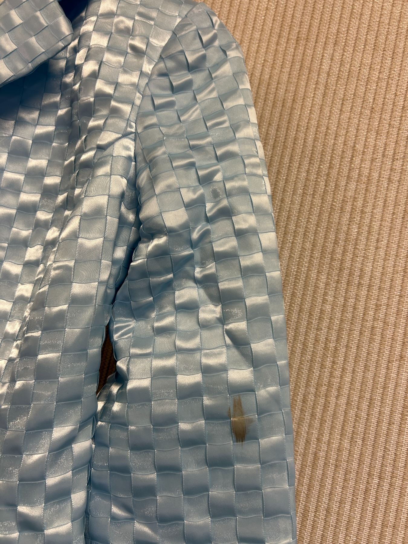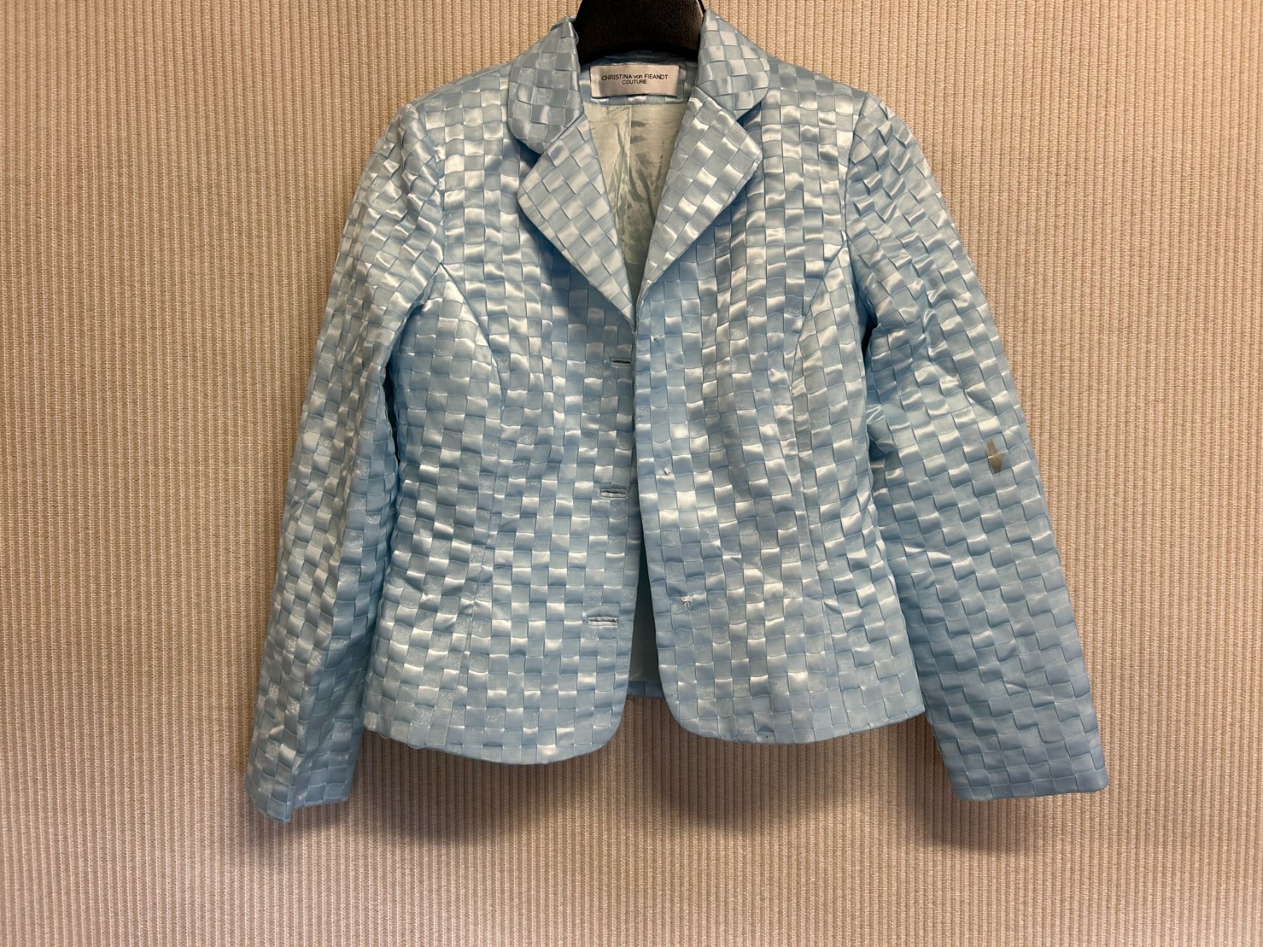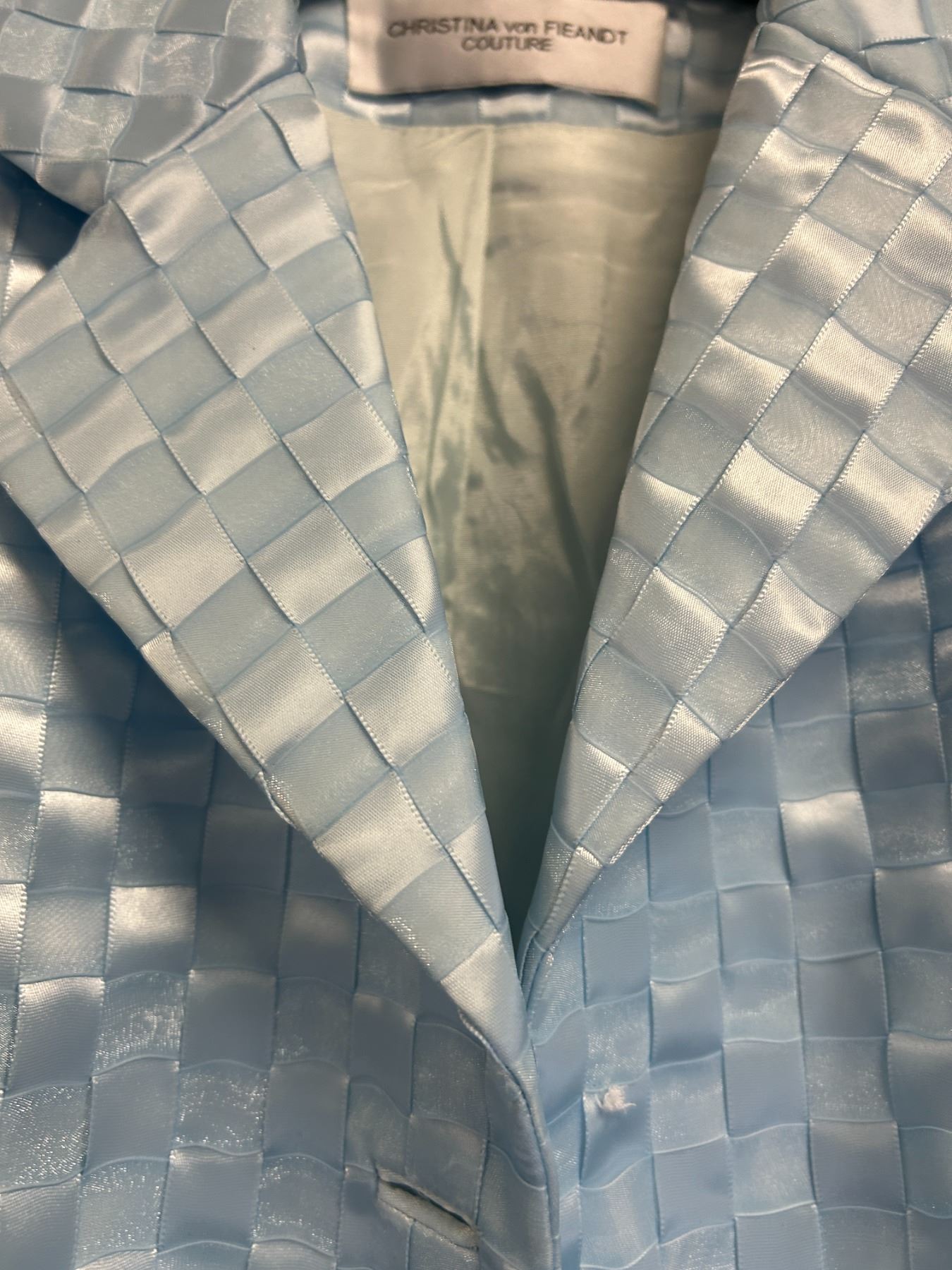 Christina von Fieandt Woven Powder Blue Satin and Chiffon Jacket, No Tag, Missing Buttons (Small Stain).