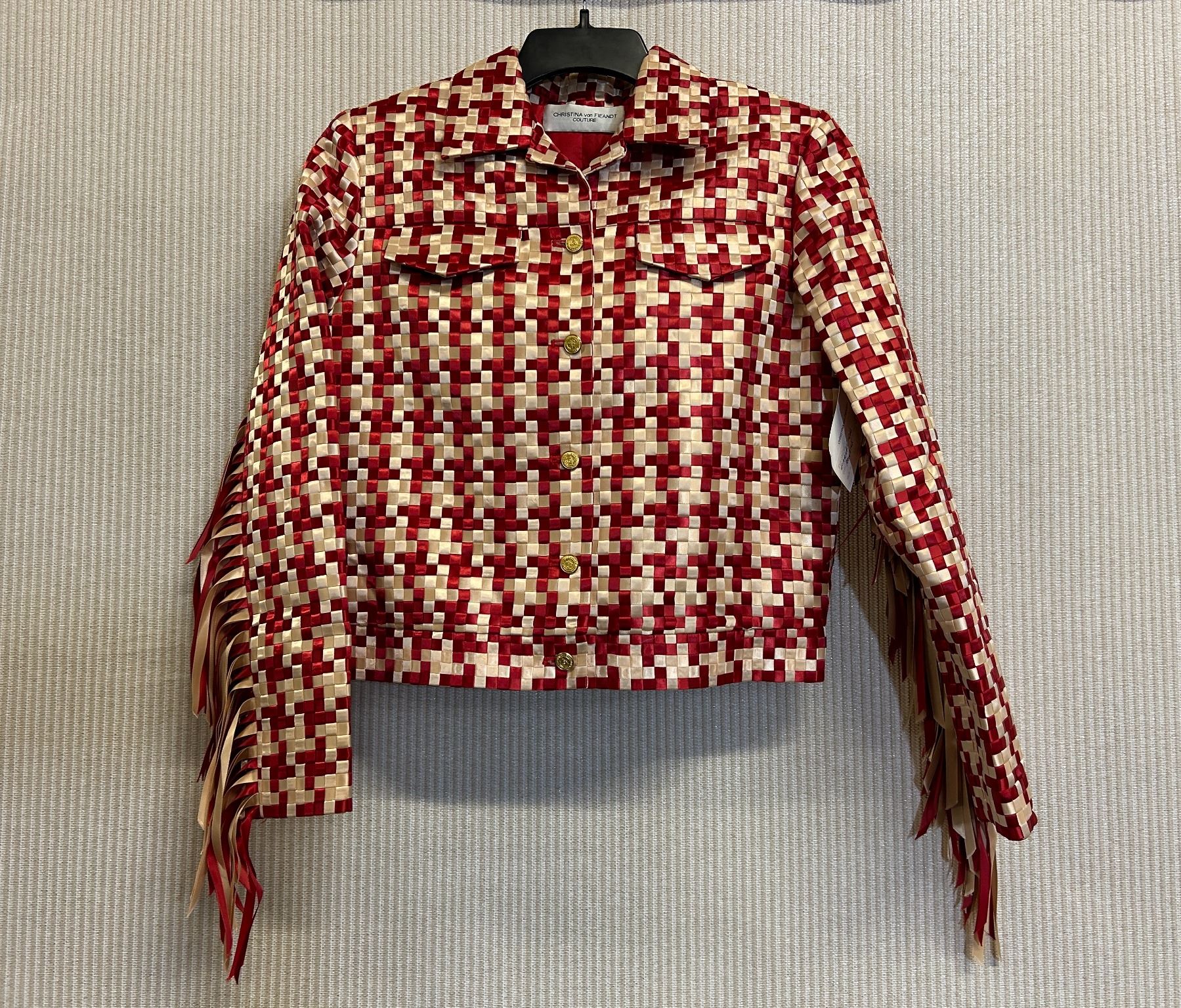 Christina von Fieandt Woven Scarlet-Gold Jacket w/ Hawaii Buttons, Size S, New with Tag (retail $1500). Fringed arms. Lined. Vibrant tones.