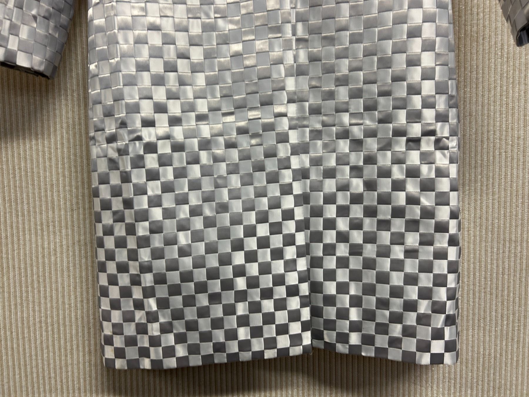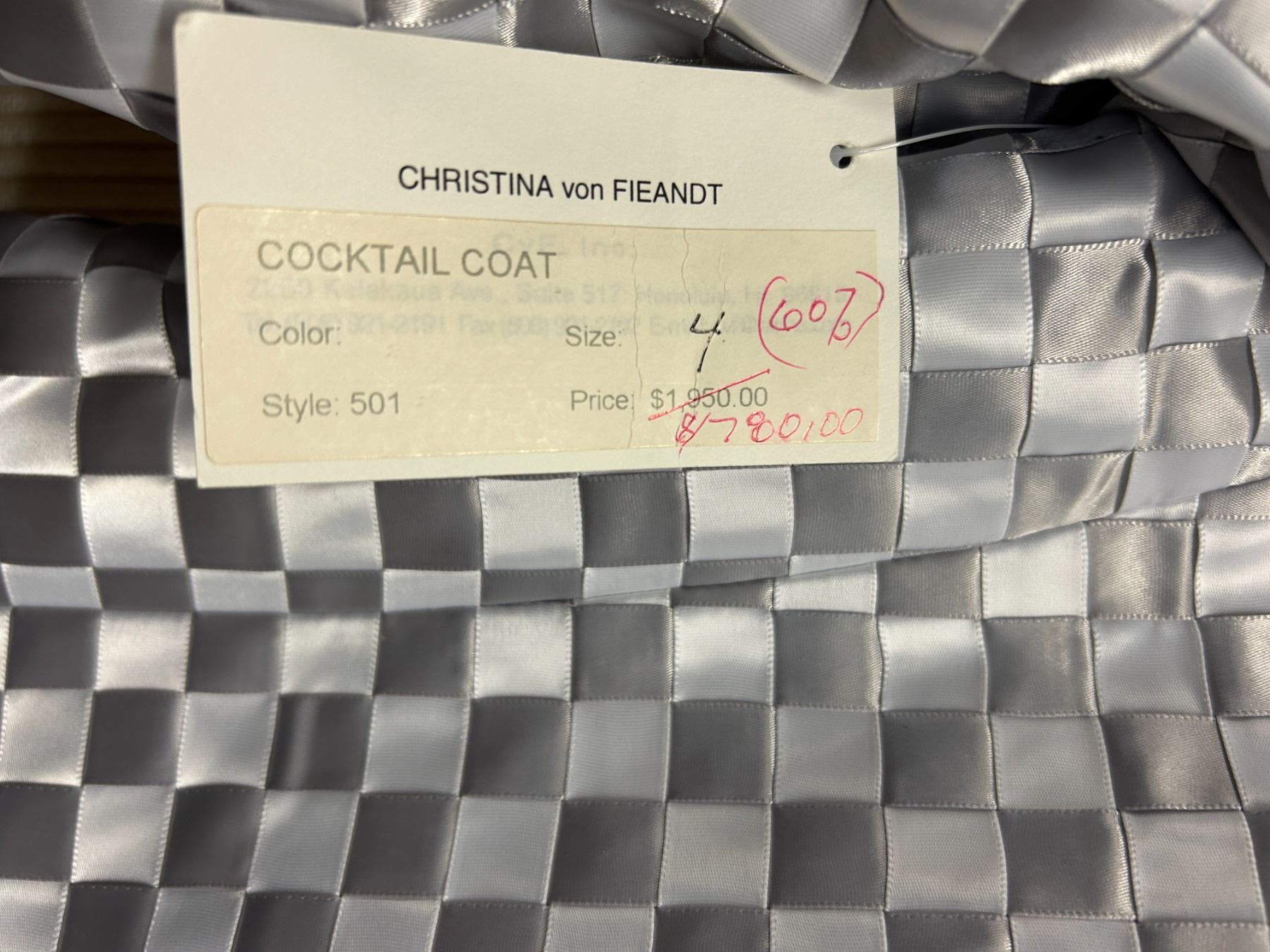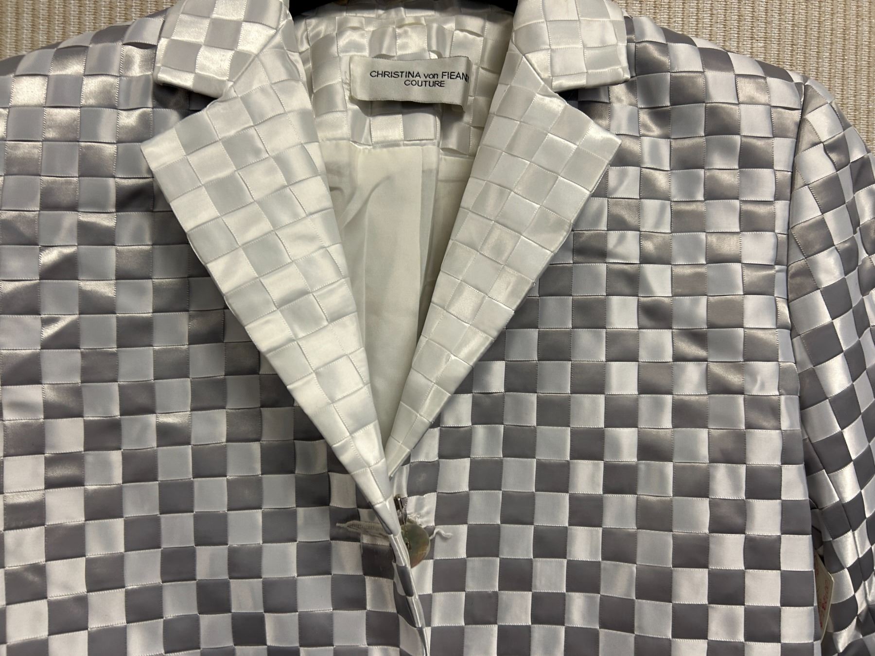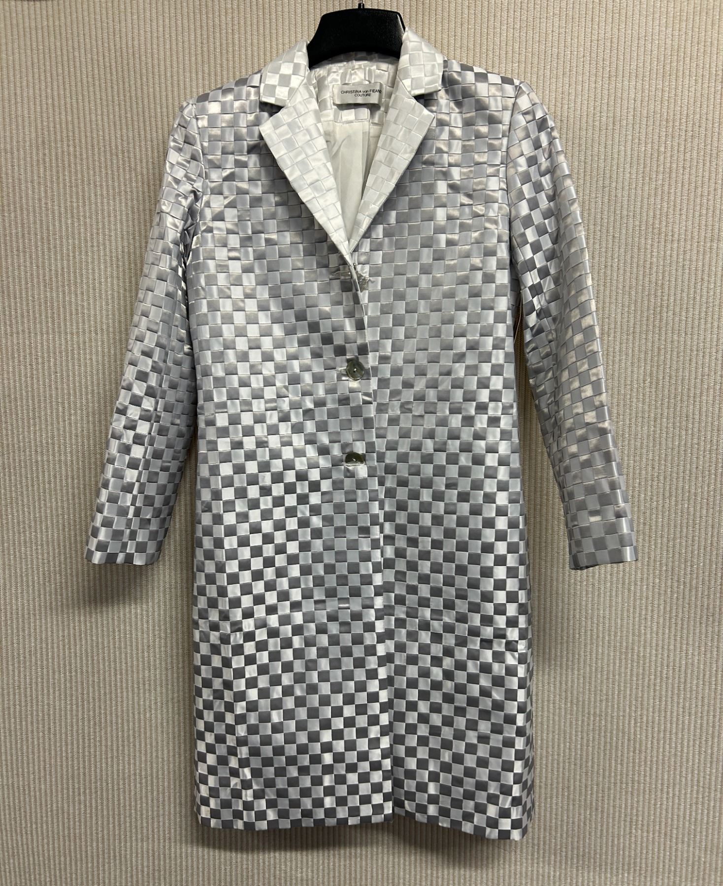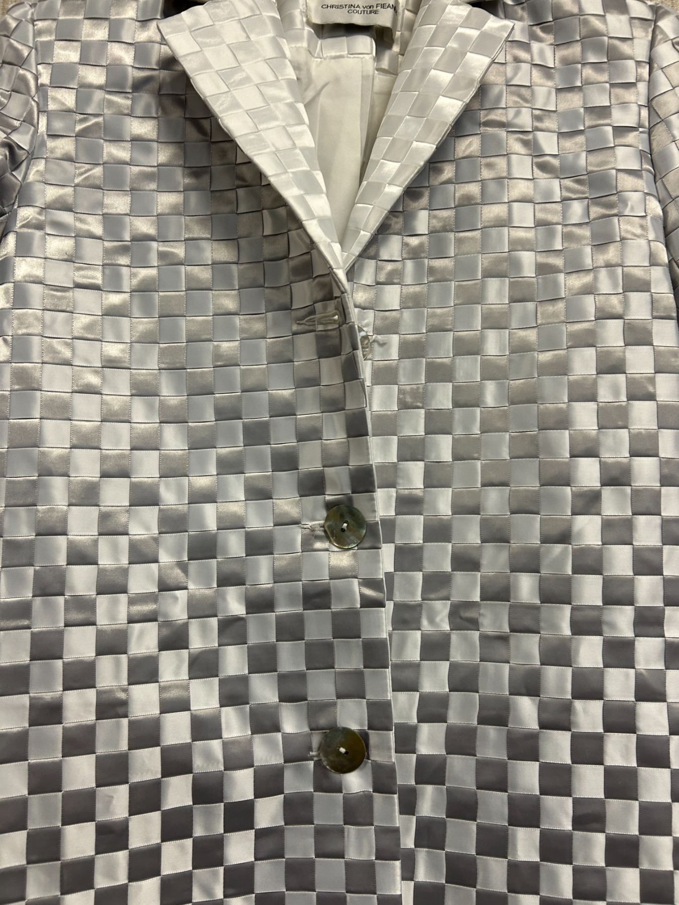 Christina von Fieandt Woven Silver Satin Cocktail Coat, Size 4, New with Tag (Retail $1950). Variations of light gray and dark gray ribbons.