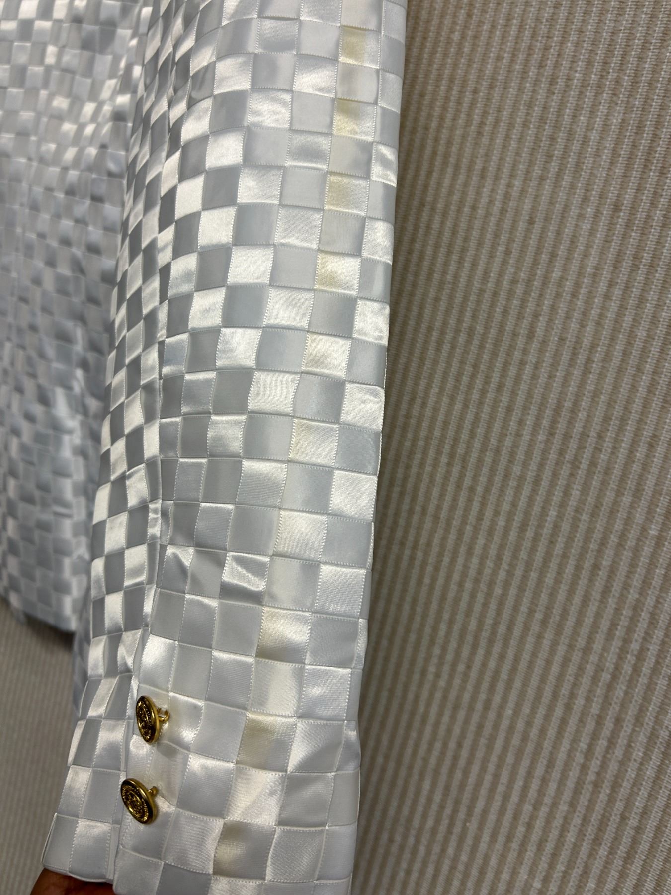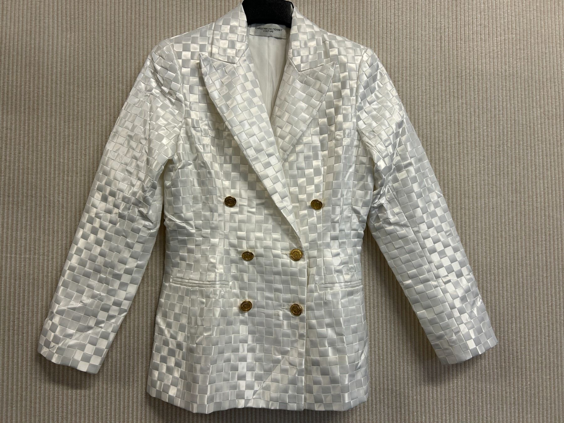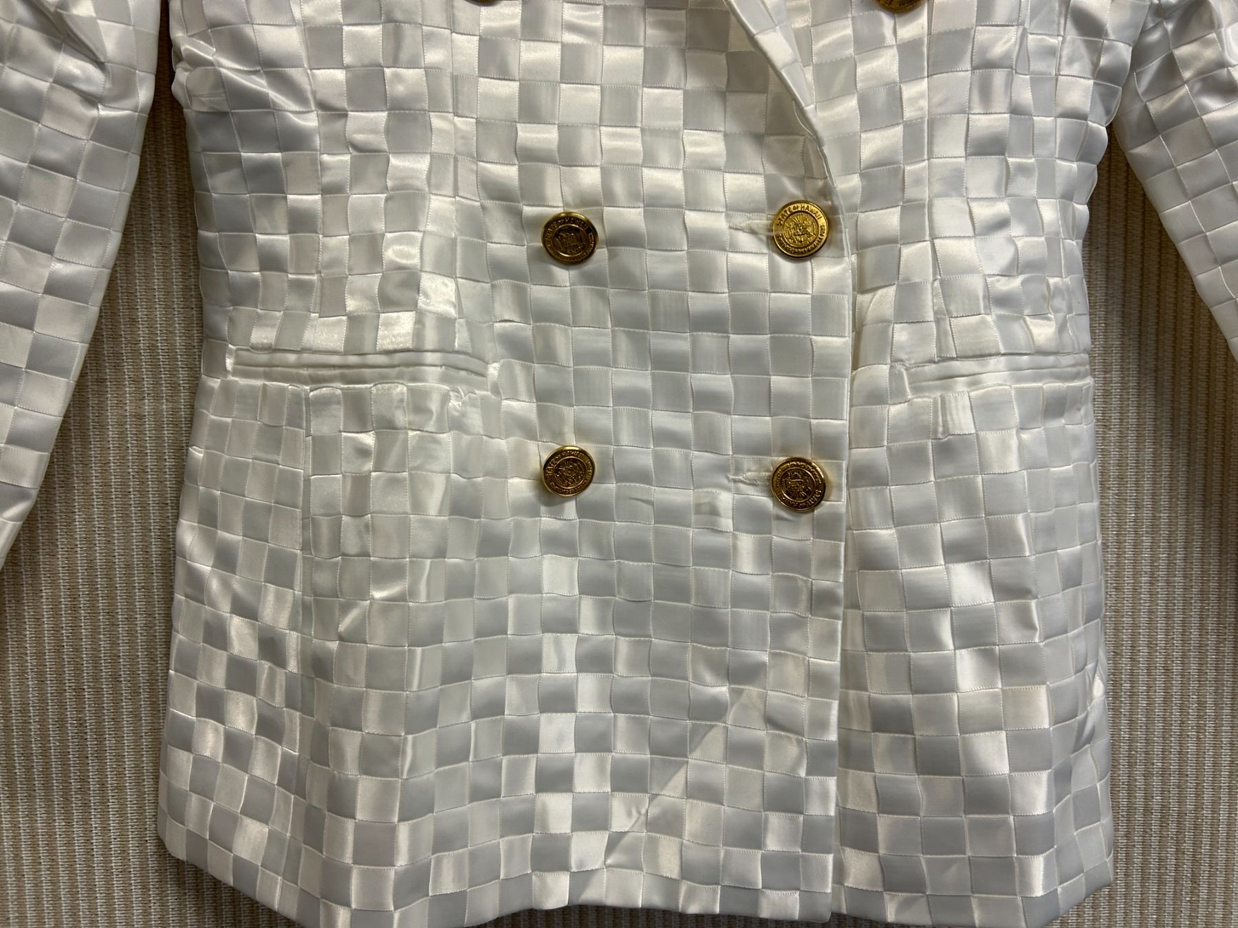 Christina von Fieandt Woven Solid Double Button Blazer - Satin, White, Size 8, New with Tag (retail $1650)(faint stains)