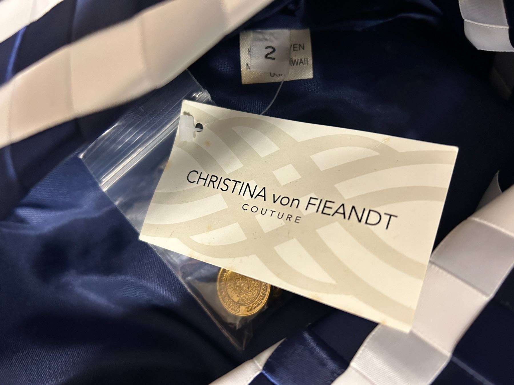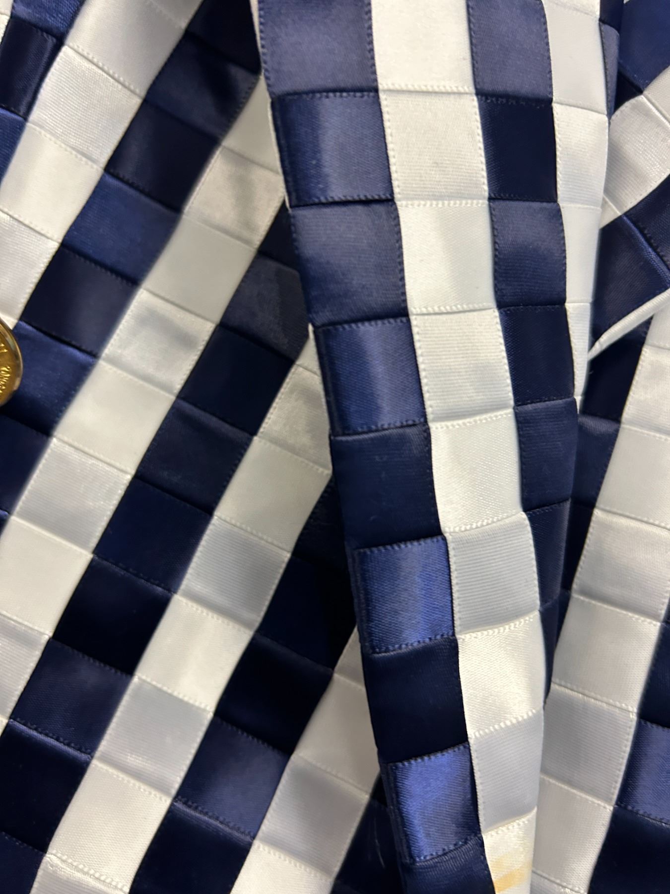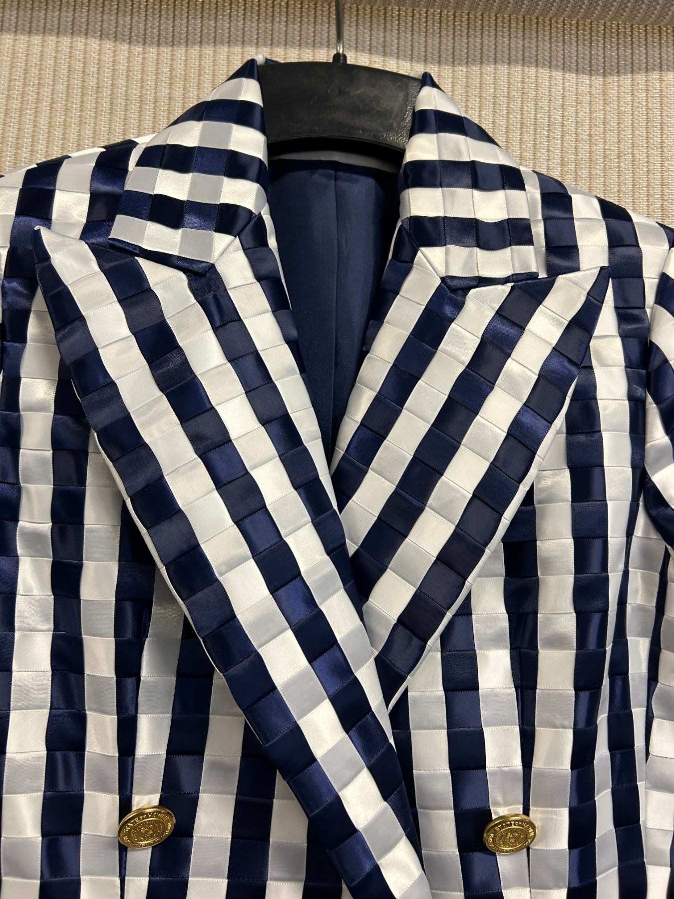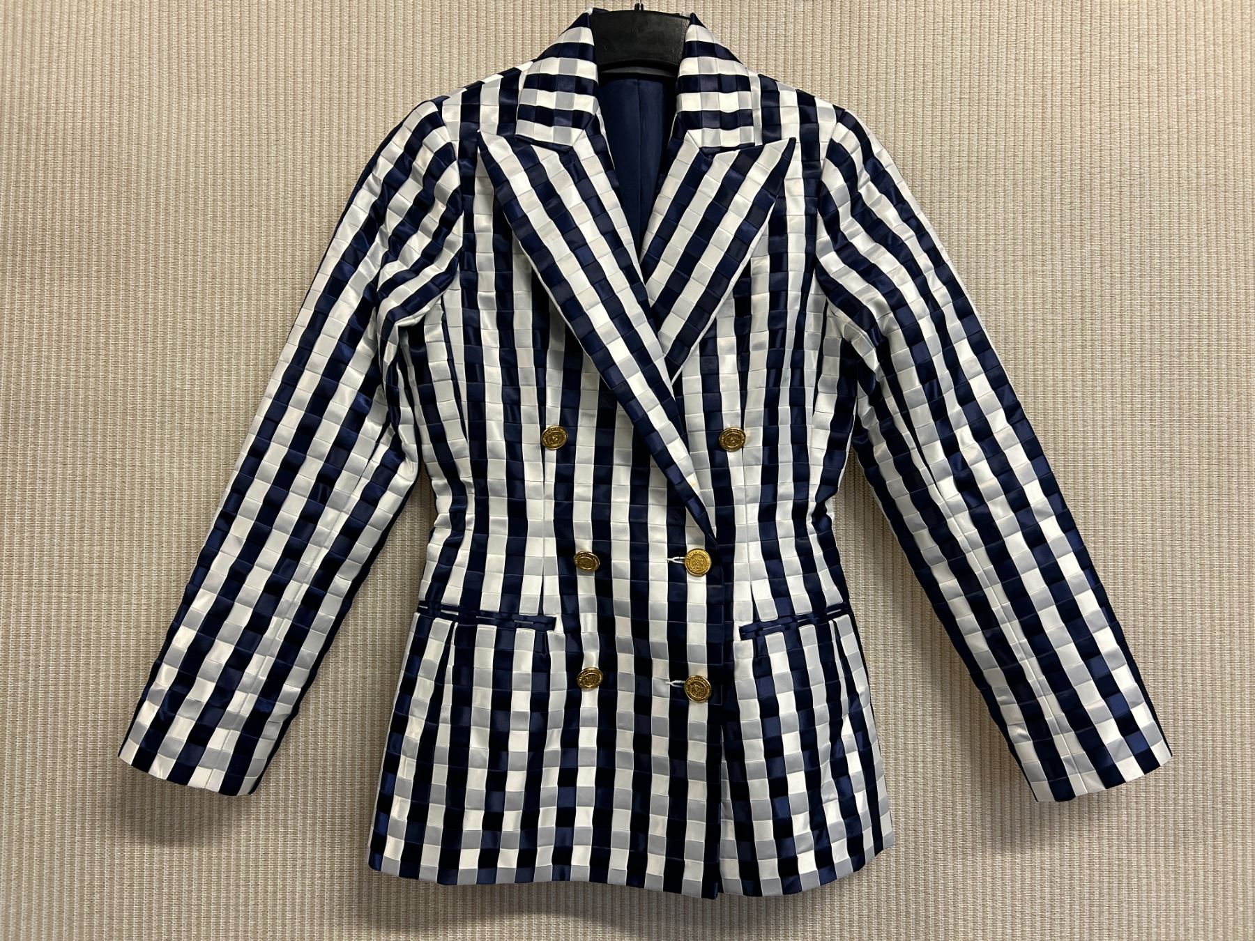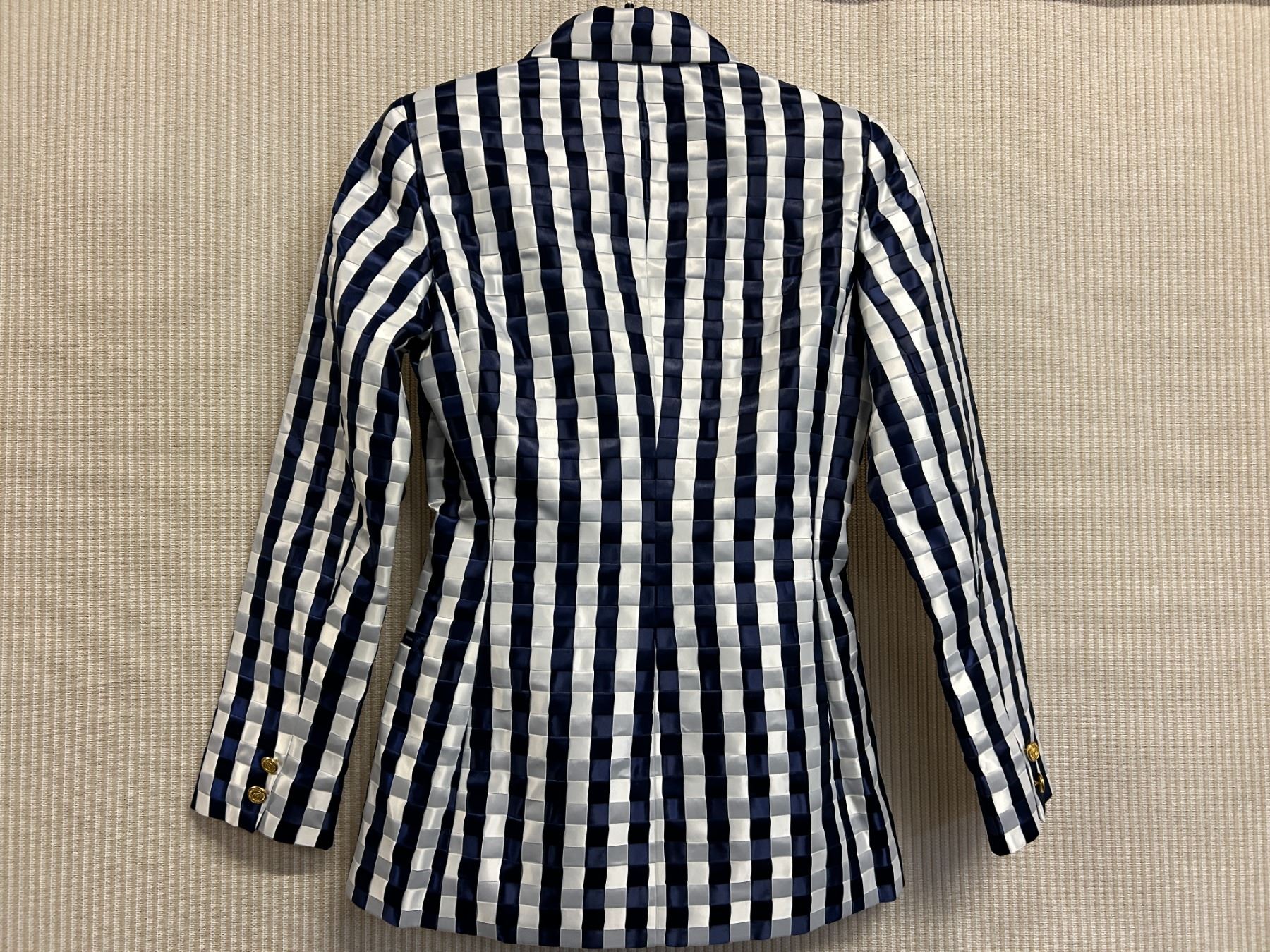 Christina von Fieandt Woven Striped Double Button Blazer - Satin, Navy & White, Size 2, New with Tag (retail $1650)(faint stains)