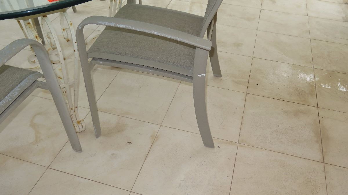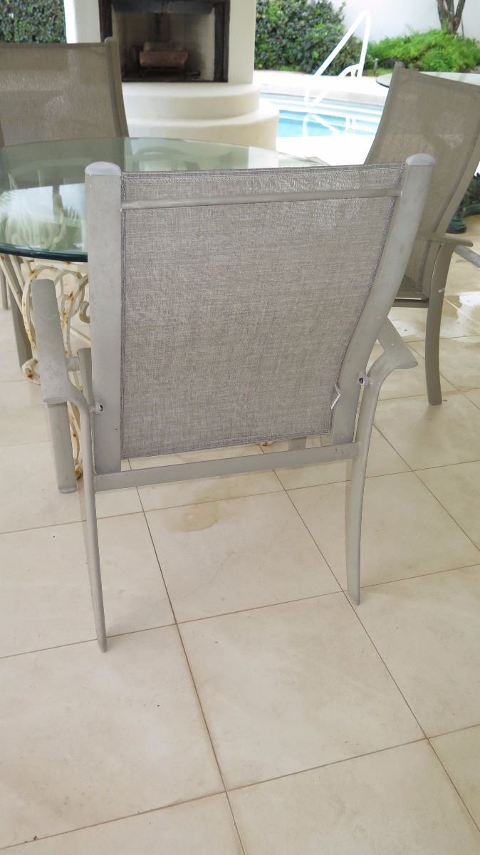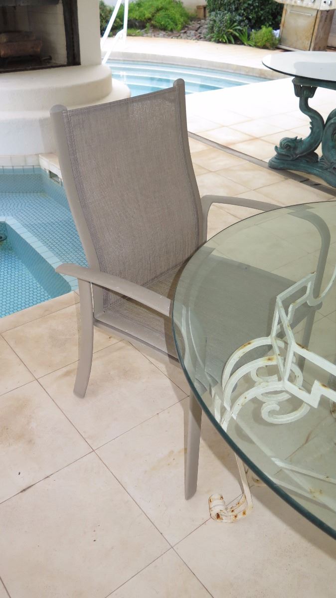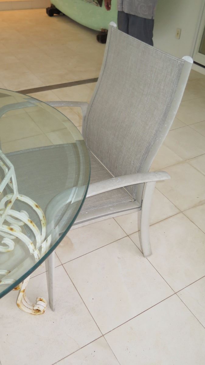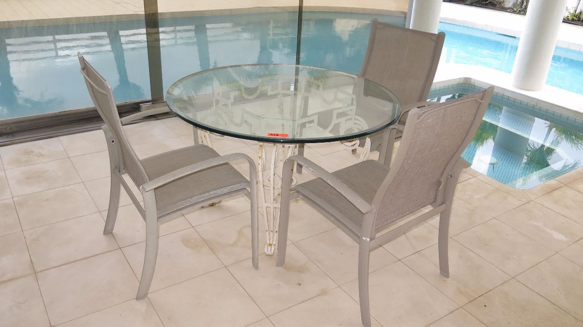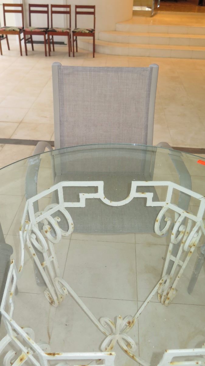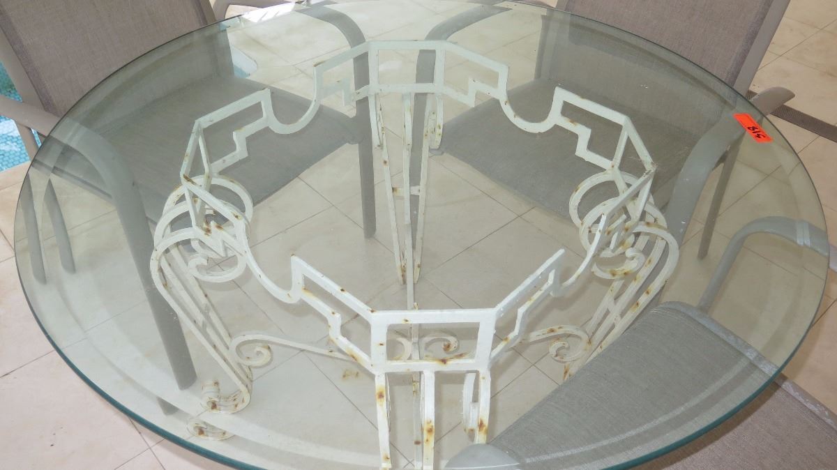 Wrought Iron Painted Table Base w/Round Glass Table Top & 3 Patio Chairs 48" dia, 29" H