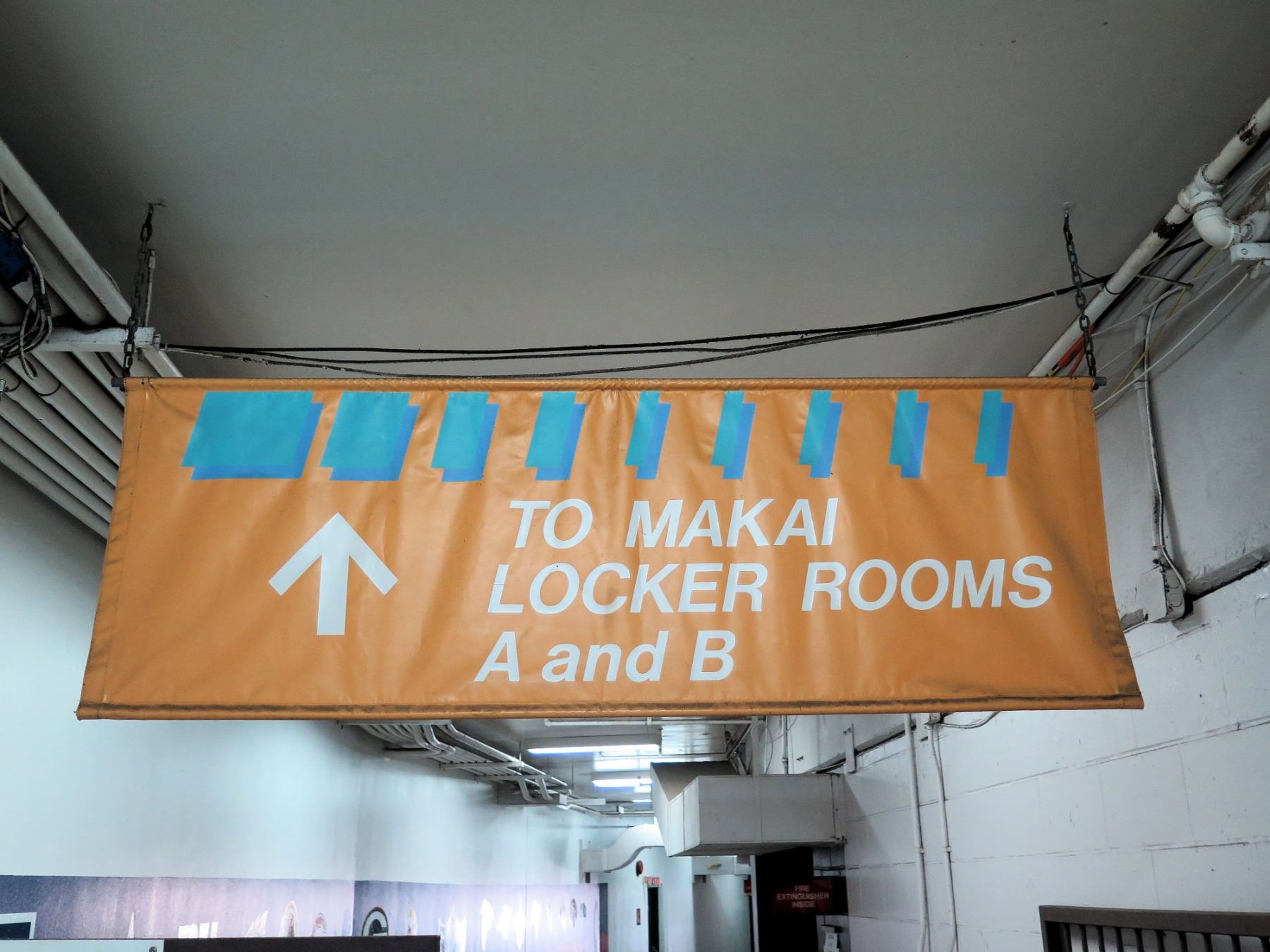 Yellow 'To Makai Locker Rooms A and B' w/ Arrow Sign 99"x25". Note: Signs will be removed if hanging prior to pick up